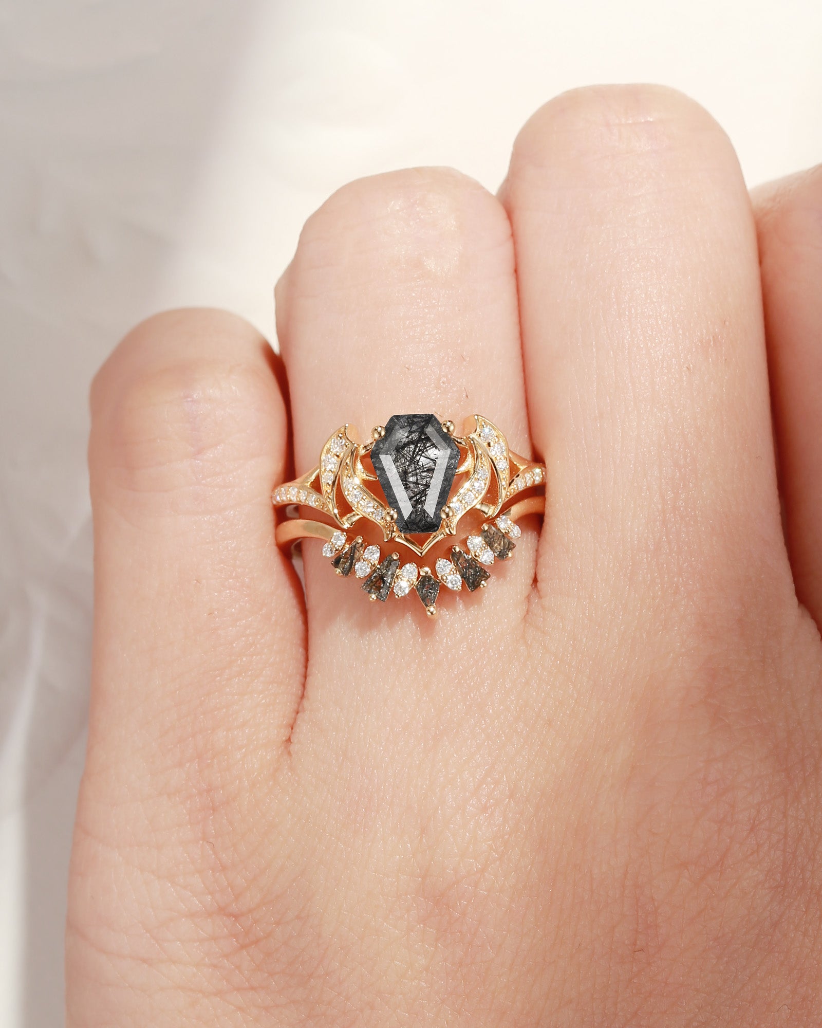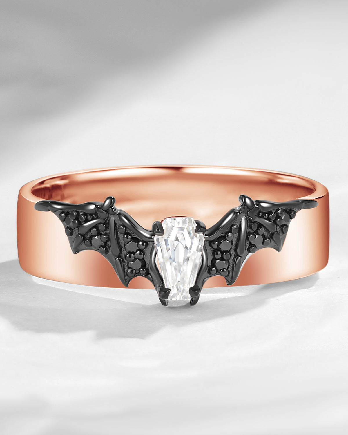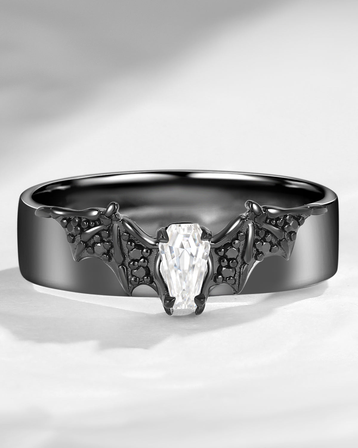 Non-Traditional Coffin Moissanite Vampire Black Gold Ring Set 2pcs - Bat Ring
