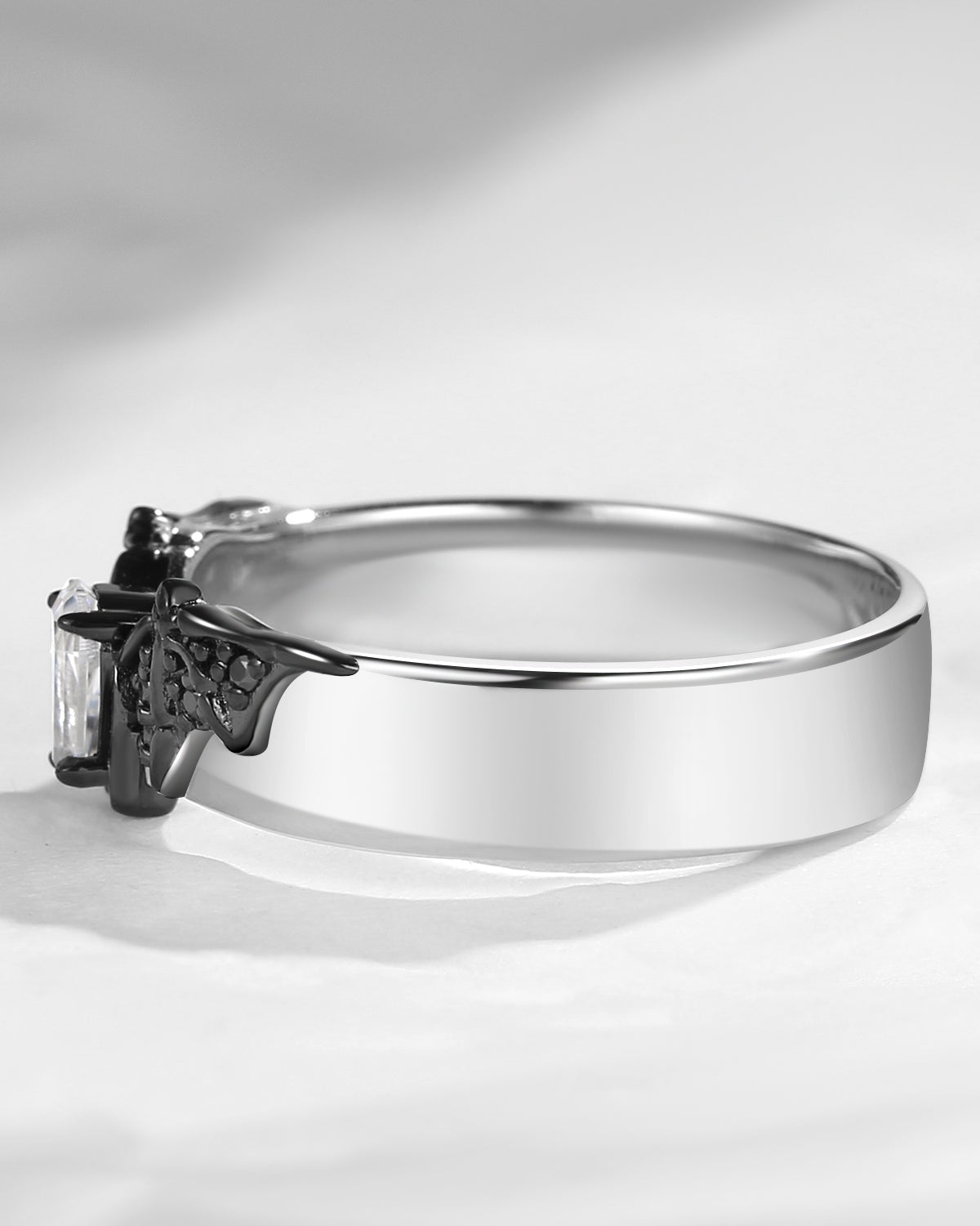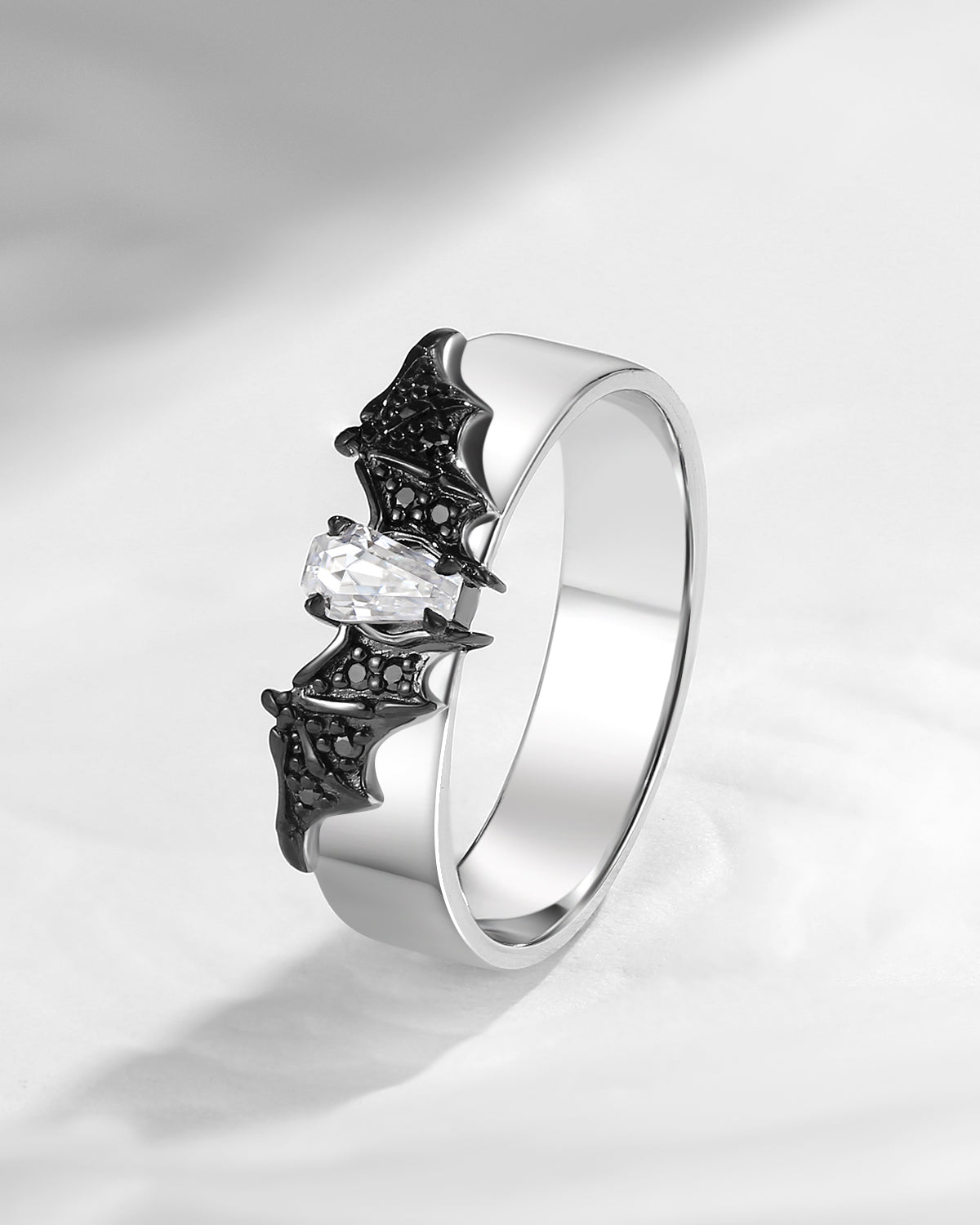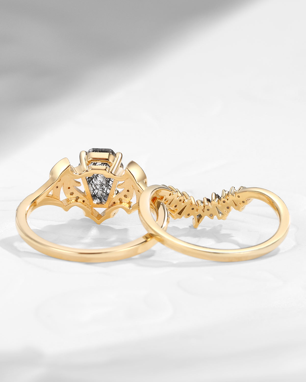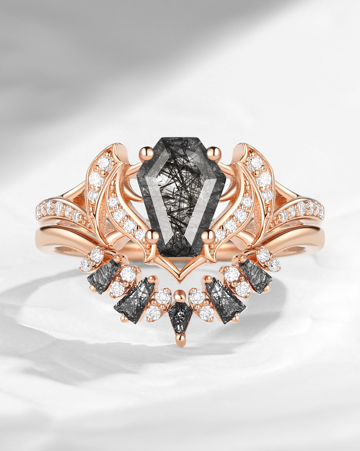 Non-Traditional Coffin Moissanite Vampire Black Gold Ring Set 2pcs - Bat Ring