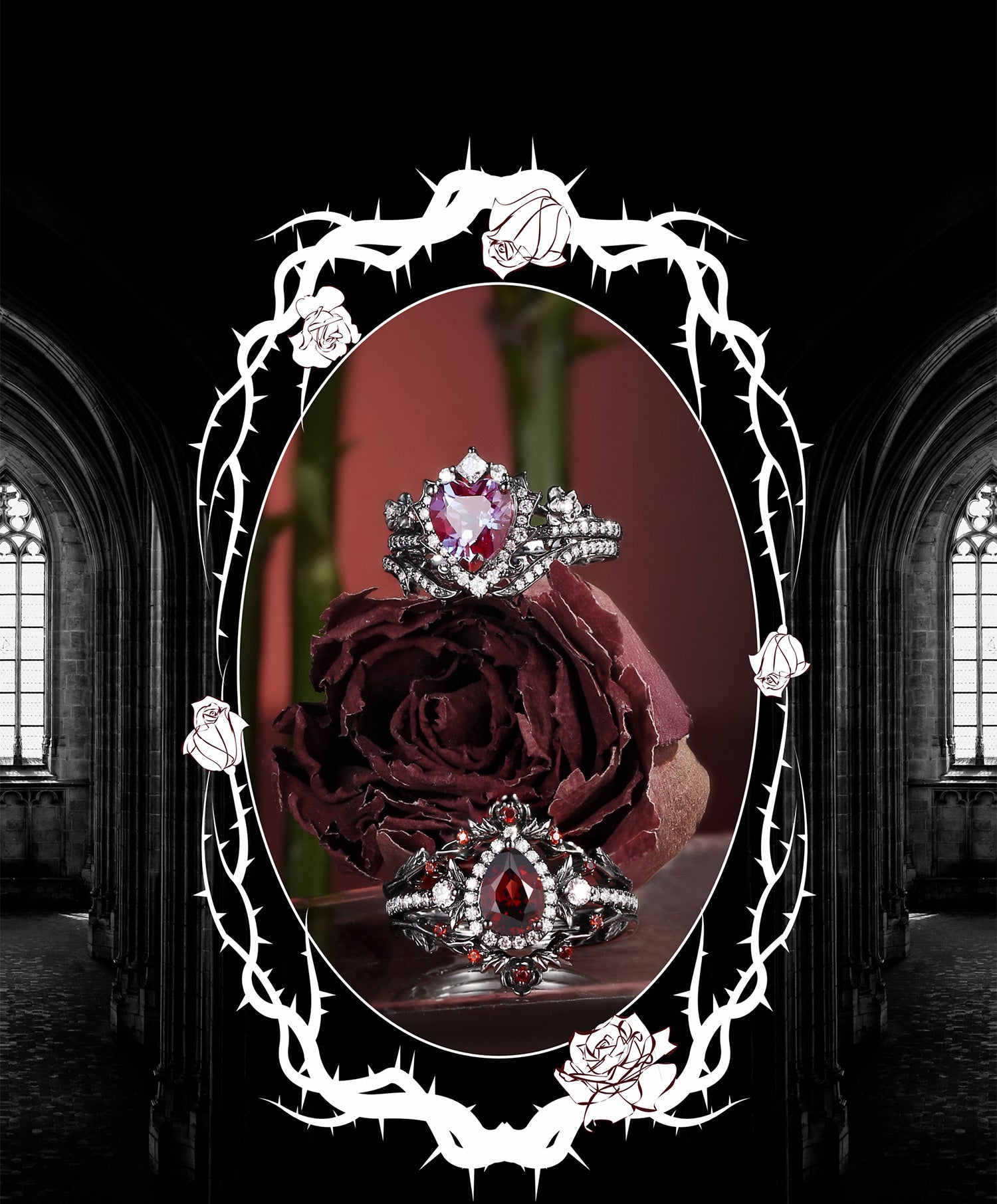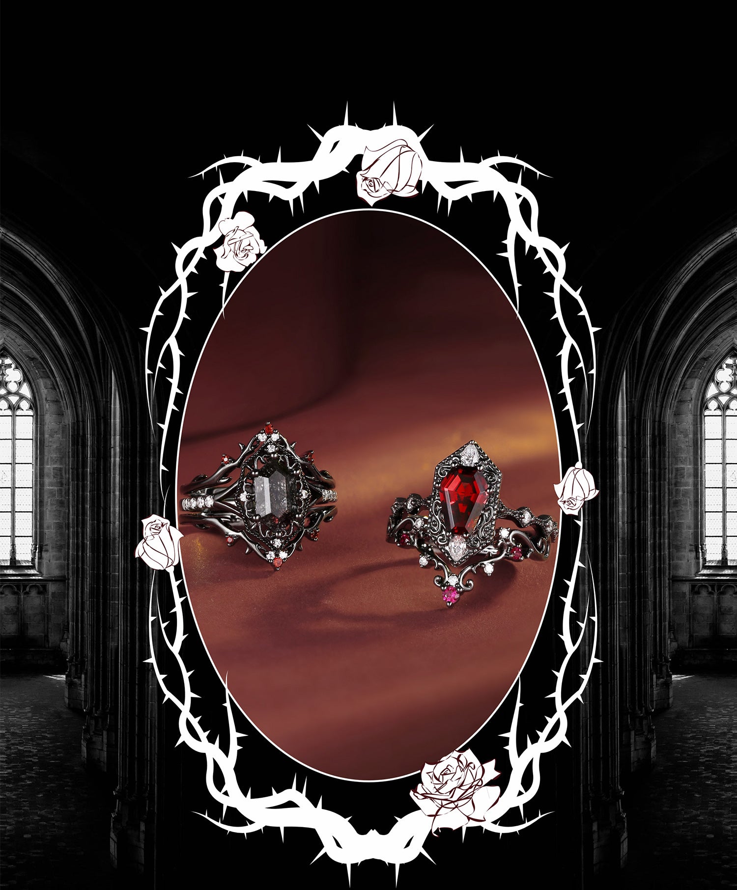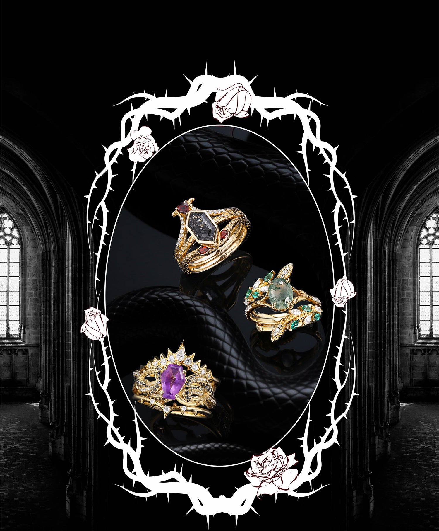 The "Garden of Eden” collection is a rebellion: thorns embrace center stones, gem clusters bloom asymmetrically, and every scratch whispers obsession, serpentine vines coil like lovers’ secrets, cradling diamonds and rubies that smolder with forbidden fire. Here, eternal love is not a sacrament. It is a craving carved in metal.
