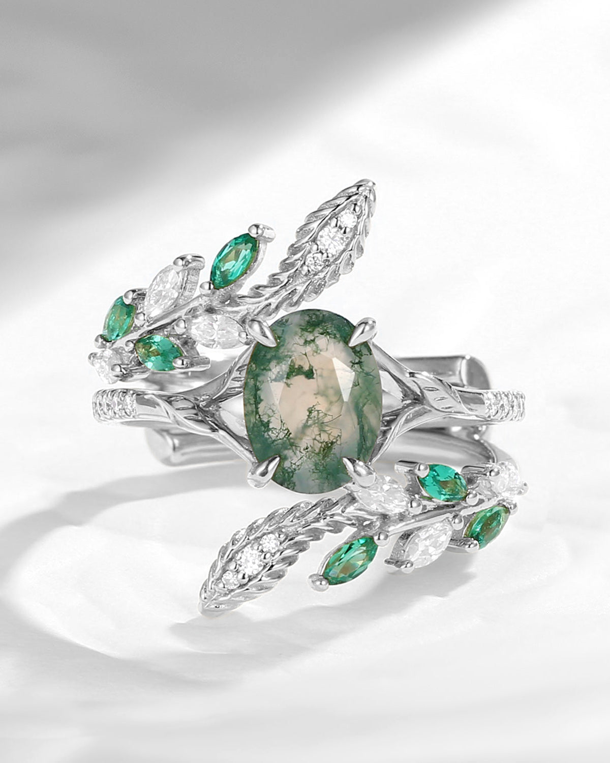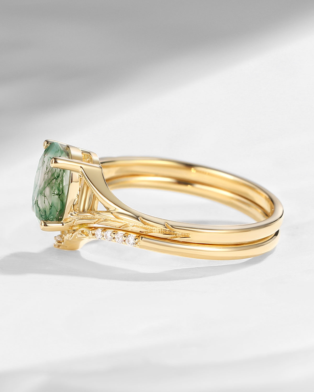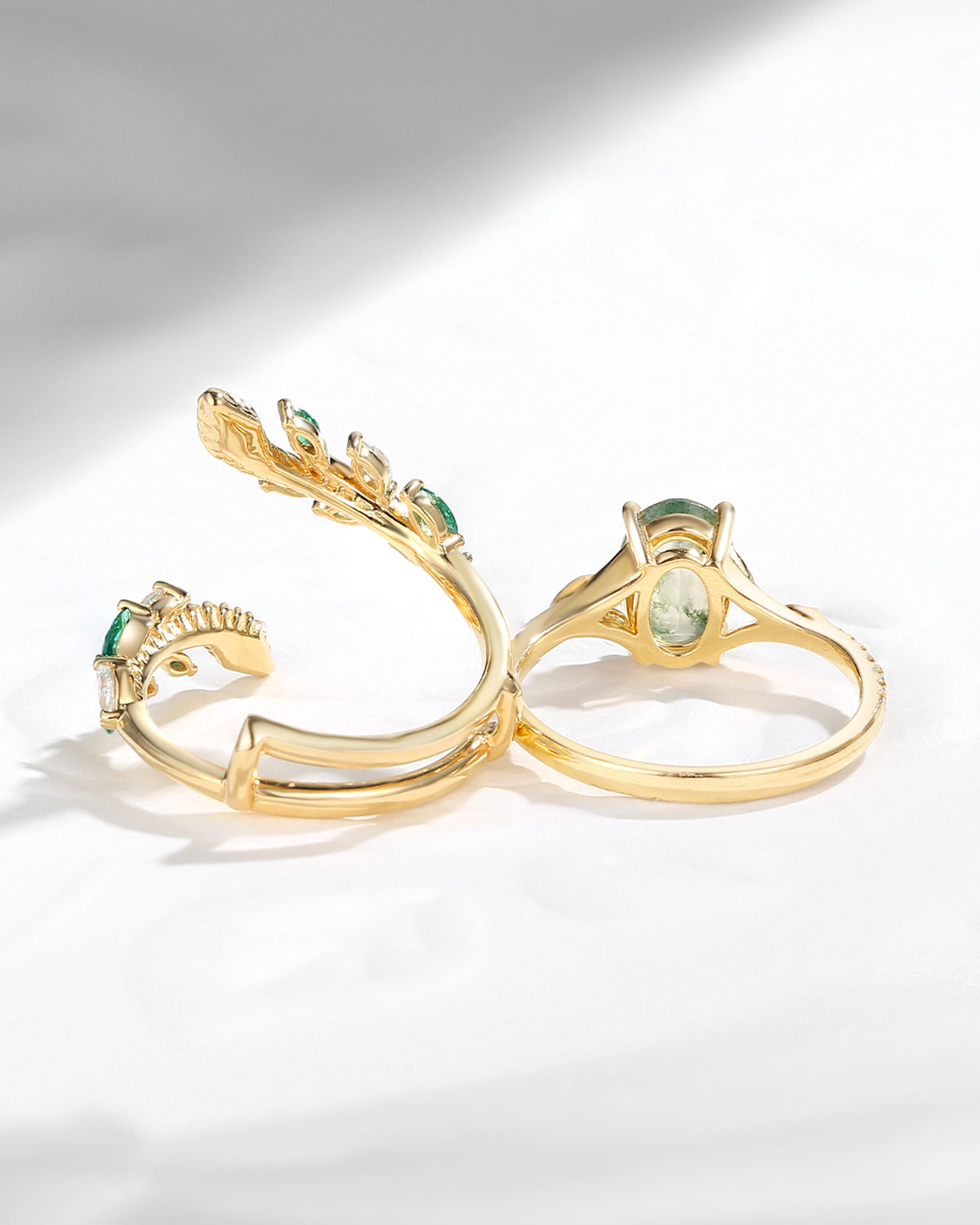 Unique Twist Oval Cut Moss Agate Nature Inspired Engagement Ring Set 2pcs