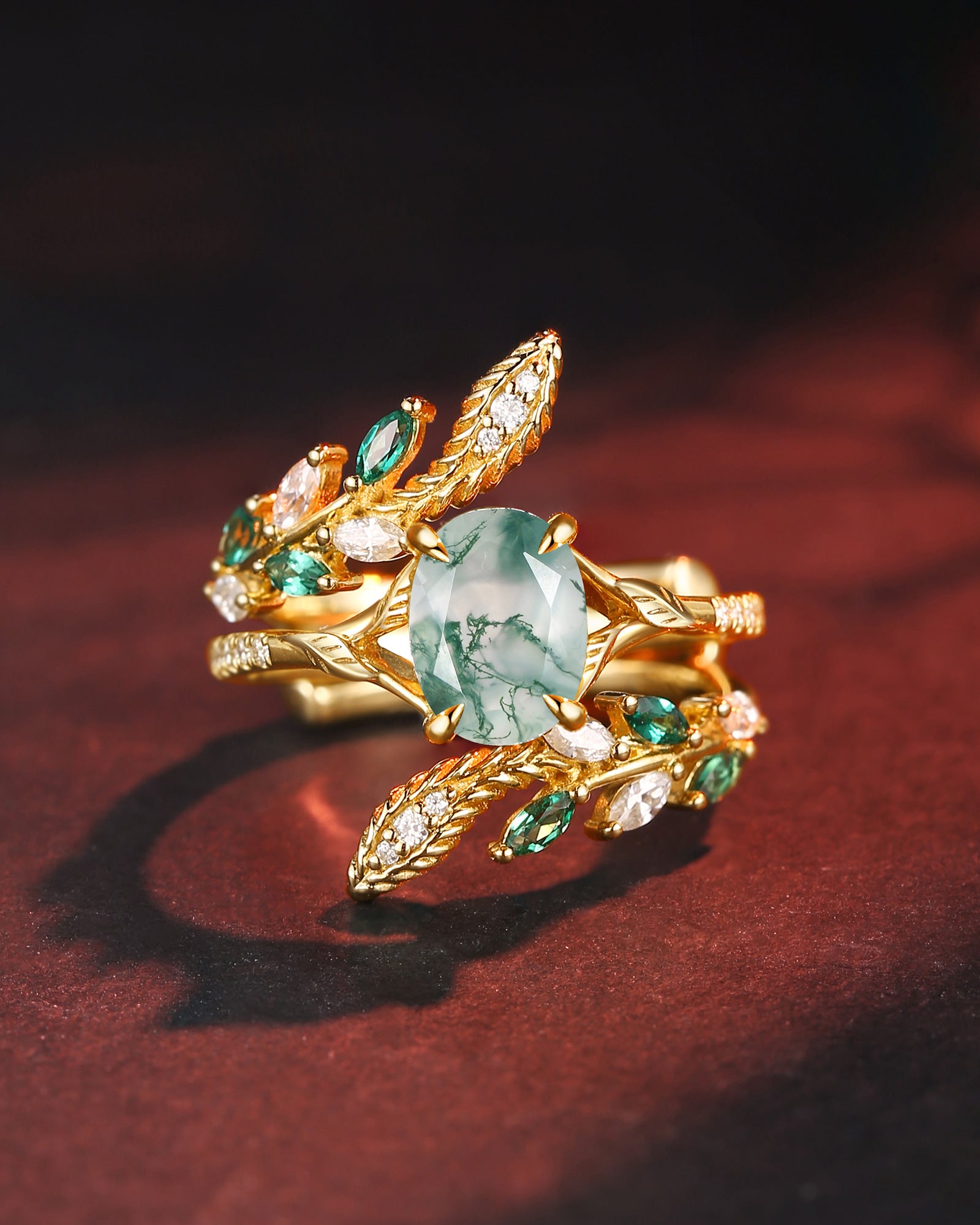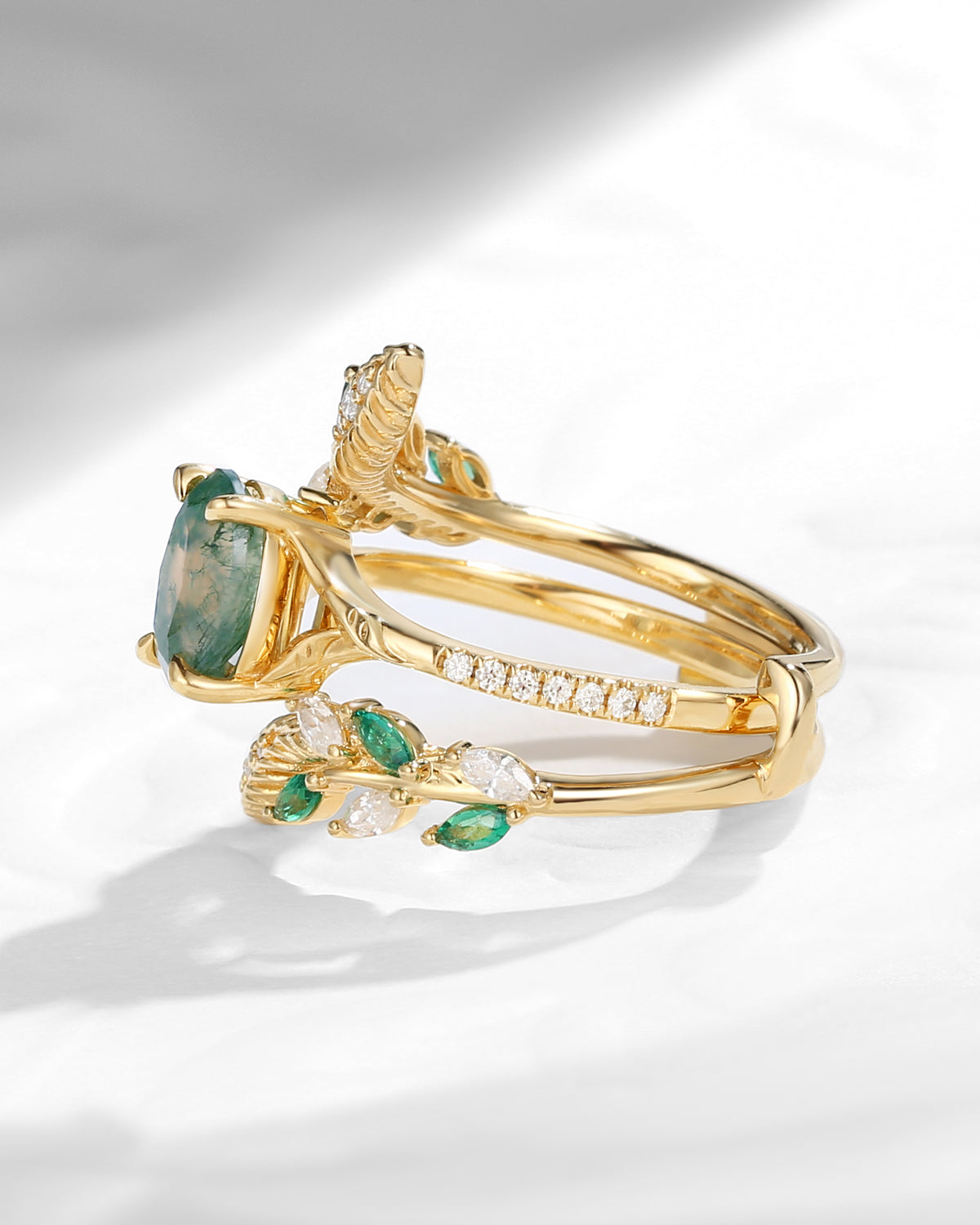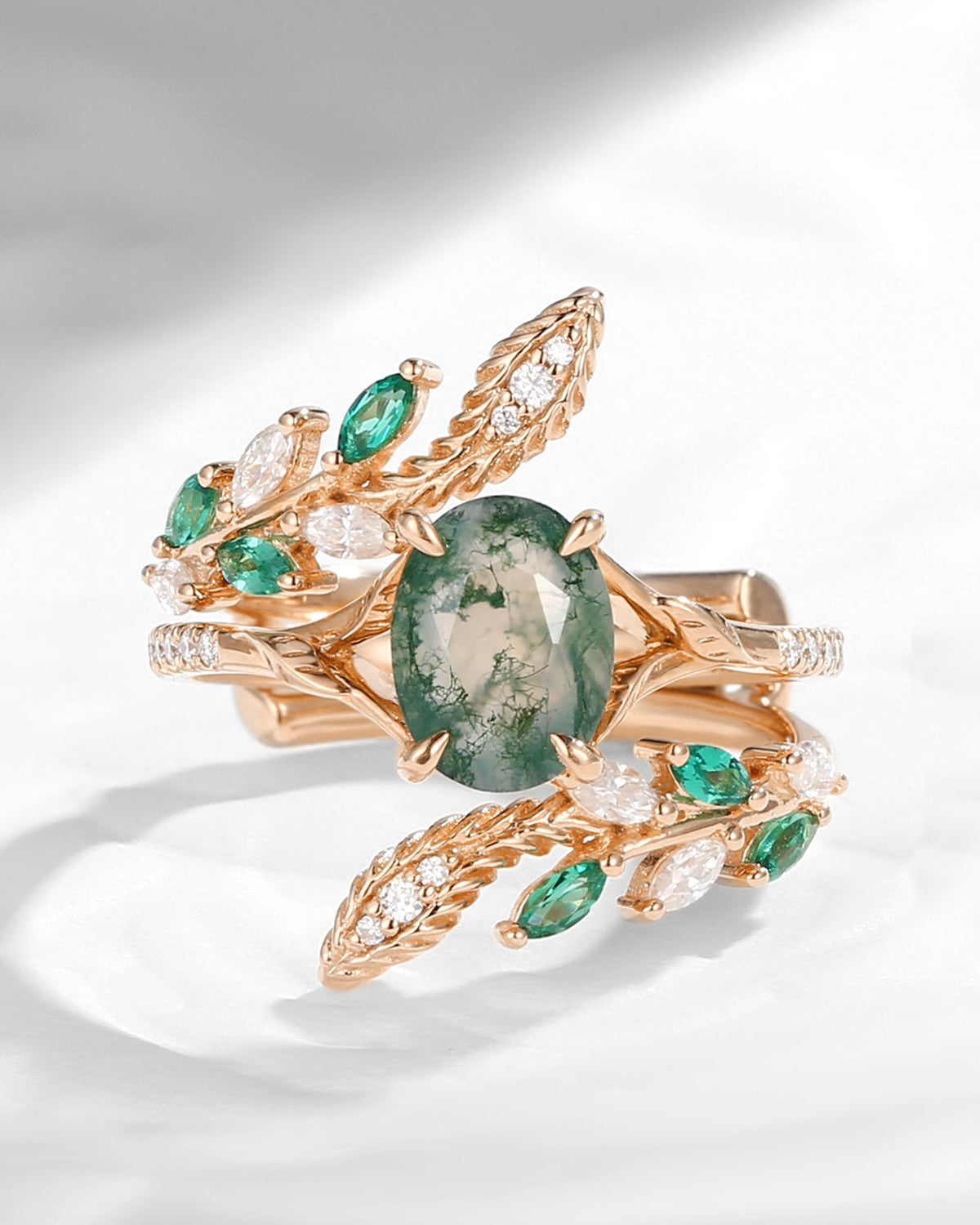 Unique Twist Oval Cut Moss Agate Nature Inspired Engagement Ring Set 2pcs