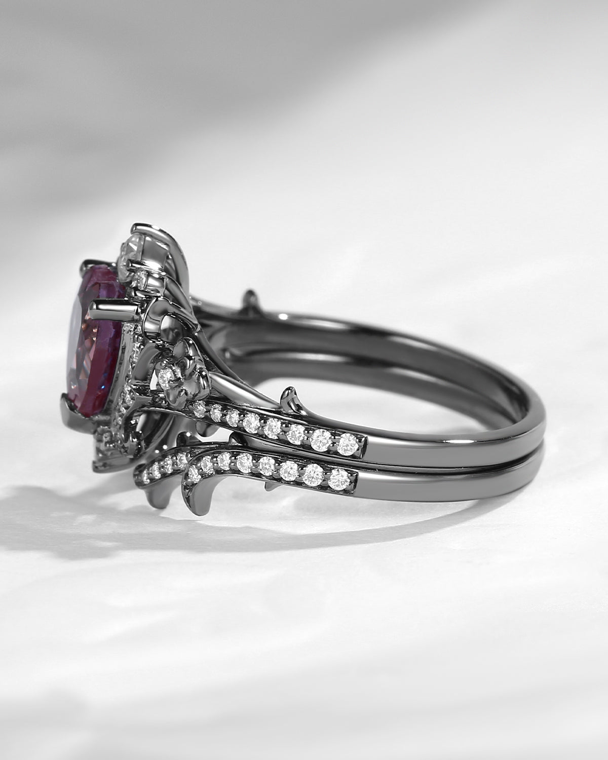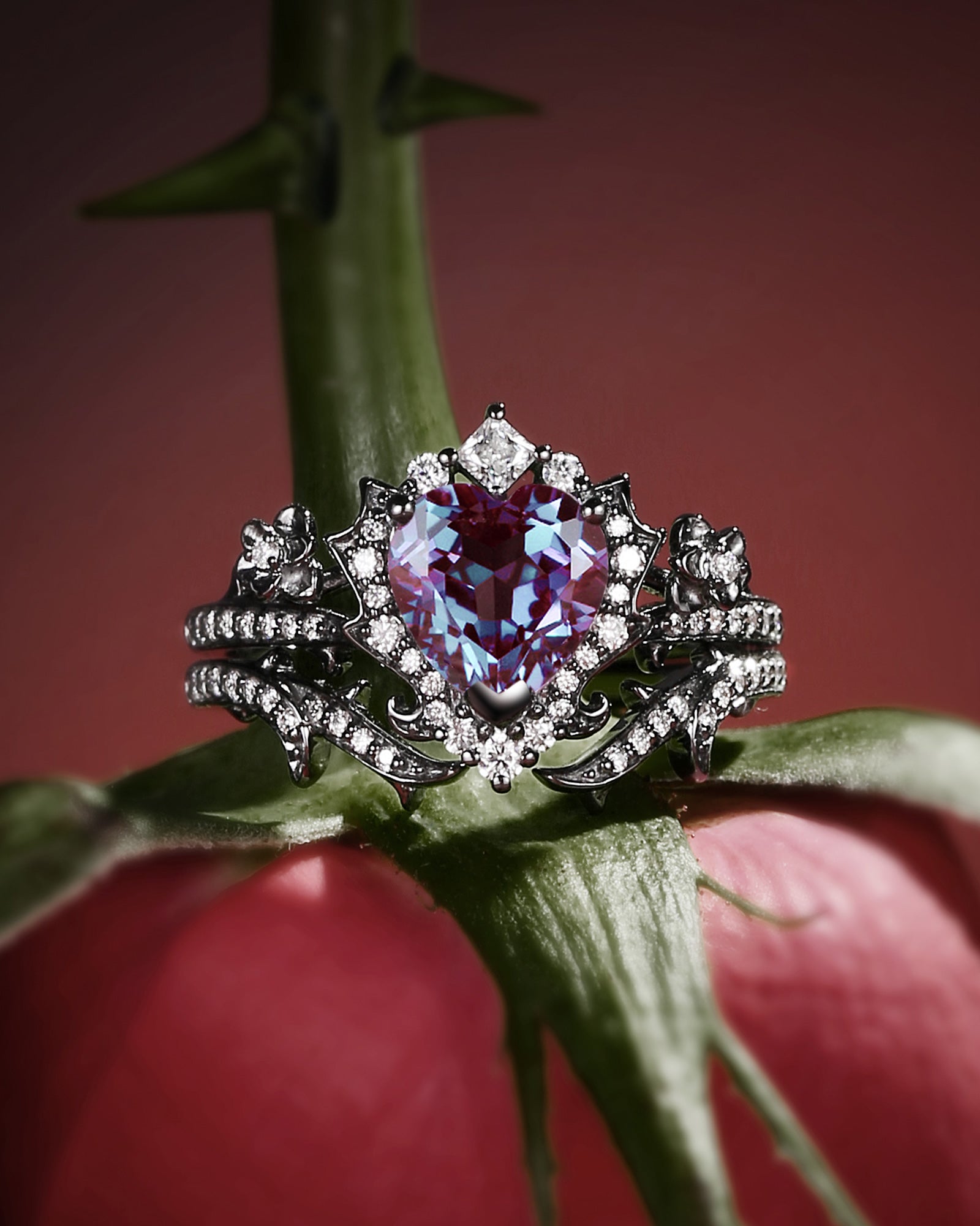 Gothic Style Coffin Lab Alexandrite Vine And Thorns Engagement Ring 2pcs