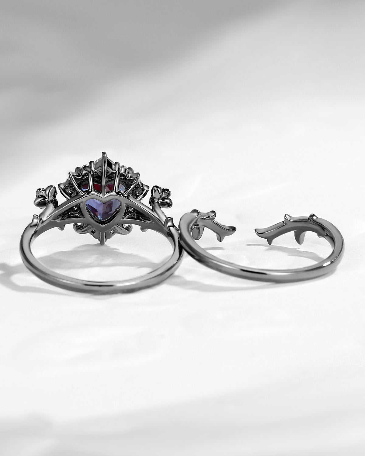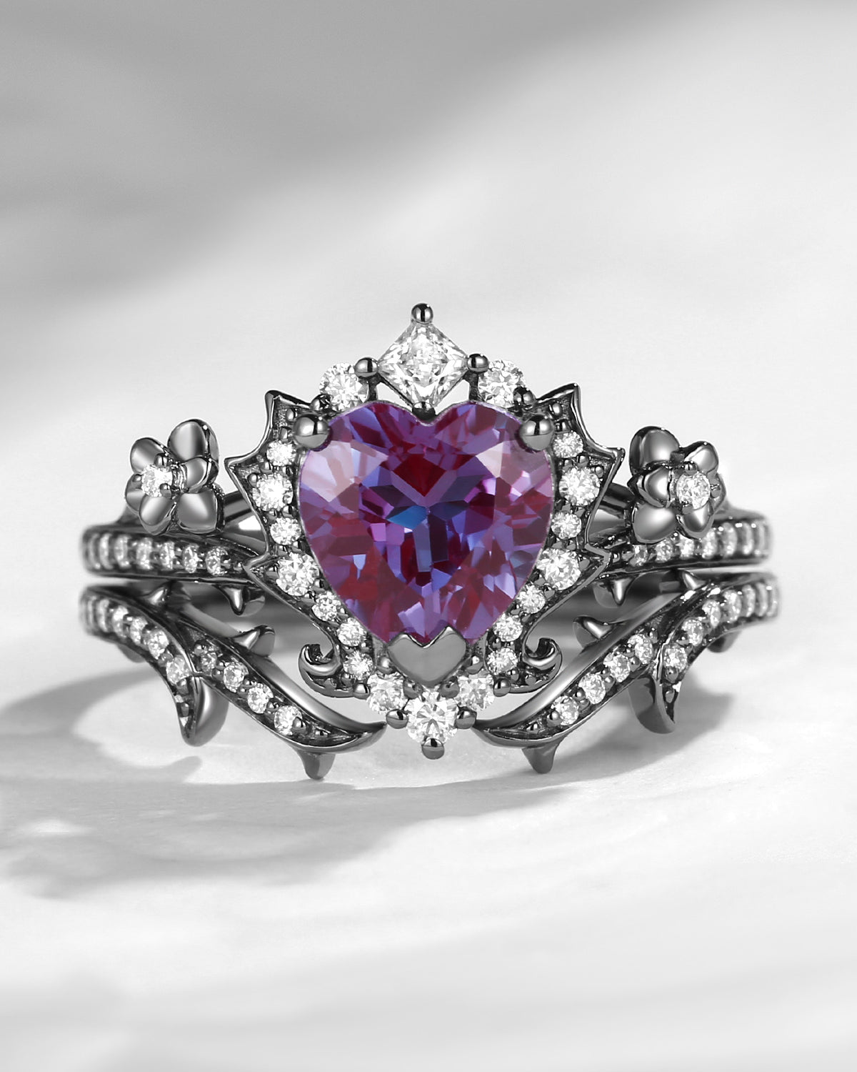 Halo Heart Shaped Lab Alexandrite Black Gold Flower Engagement Ring 2pcs Set