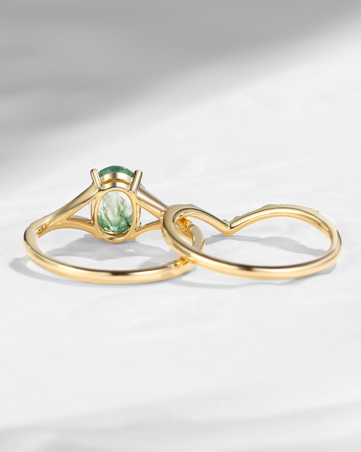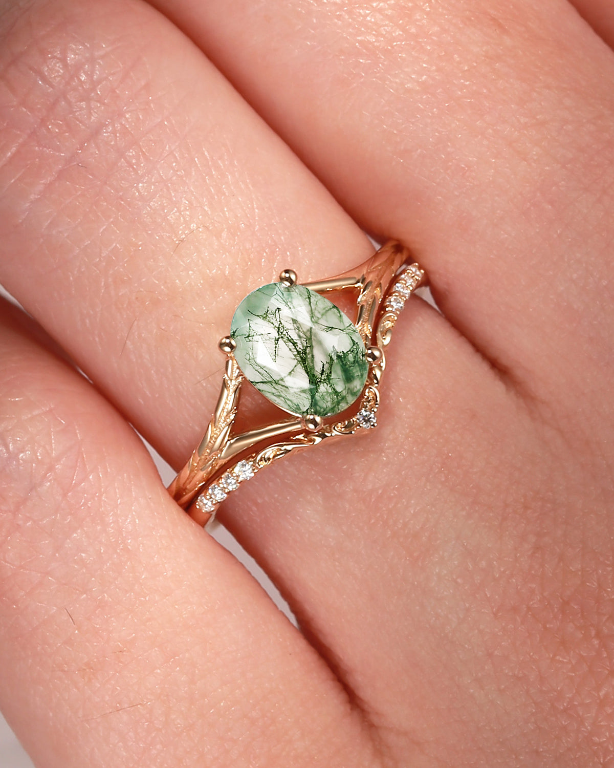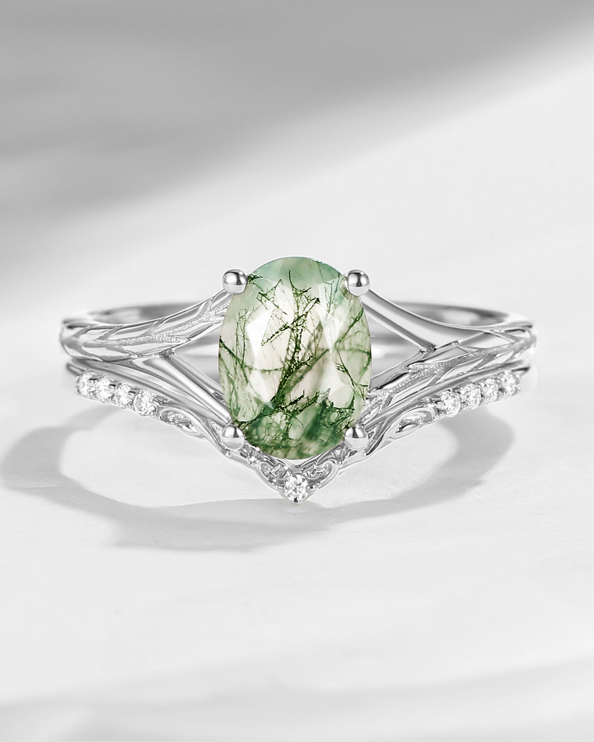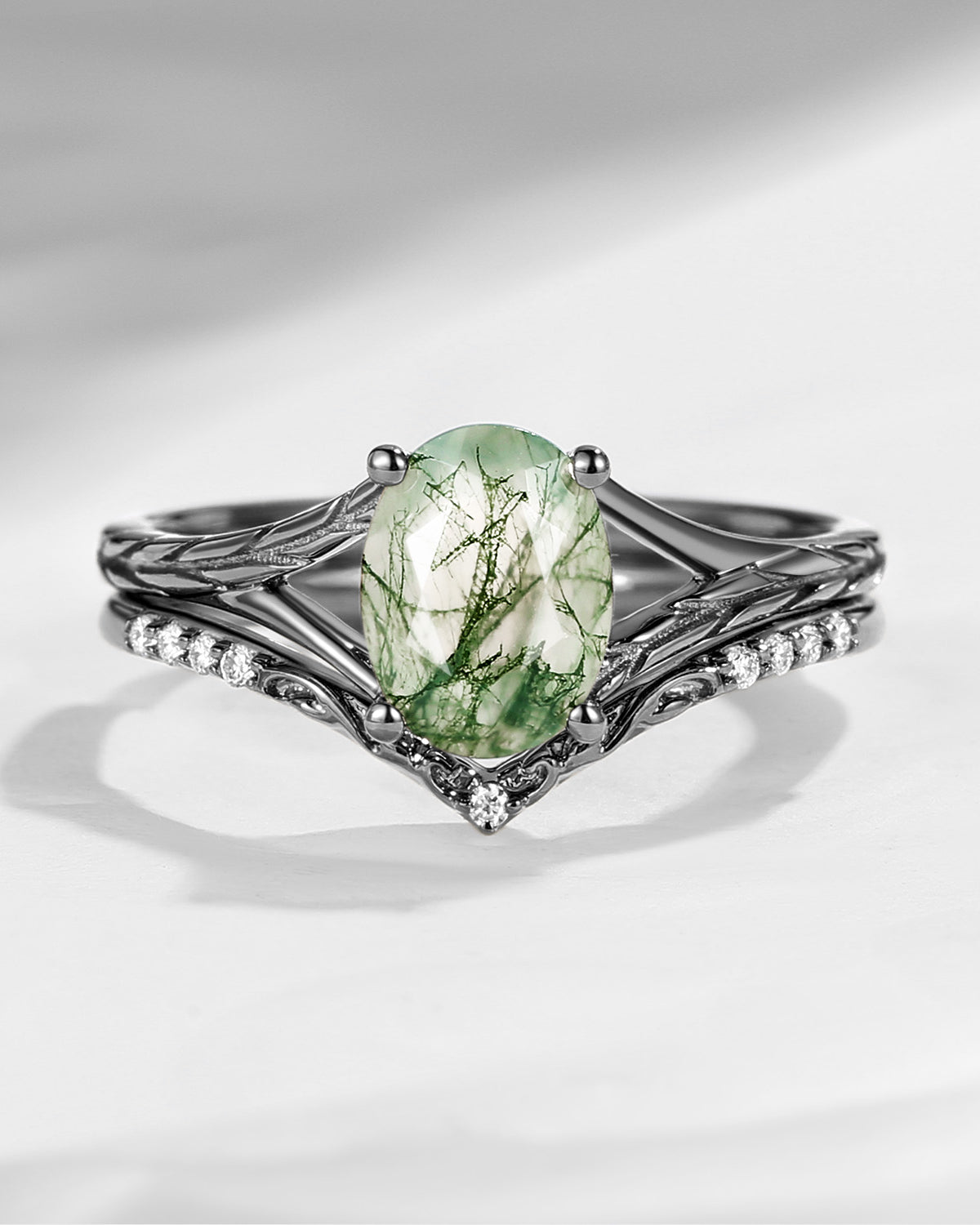 Nature Inspired Oval Cut Moss Agate Textured Engagement Ring Set 2pcs
