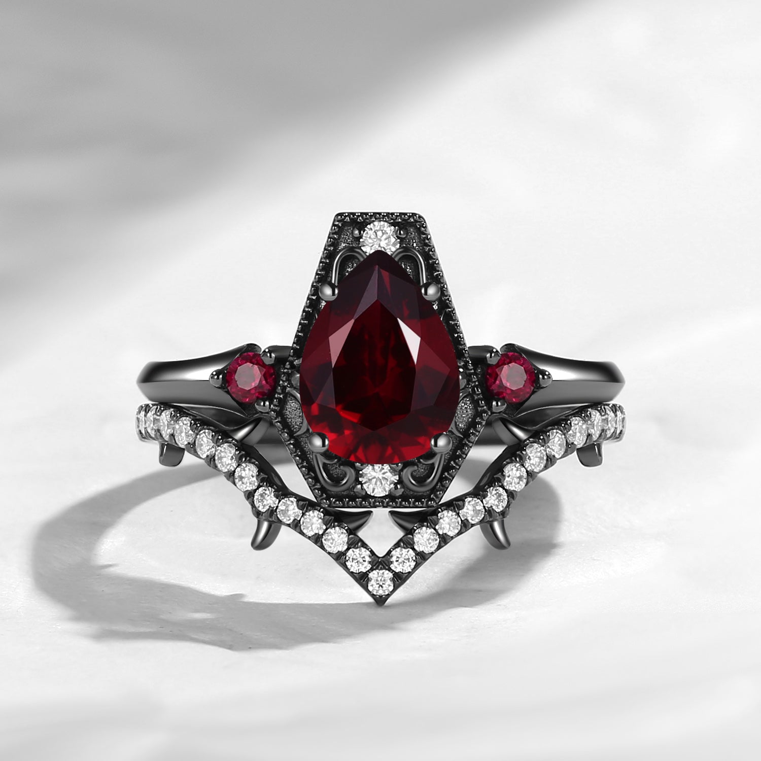 Gothic Pear Cut Garnet Vampire Fallen Aegis Engagement Ring Set 2pcs