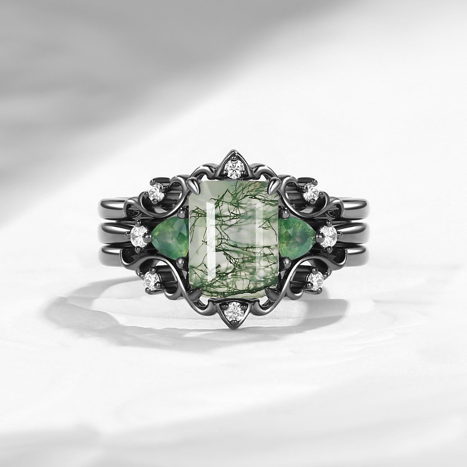 Nature Inspired Emerald Cut Moss Agate Gothic Engagement Ring Set 3pcs