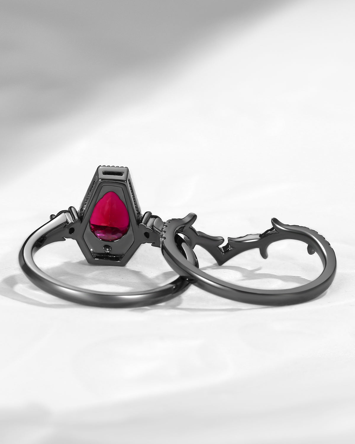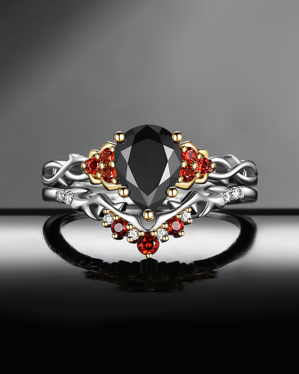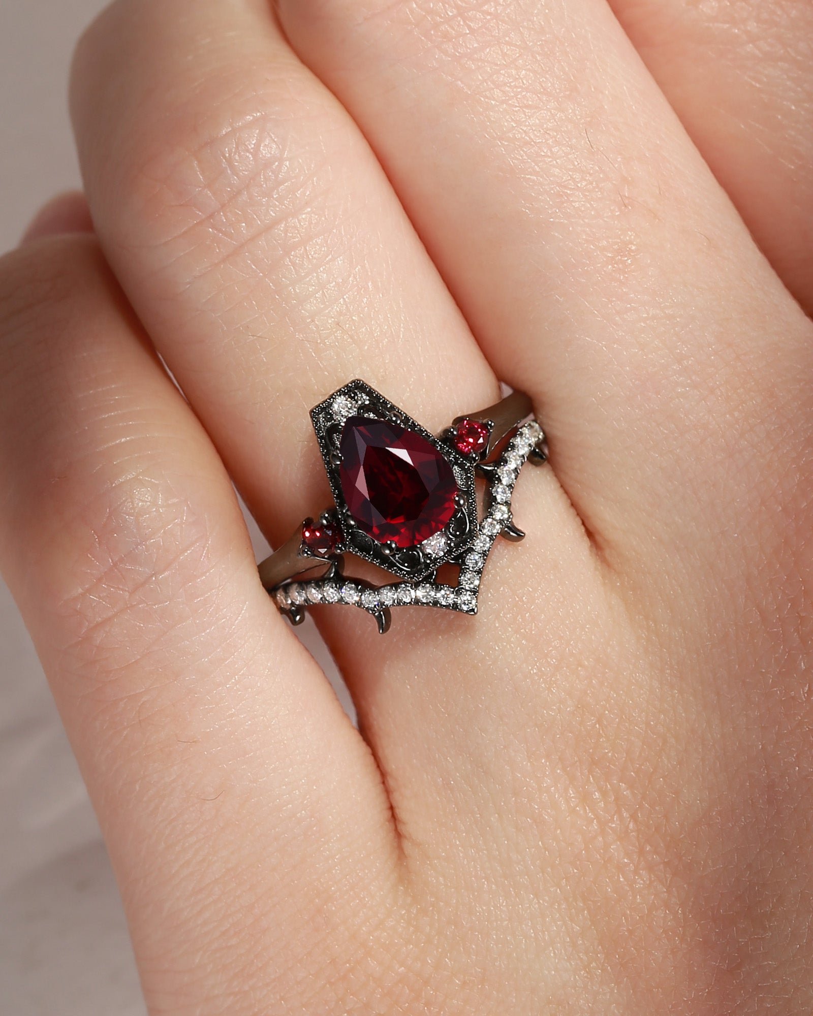 Gothic Pear Cut Garnet Vampire Fallen Aegis Engagement Ring Set 2pcs