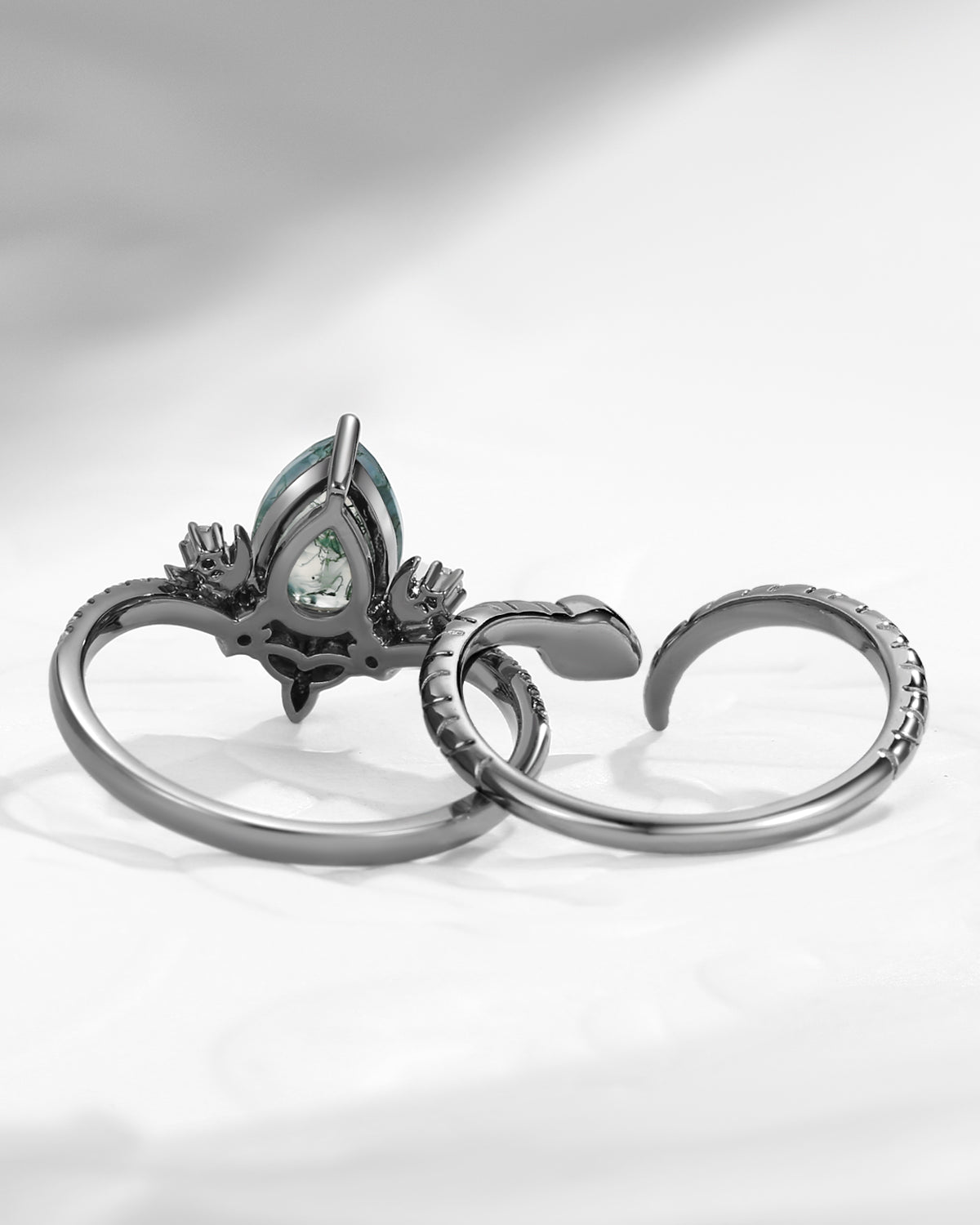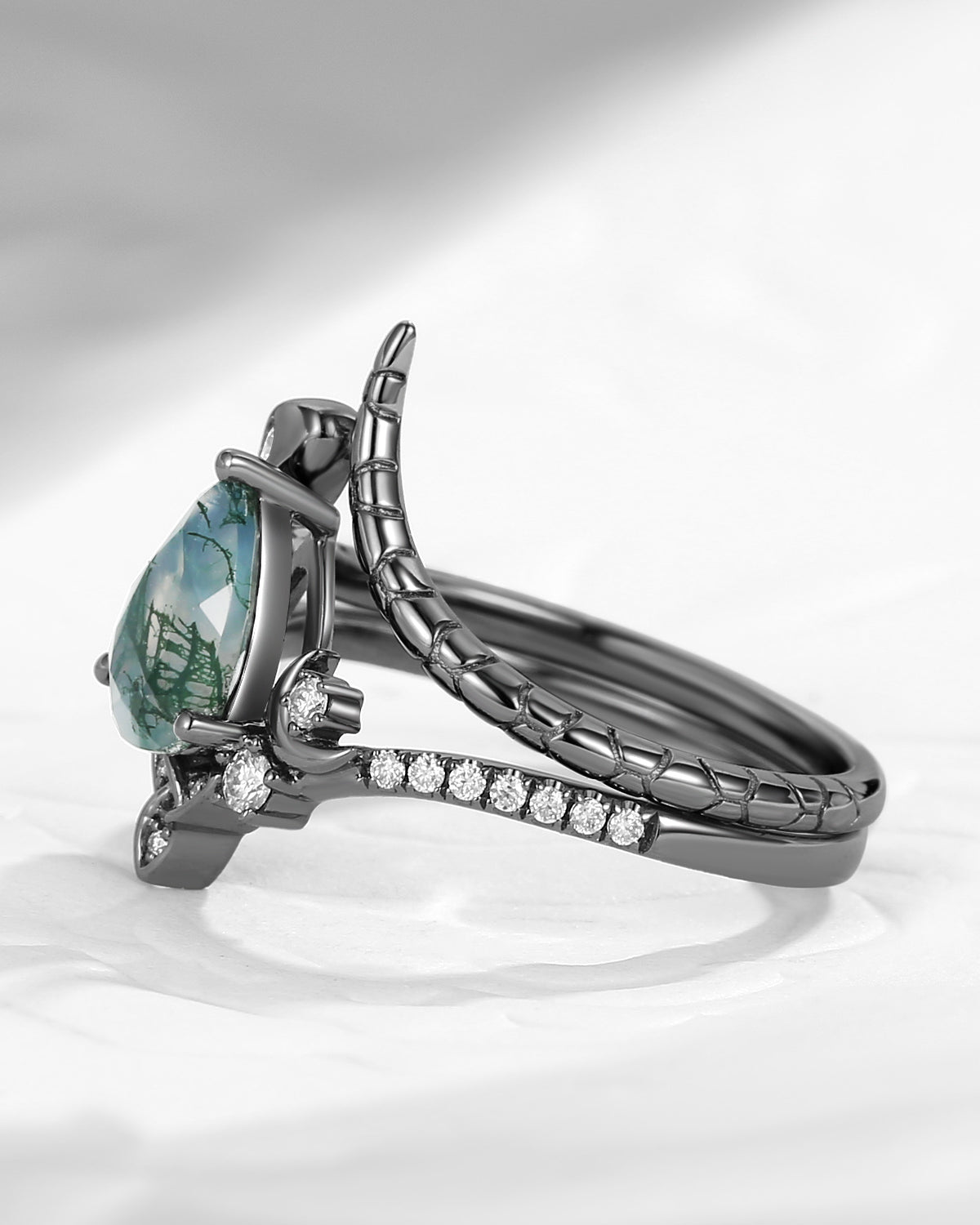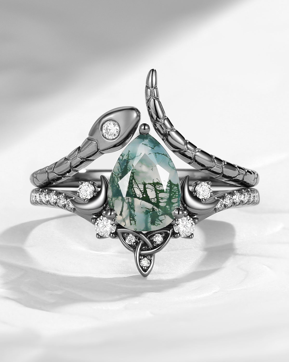 Celtic Moon | Pear Cut Moss Agate Gothic Inspired Snake Engagement Ring Set 2pcs