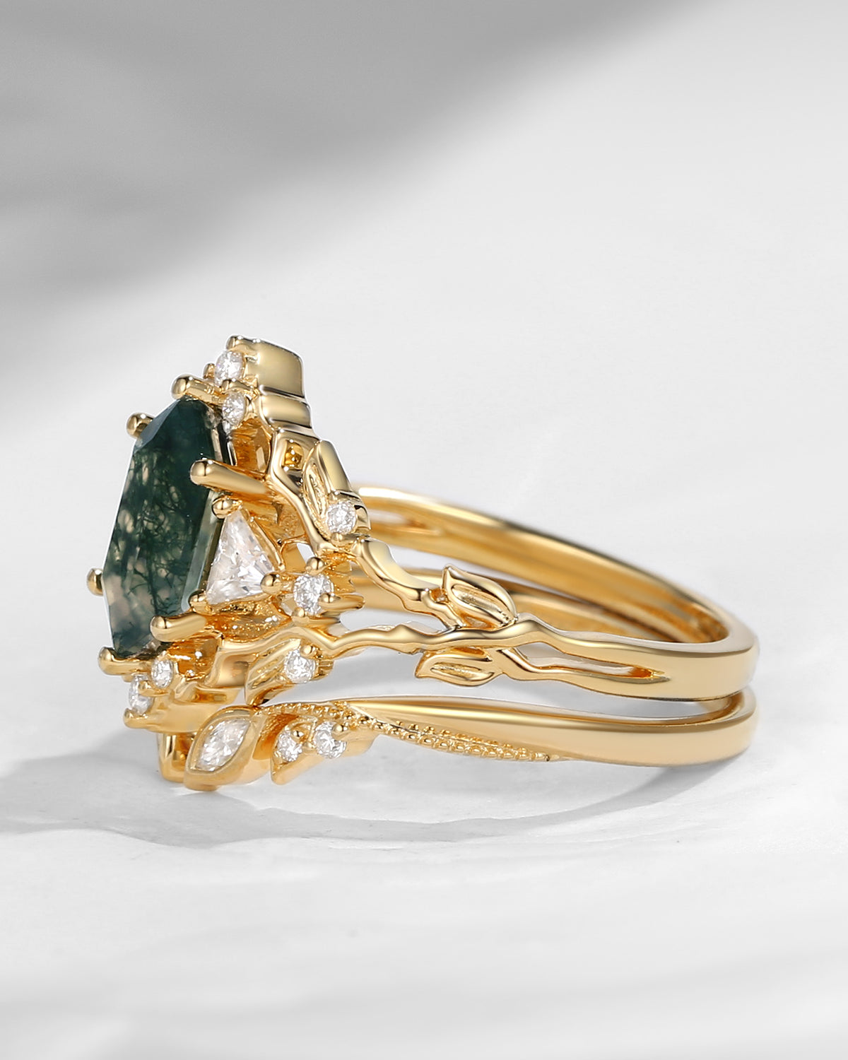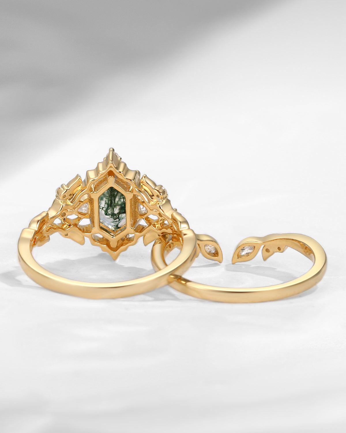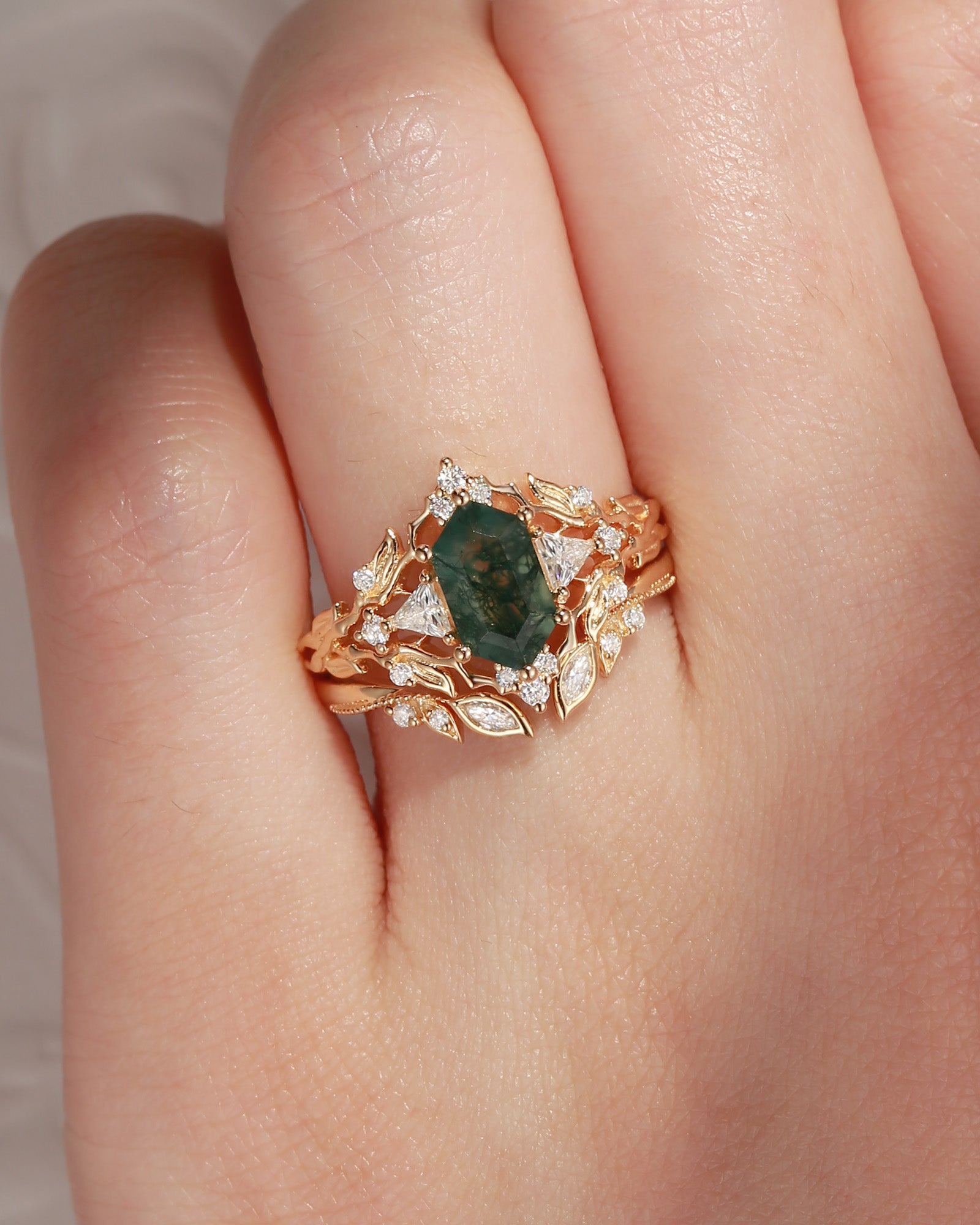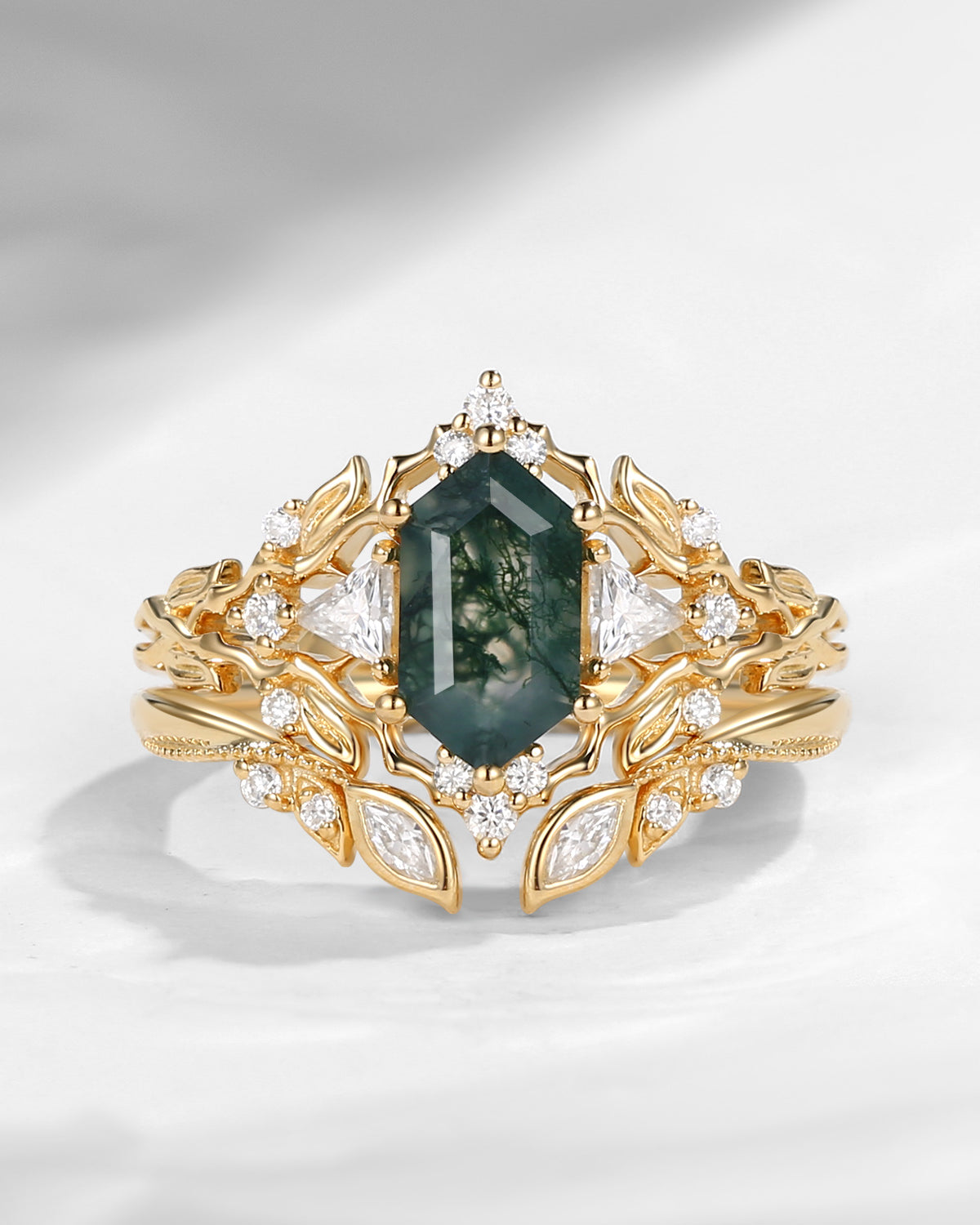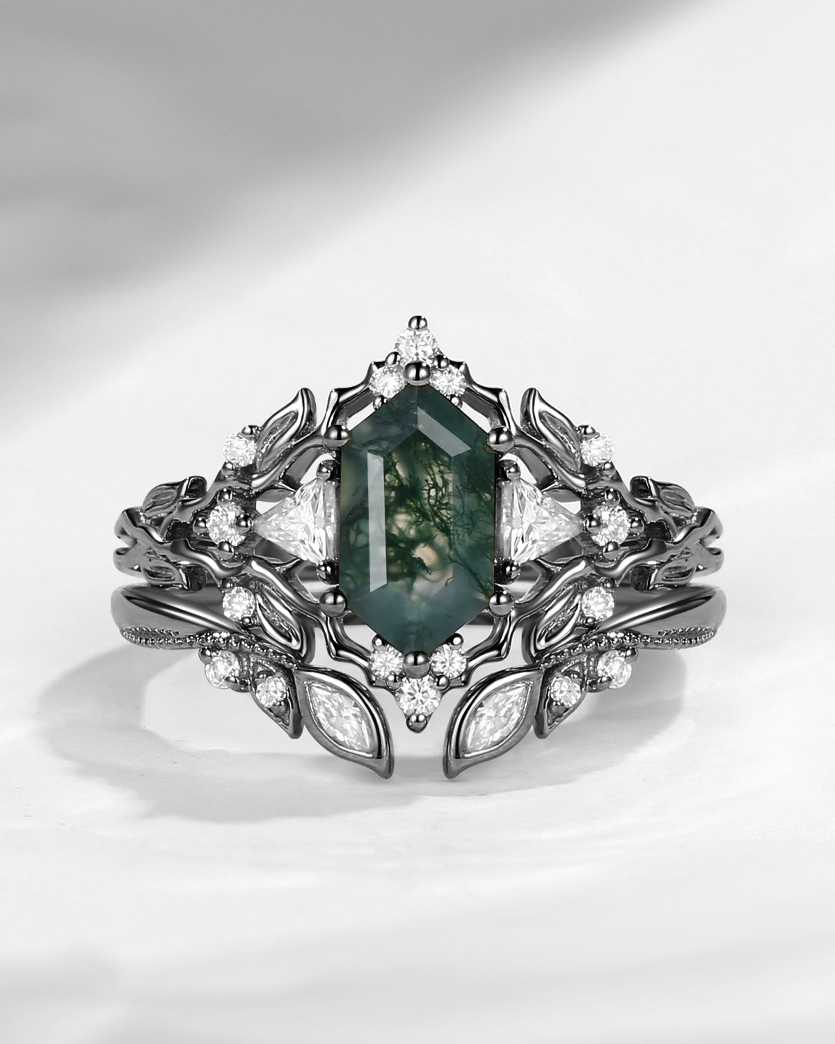 Nature Inspired Long Hexagon Moss Agate Garden Engagement Ring Set 2pcs