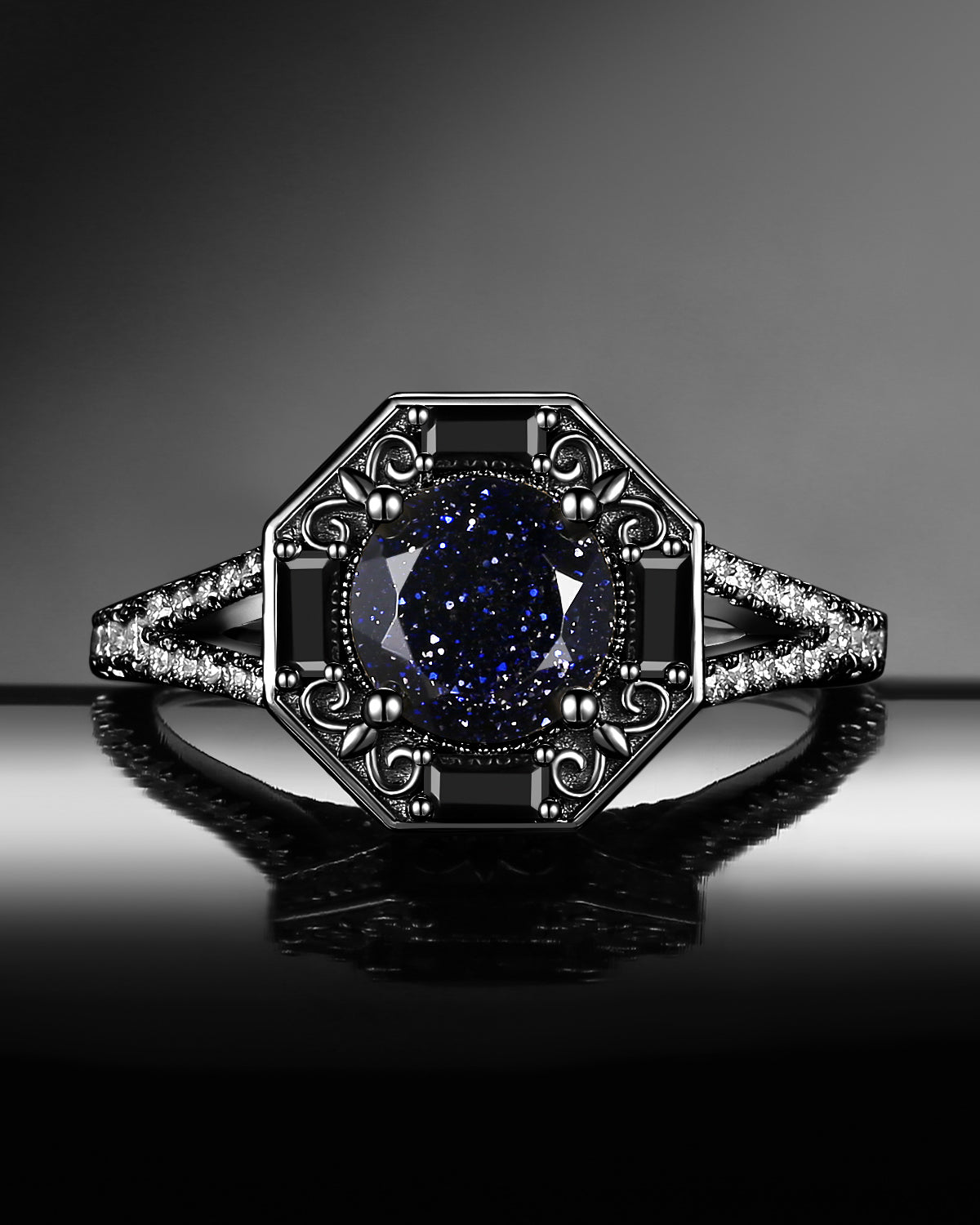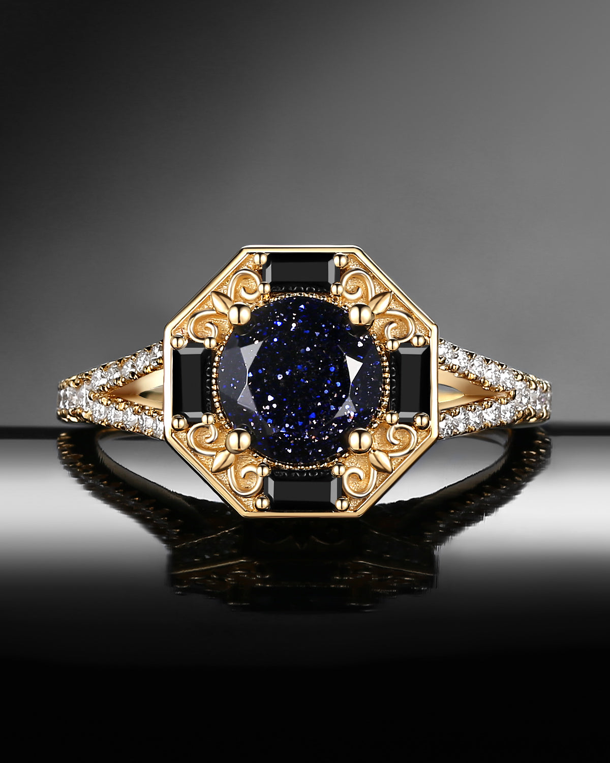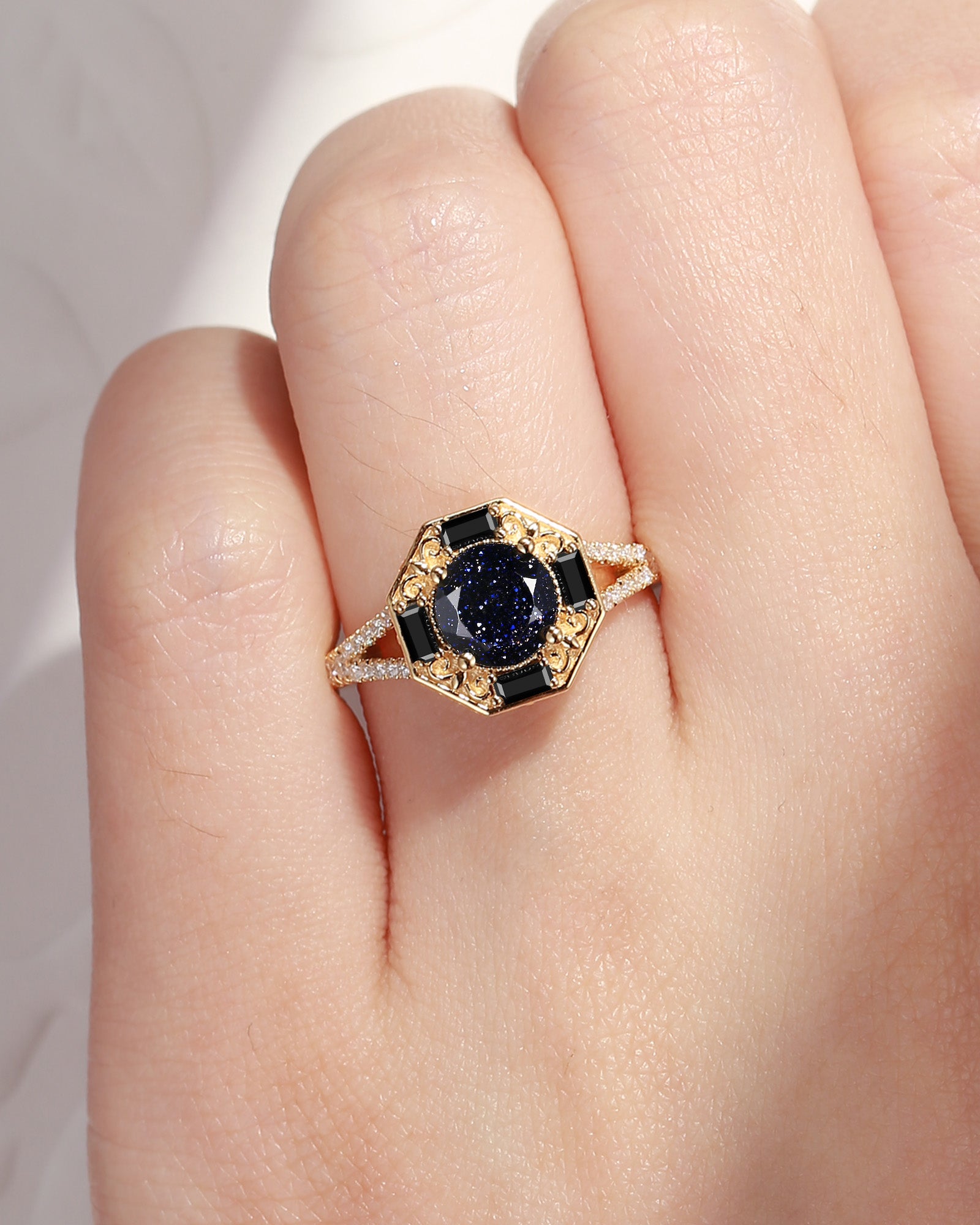 Round Cut Blue Sandstone 'Fallen Aegis' Filigree Gold Engagement Ring