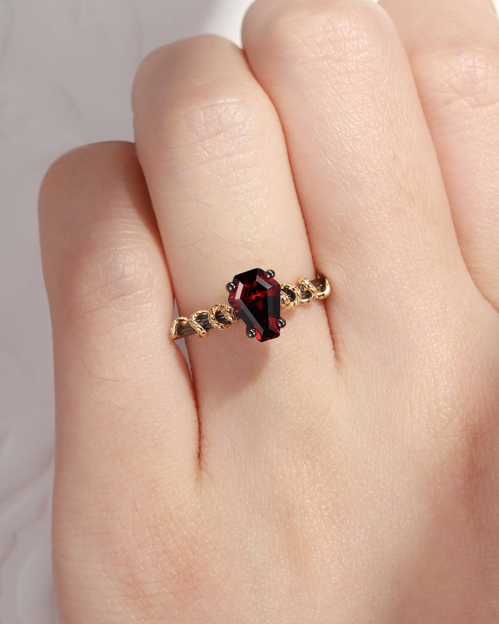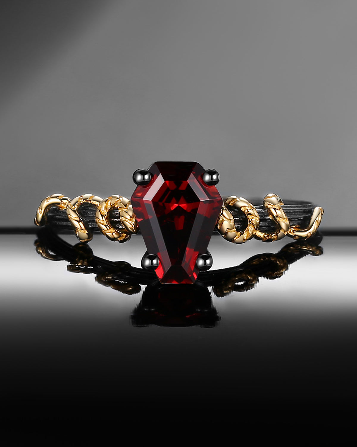 Gothic Twist Coffin Cut Garnet Two-Tone Gold Engagement Ring - Serpent's Embrace