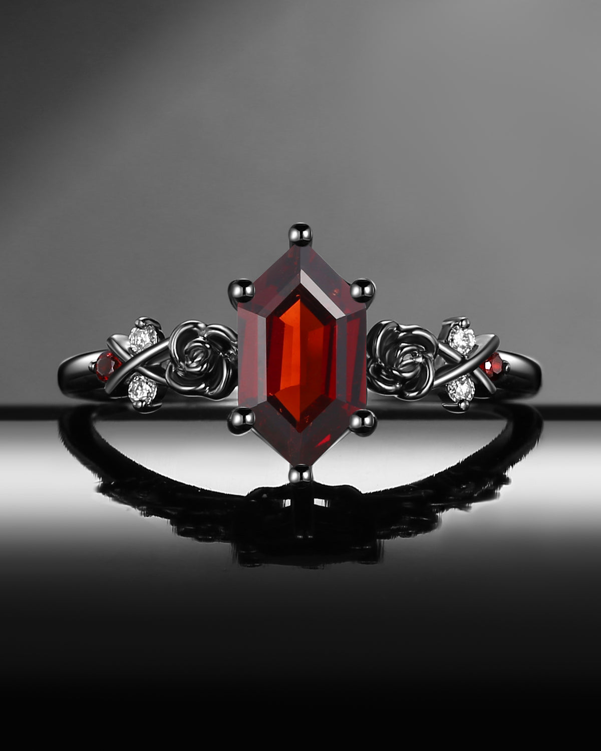 Gothic Long Hexagon Garnet 'Thorns & Roses' Cluster Black Gold Engagement Ring