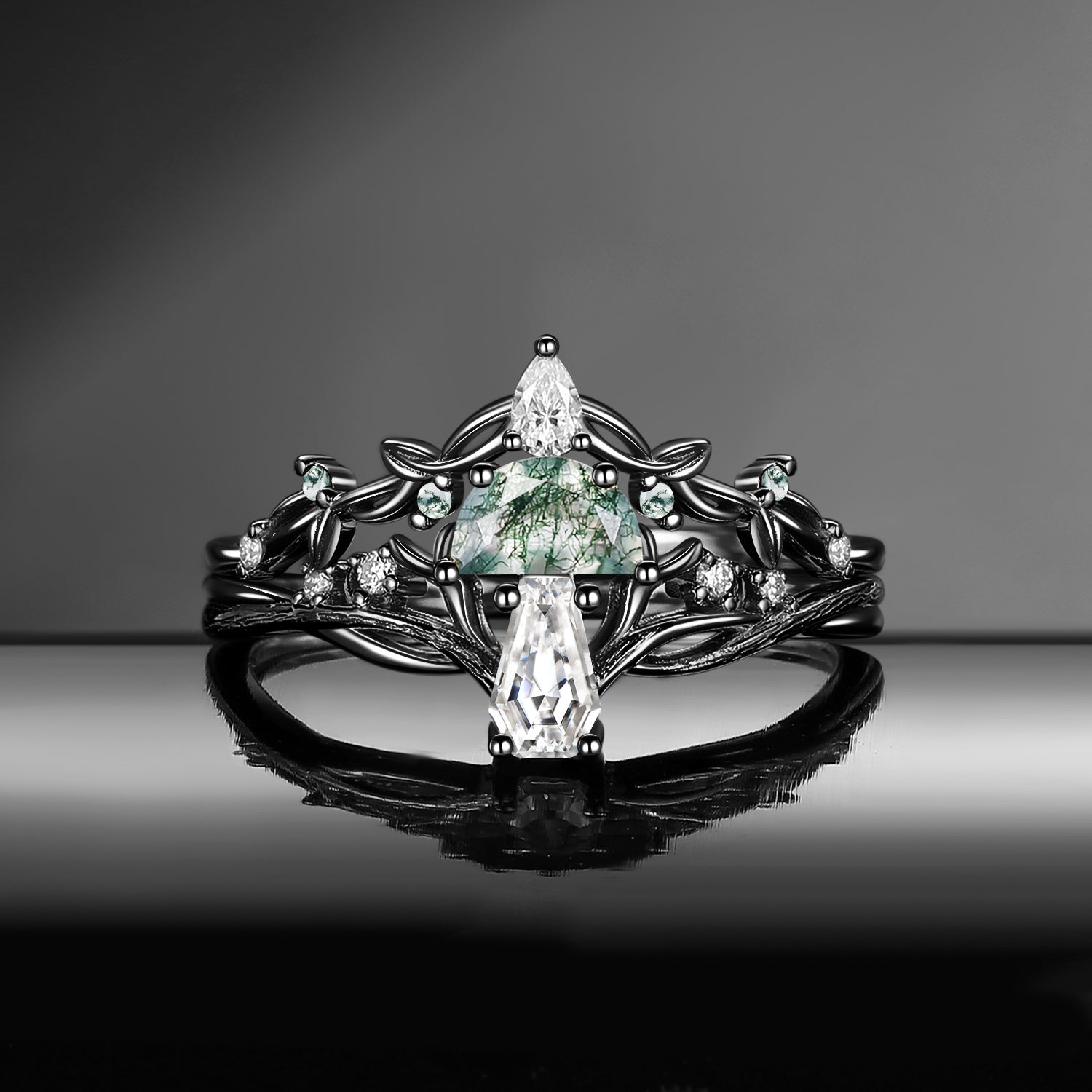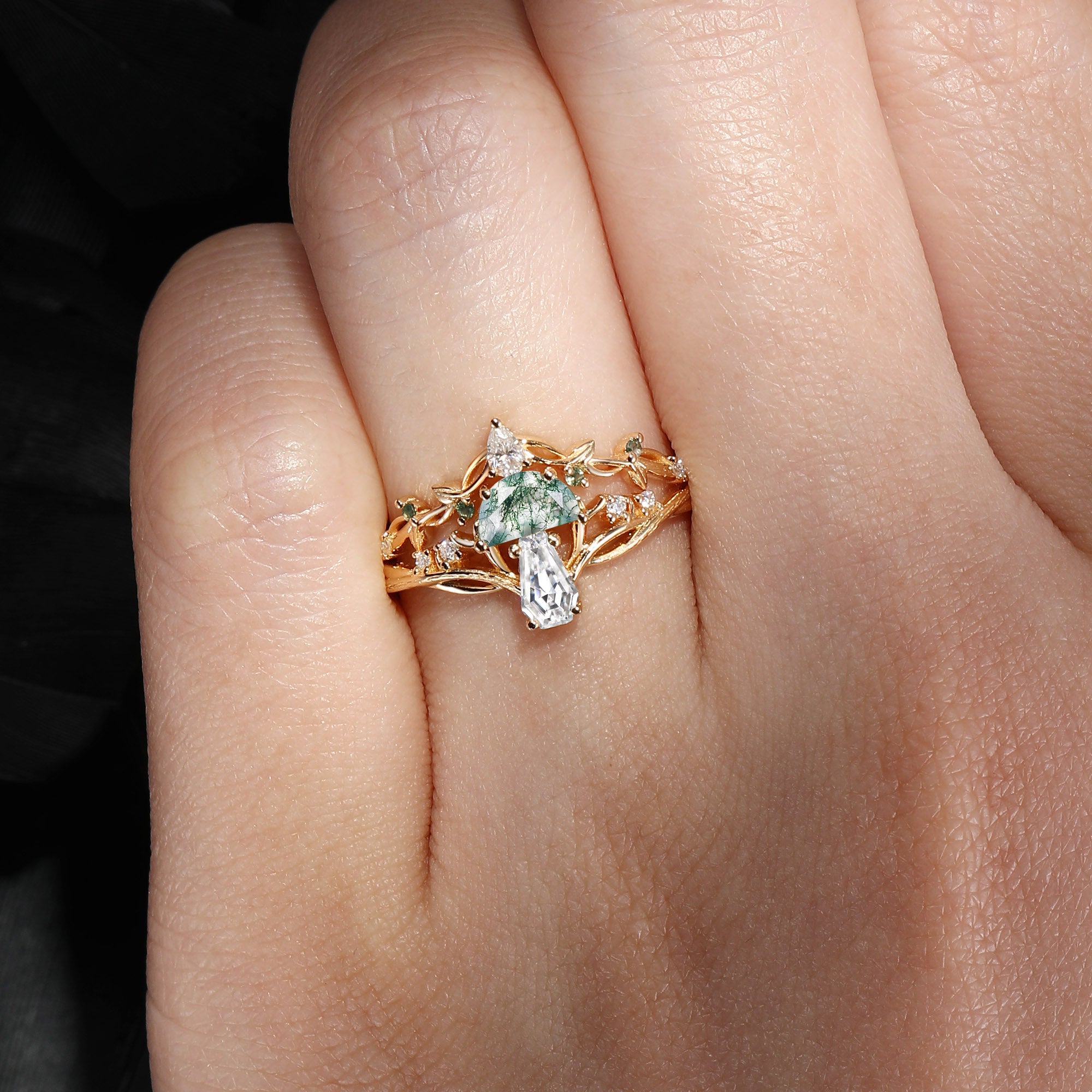 Bark Textured Half Moon Moss Agate & Coffin Moissanite 'Tree of Life' Leafy Mushroom Engagement Ring Set 2pcs