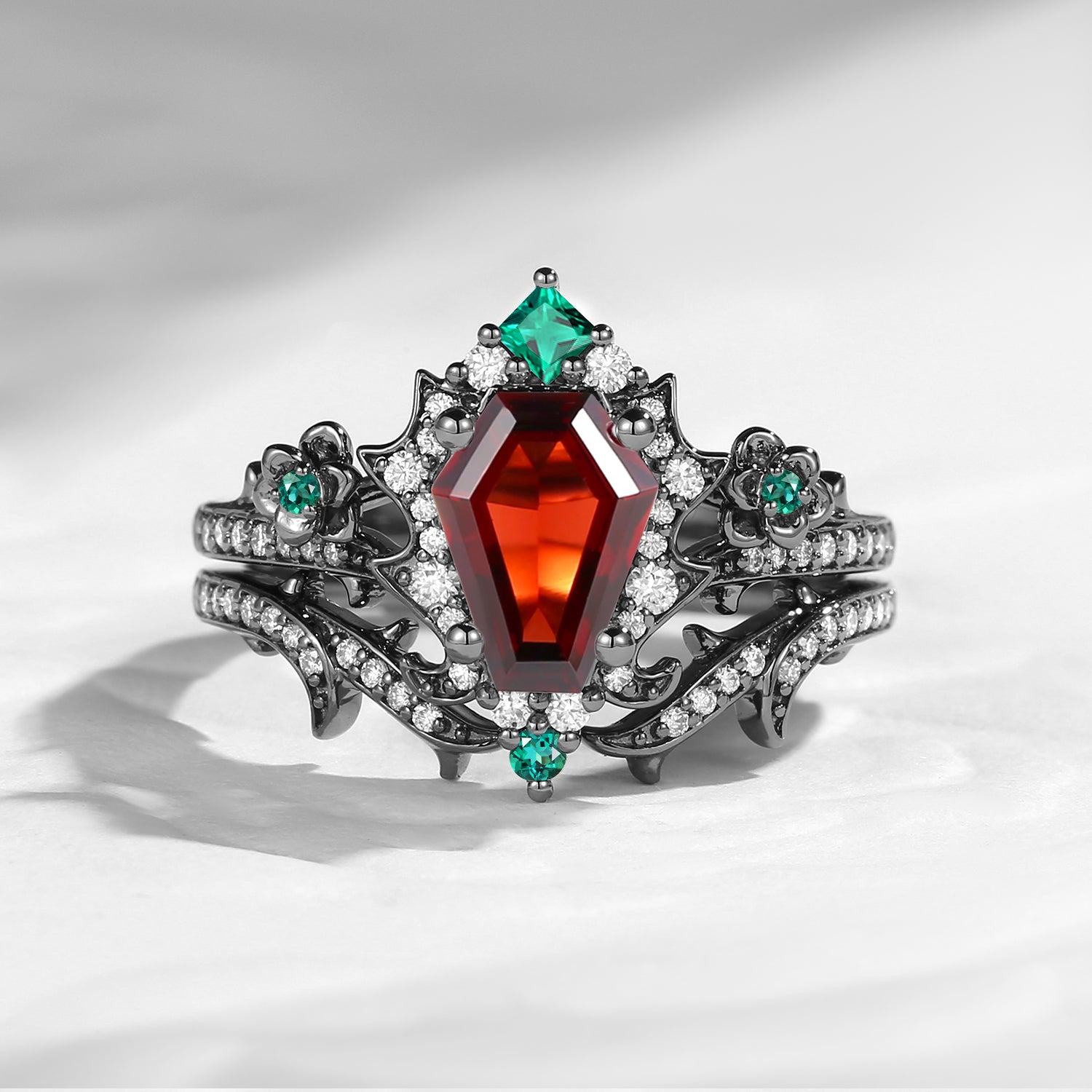 Gothic Coffin Garnet & Lab Emerald Garden Of Eden Black Gold Engagement Ring Set 2pcs- 'Thorns & Roses'