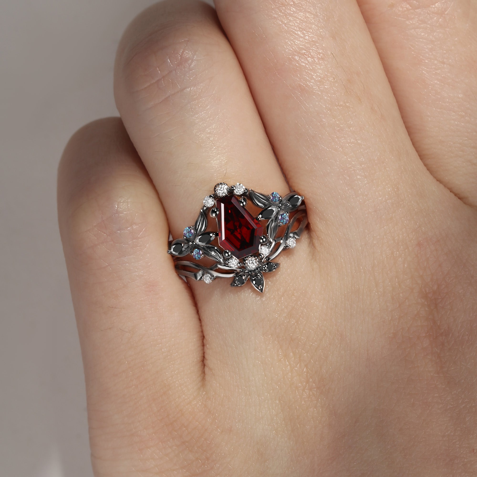 Gothic Style Coffin Cut Garnet Nature Inspired Engagement Ring Set 2pcs