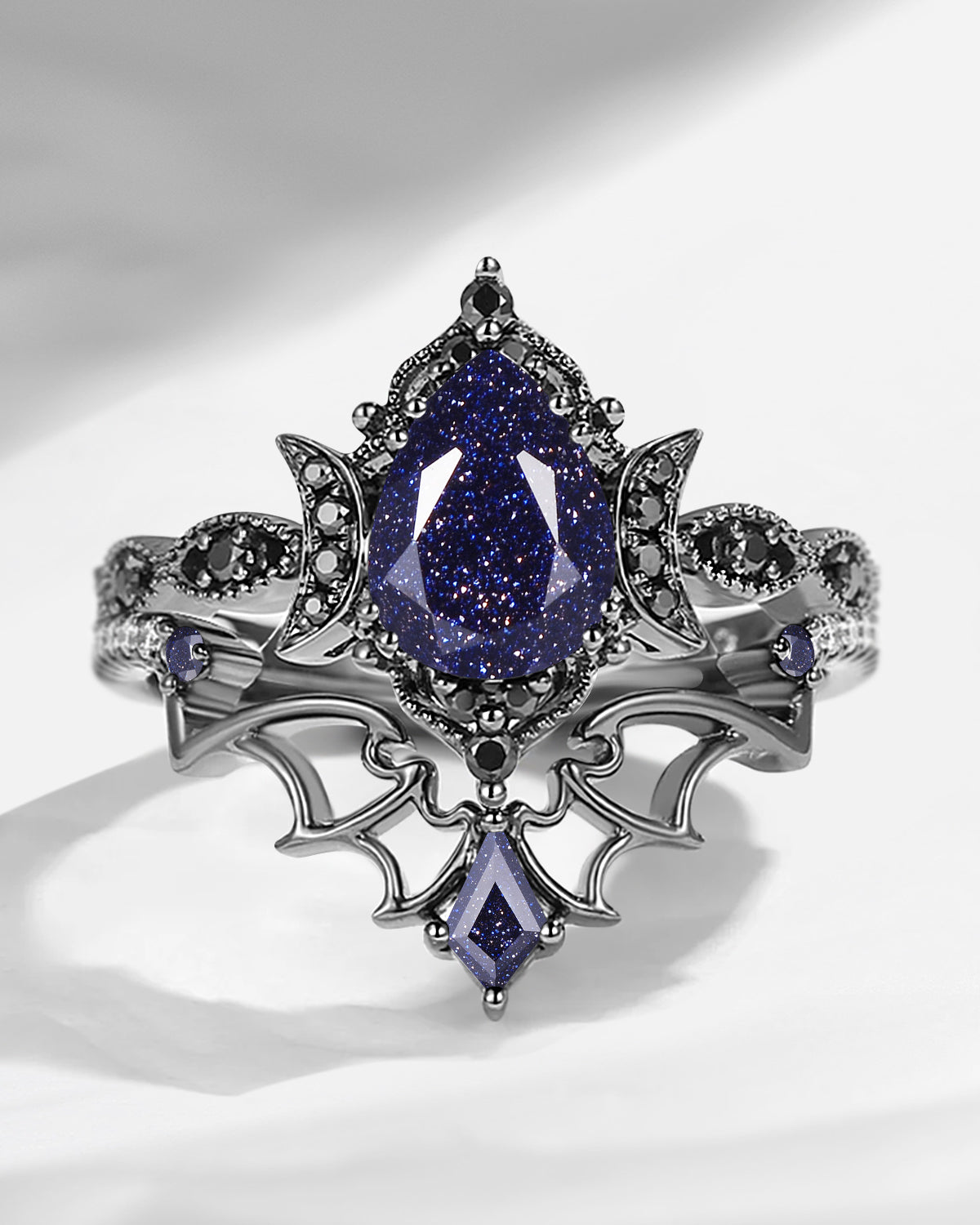Crescent Moon | Vintage Inspired Pear Shaped Garnet Black Gold Ring Set 2pcs