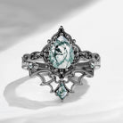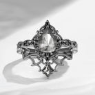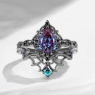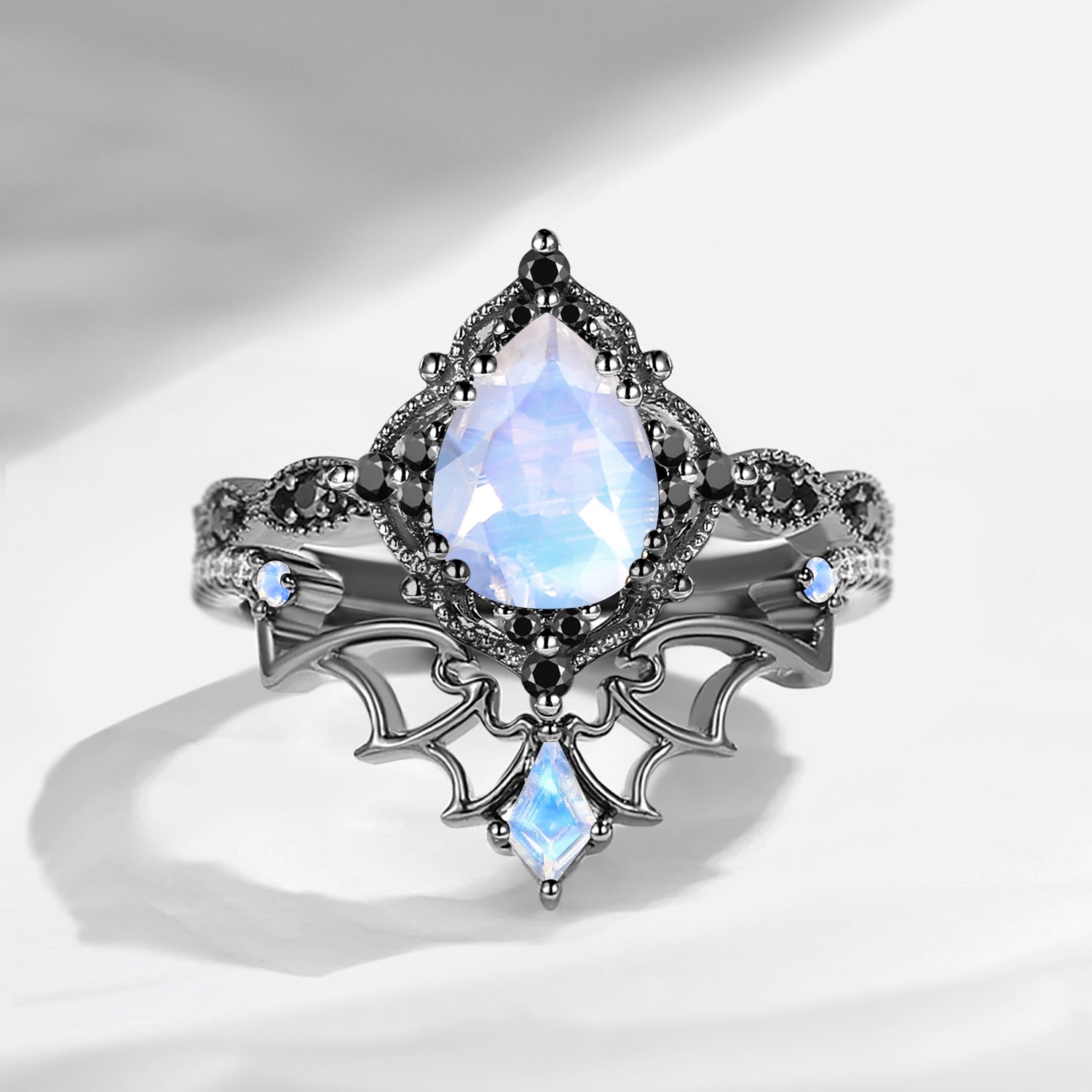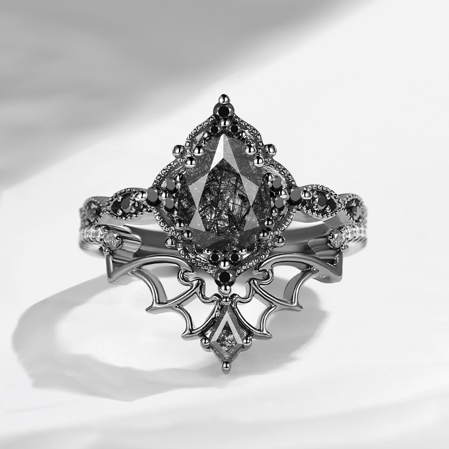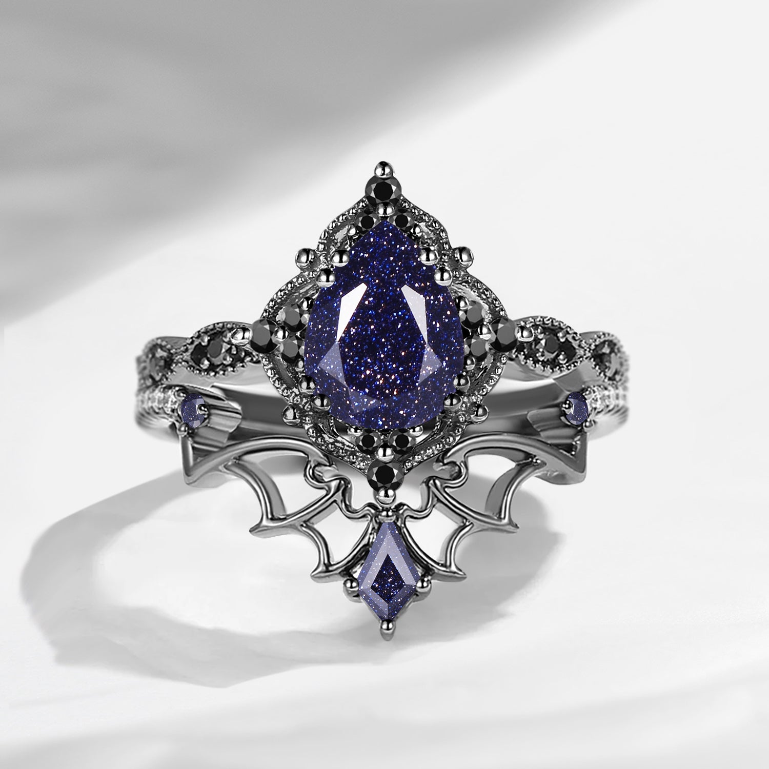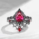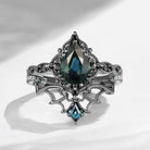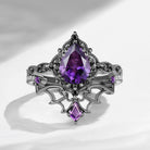 Gothic Inspired 'Dark Romance' Pear Cut Garnet Black Gold Engagement Ring Set 2pcs