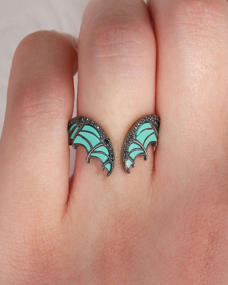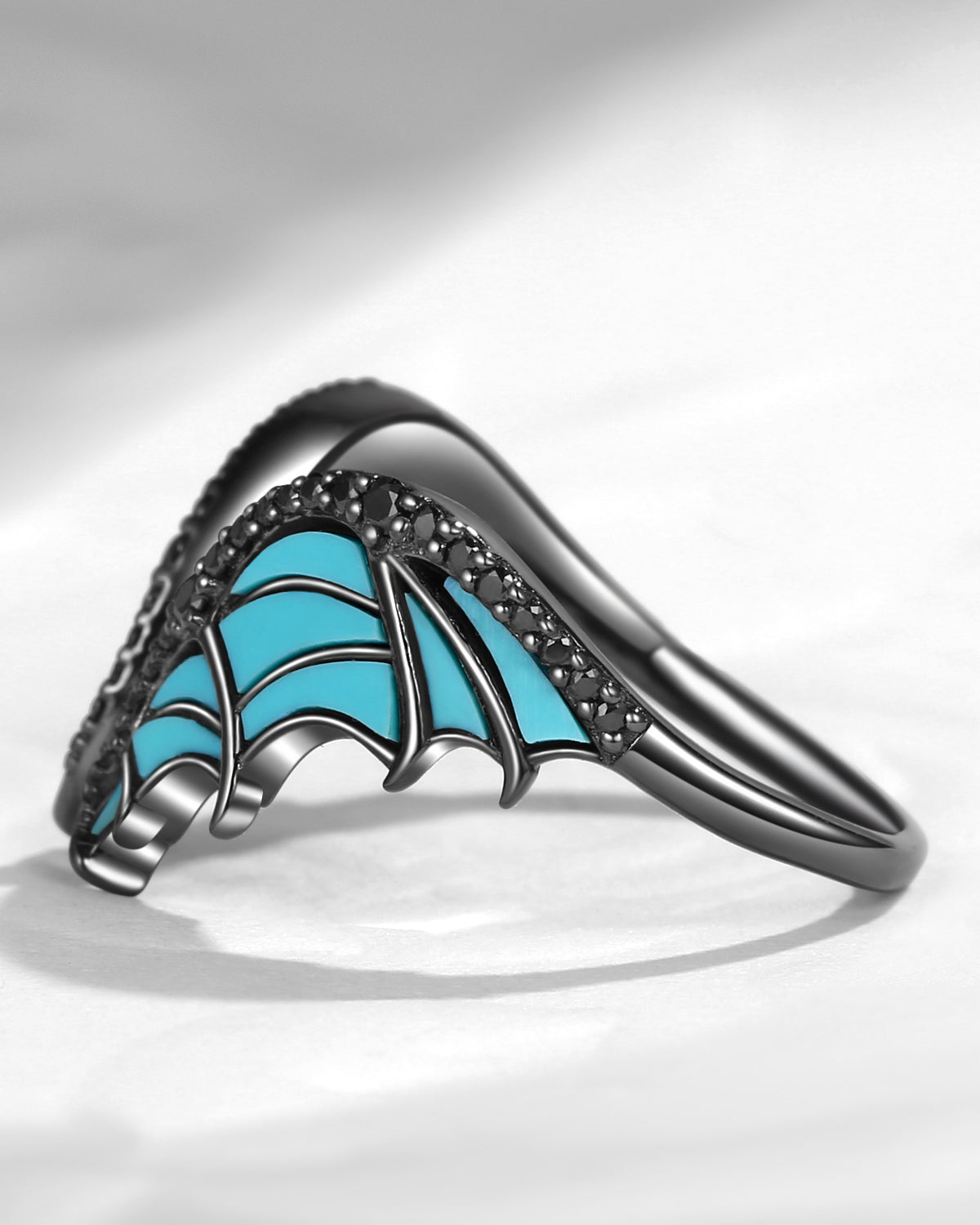 Curved Bat Wing Inspired Turquoise Black Gold Wedding Enhancer Ring