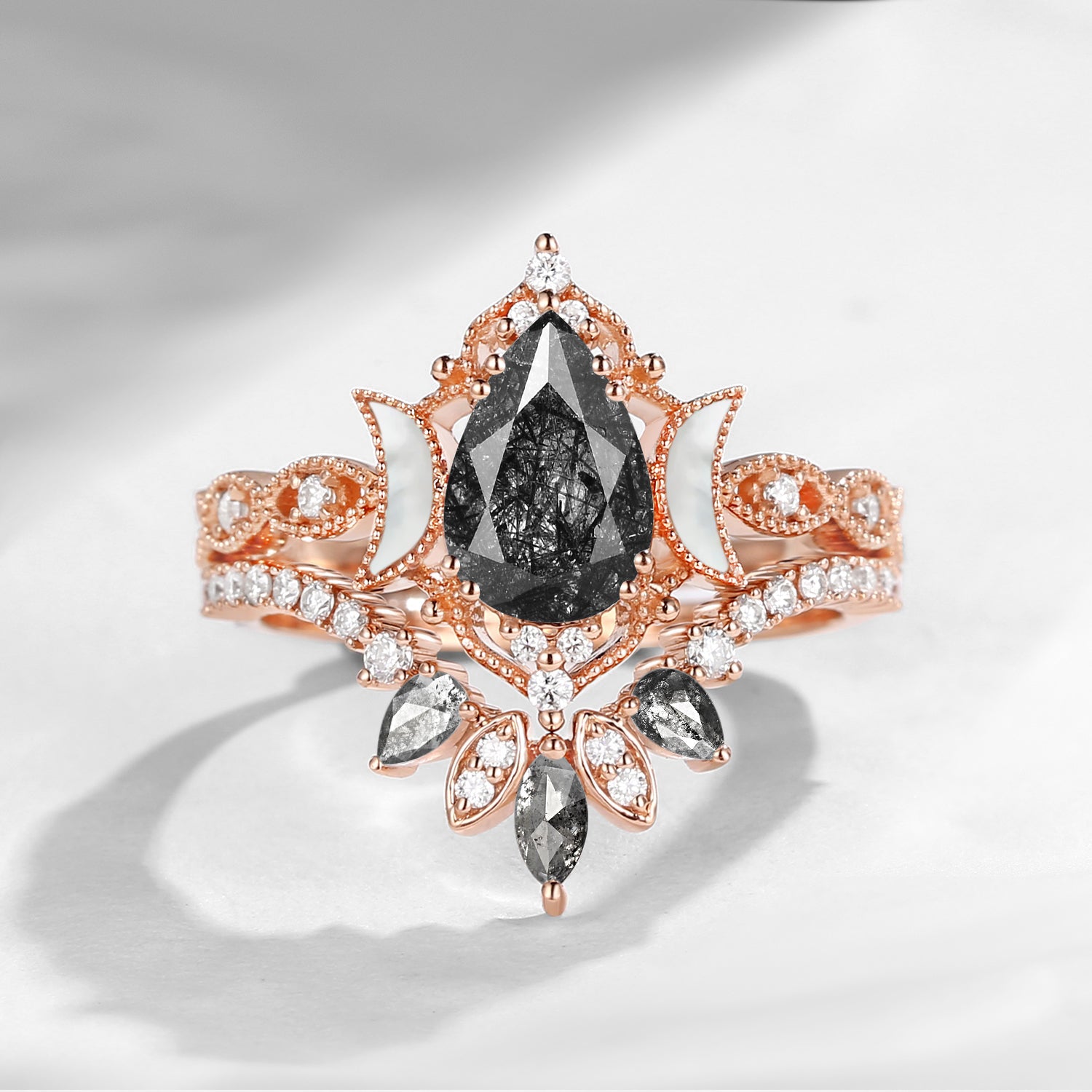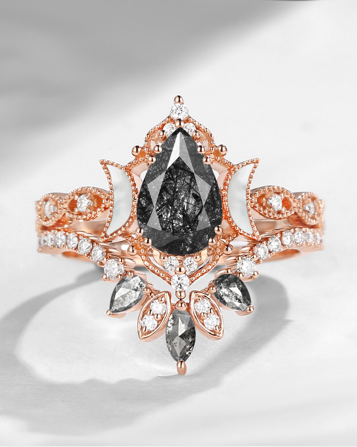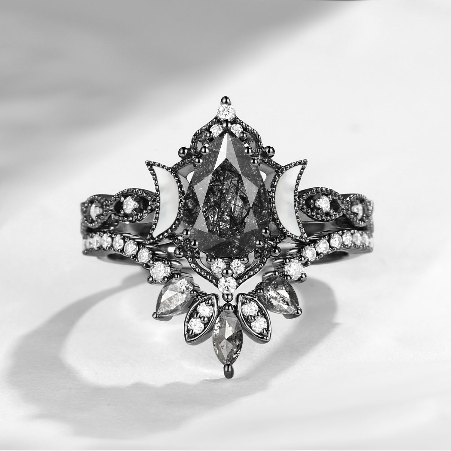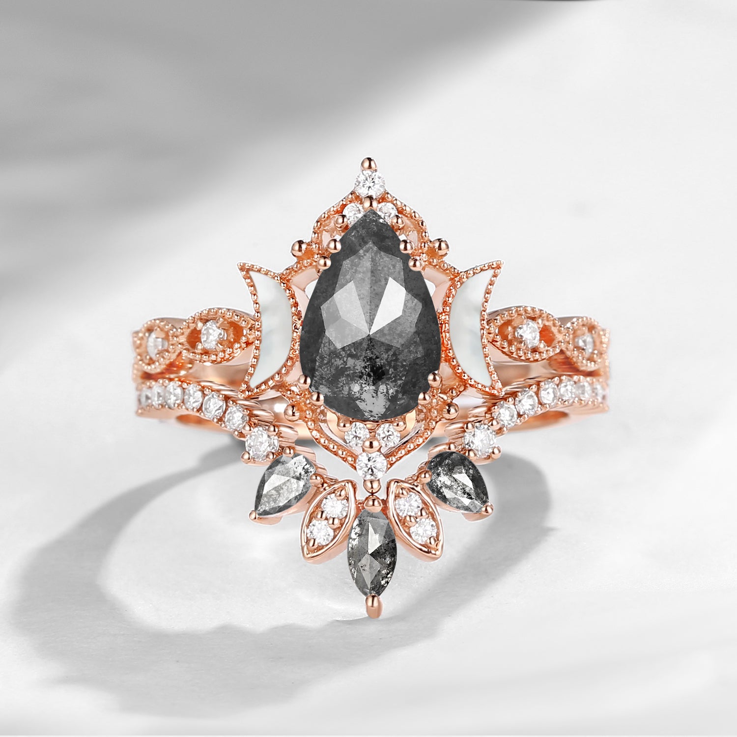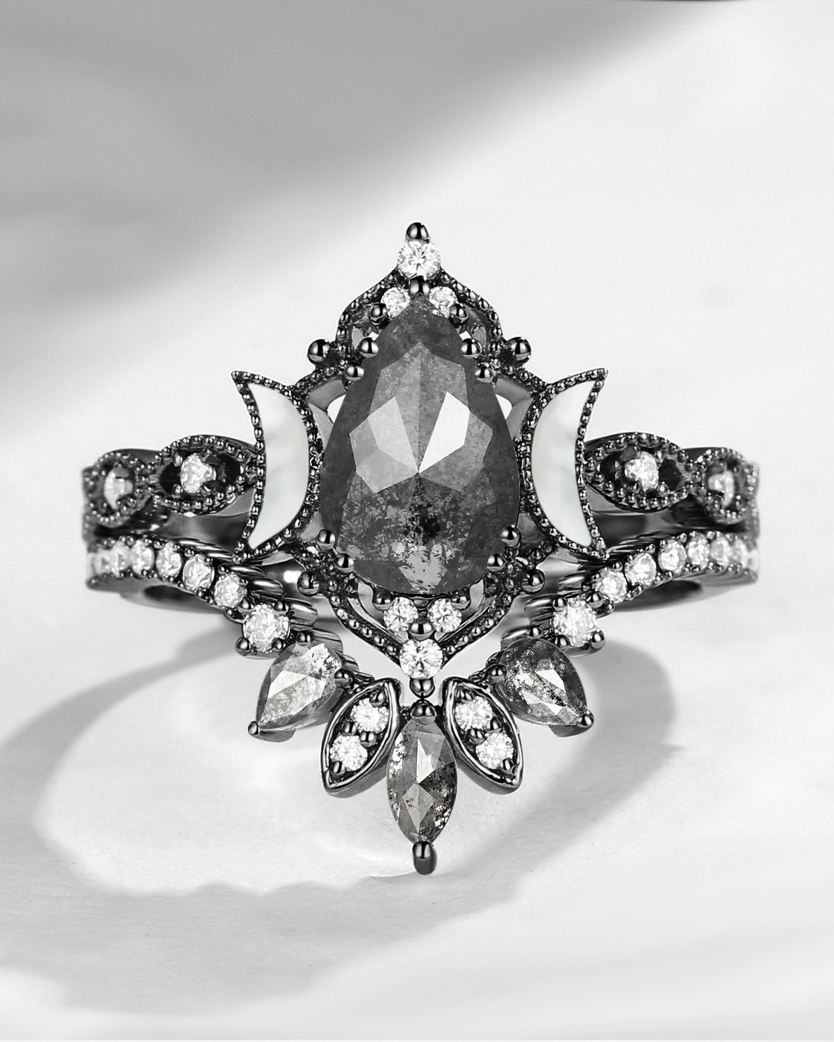 Nature Inspired Pear Cut Salt & Pepper Diamond Halo Engagement Ring Set 3pcs