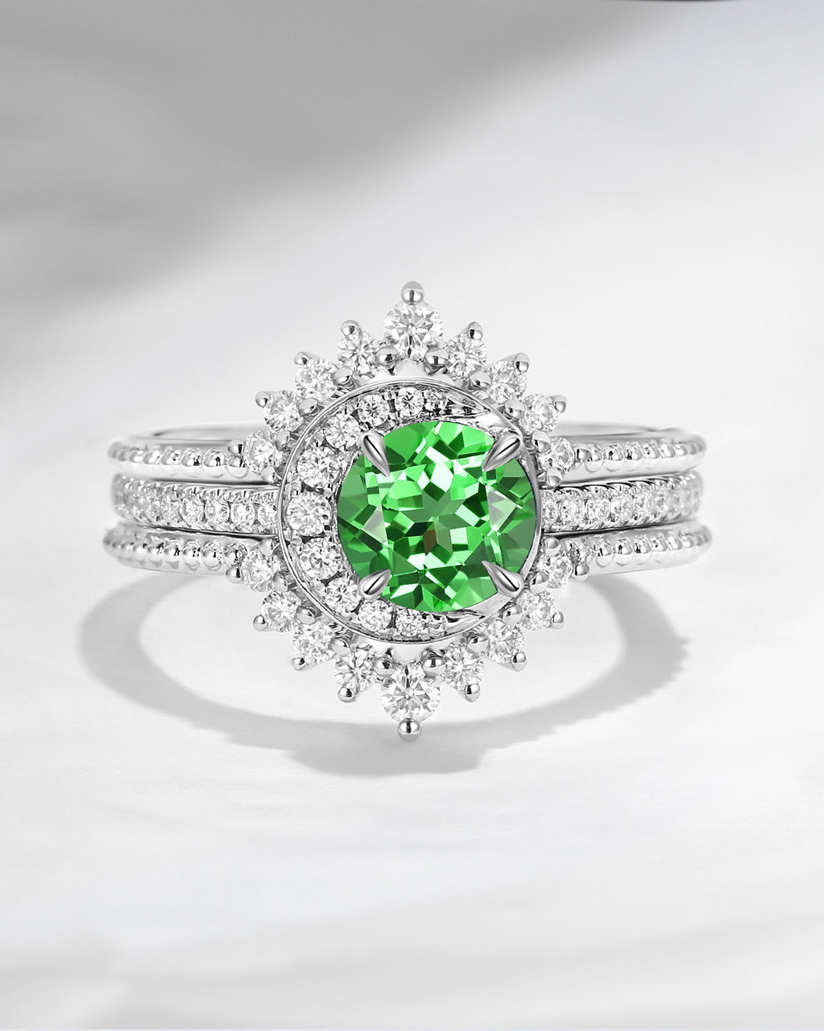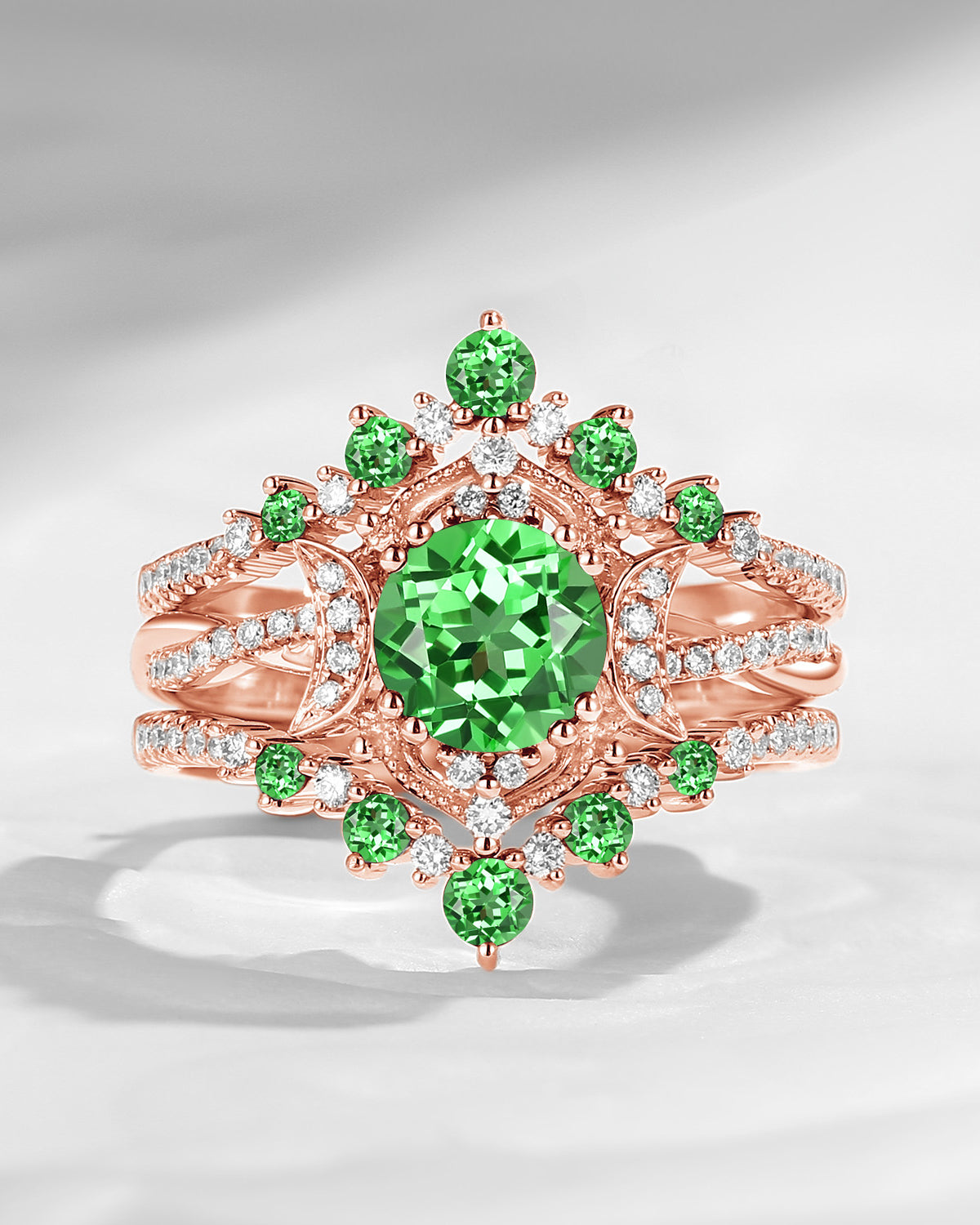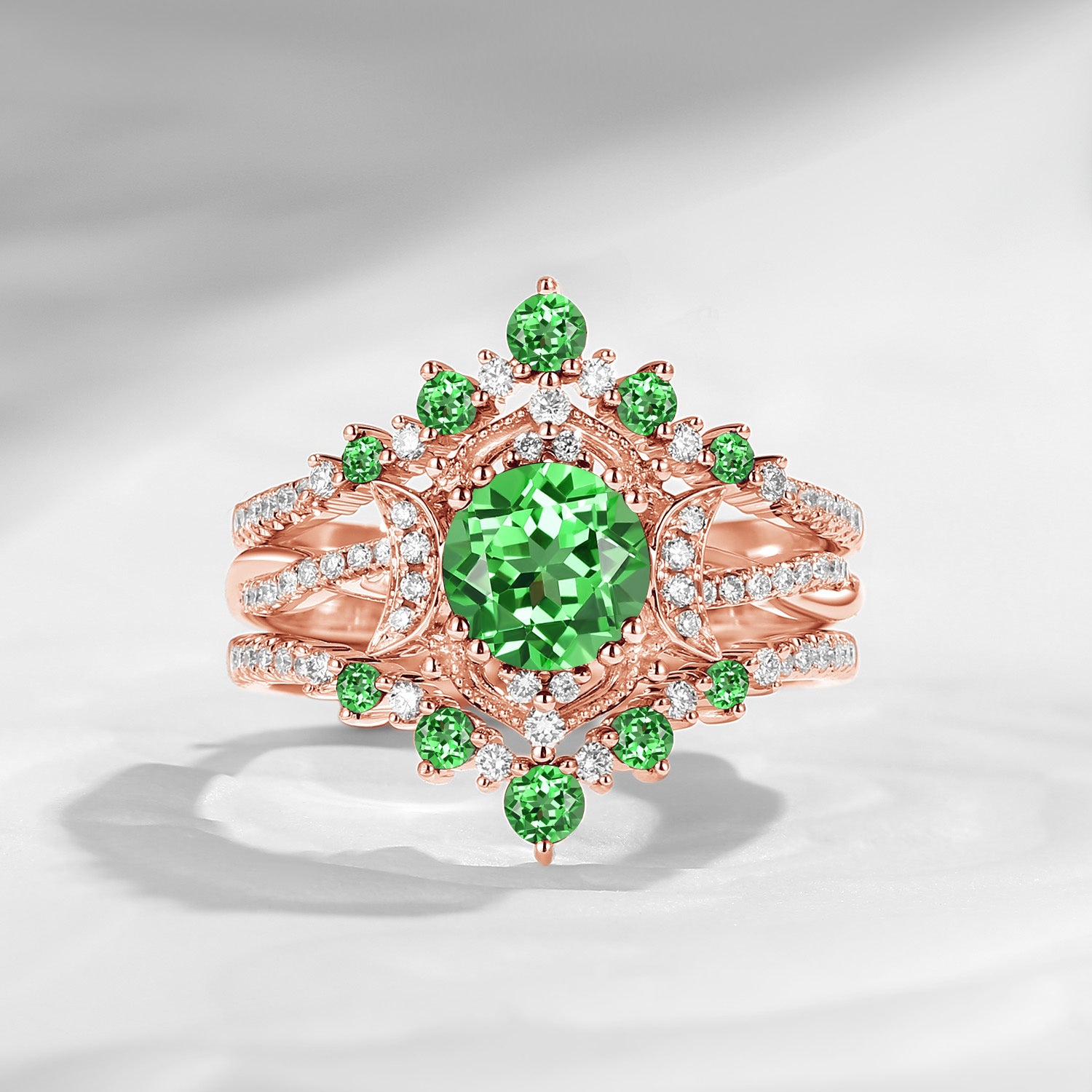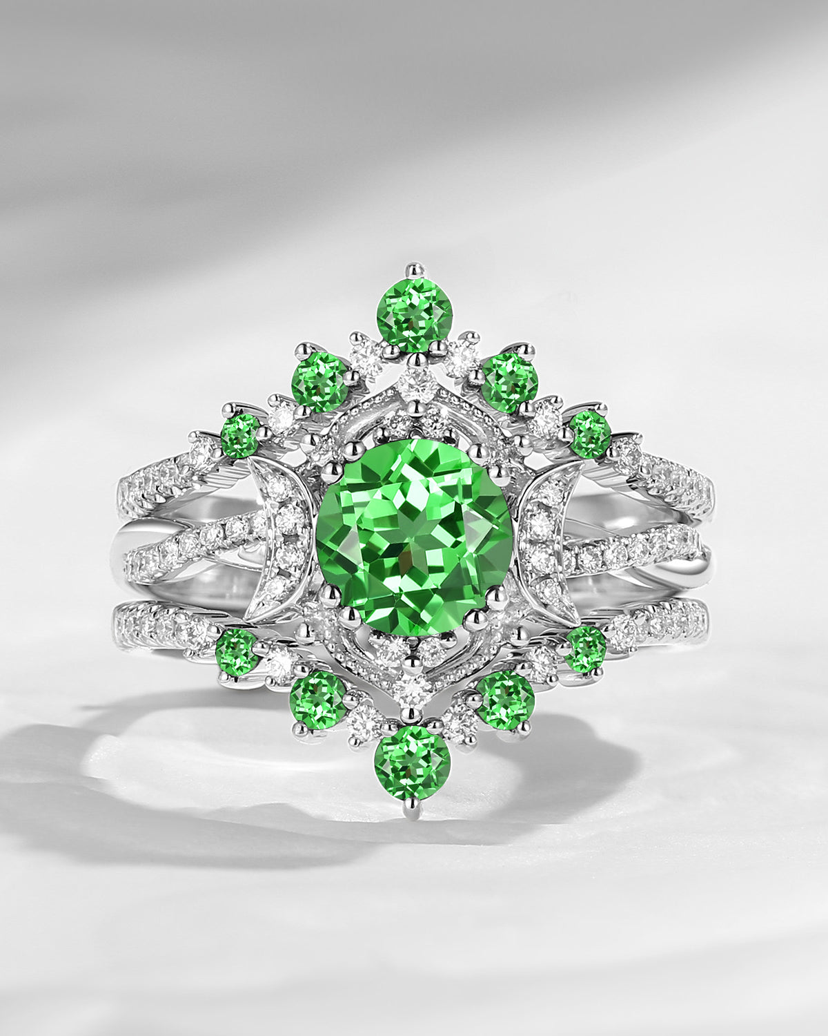 Crescent Moon | Round Lab Tsavorite Engagement Ring Set 3PCS - Full Moon
