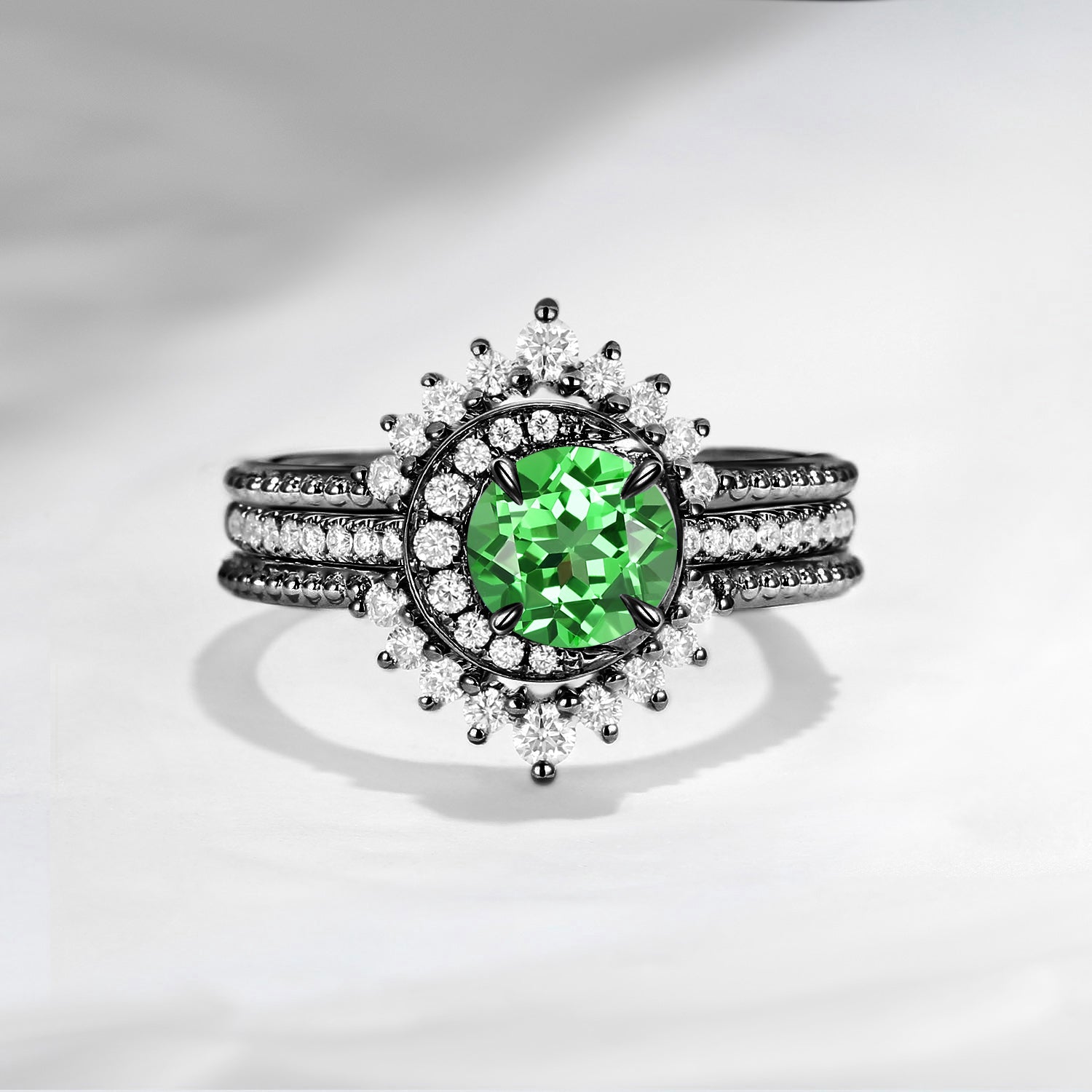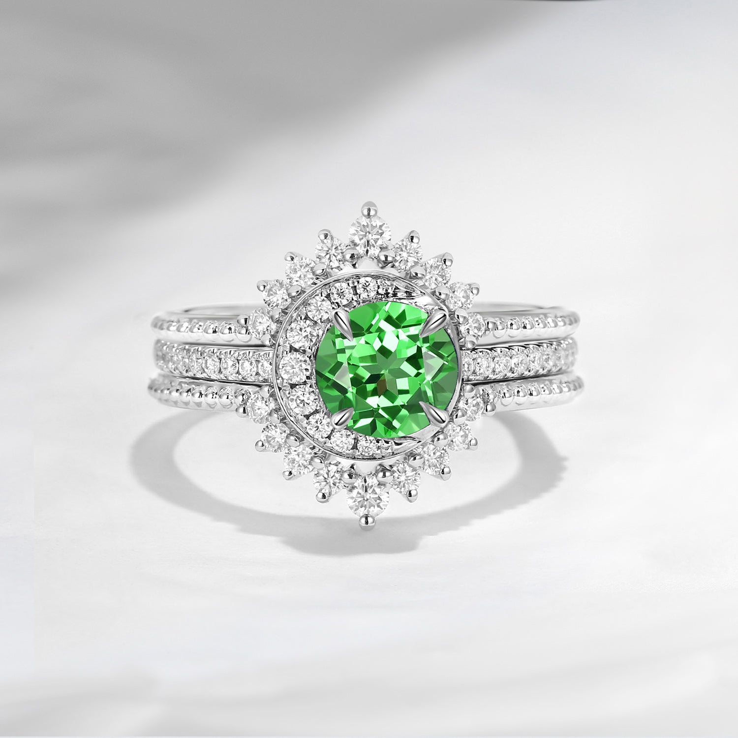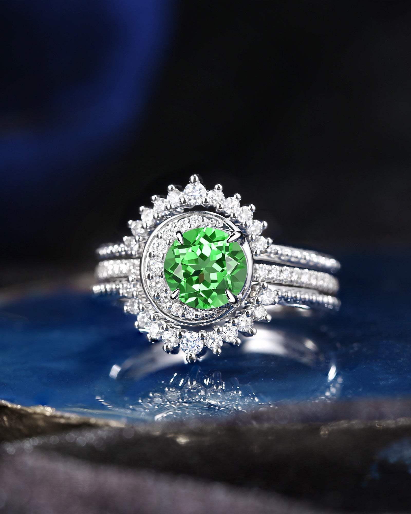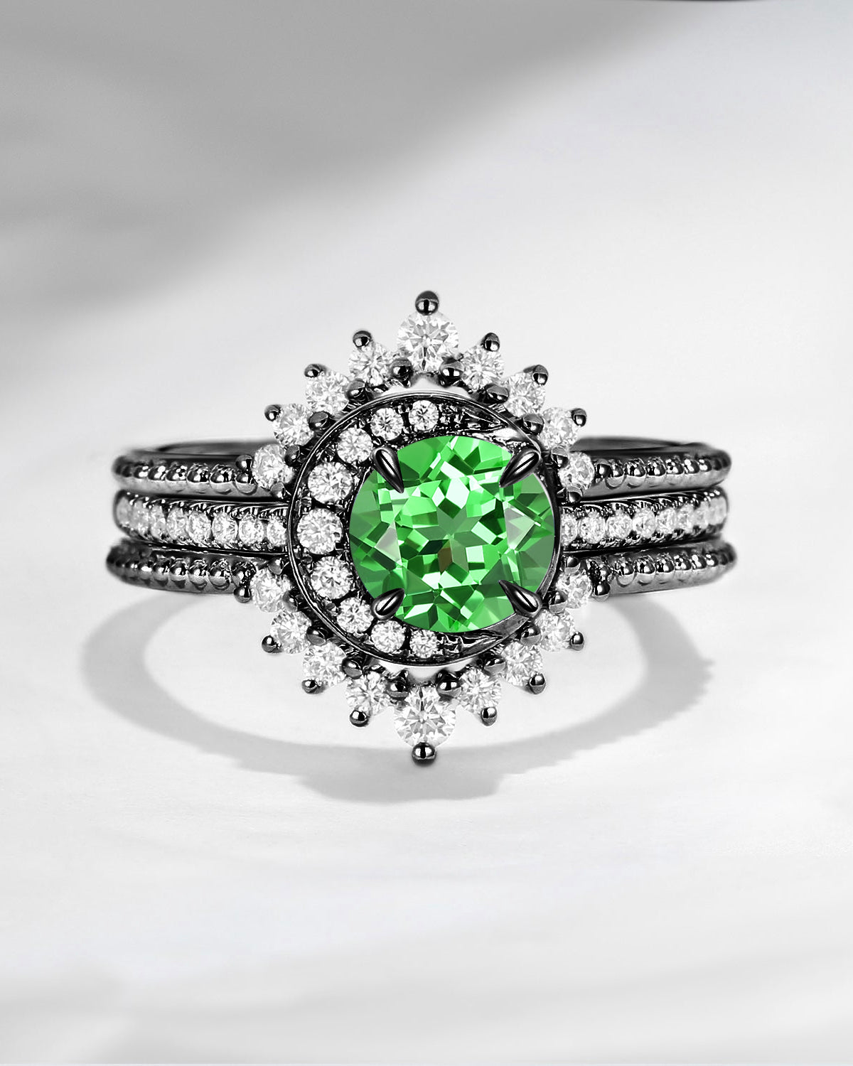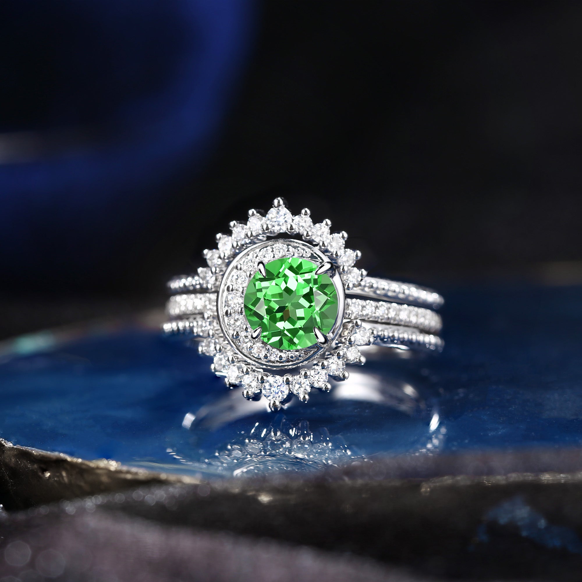 Crescent Moon | Round Lab Tsavorite Engagement Ring Set 3PCS - Full Moon