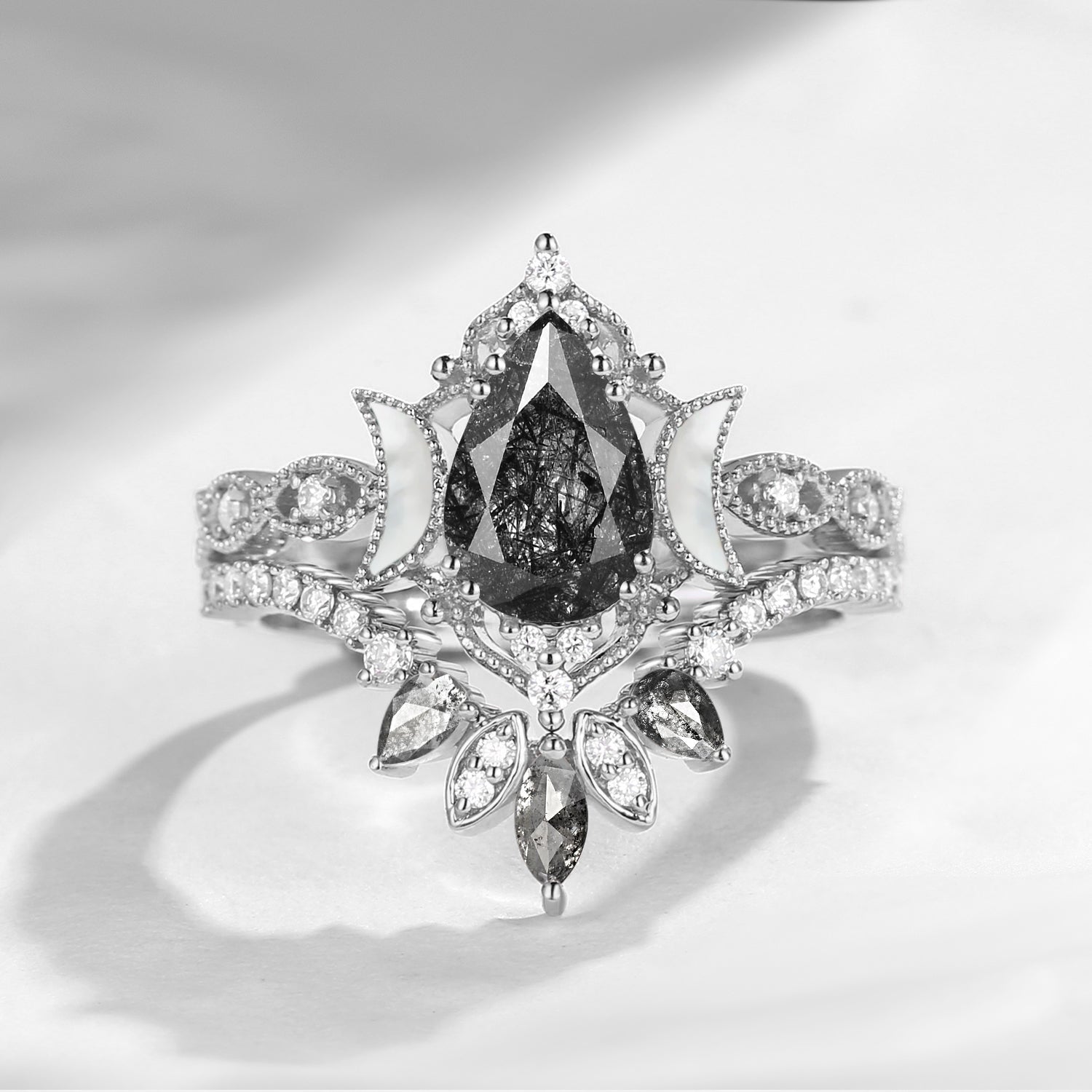 Nature Inspired Twist Coffin Cut Black Rutilated Quartz Engagement Ring Set 2pcs