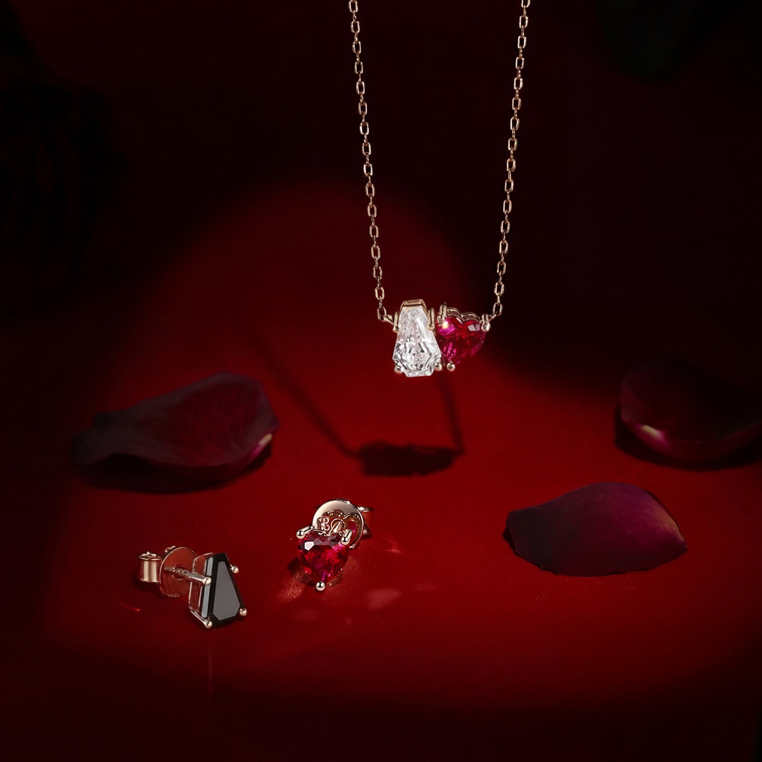 Unique Two Stone Coffin Moissanite & Heart Lab Ruby Jewelry Set - 'Toi Et Moi' Jewelry Box