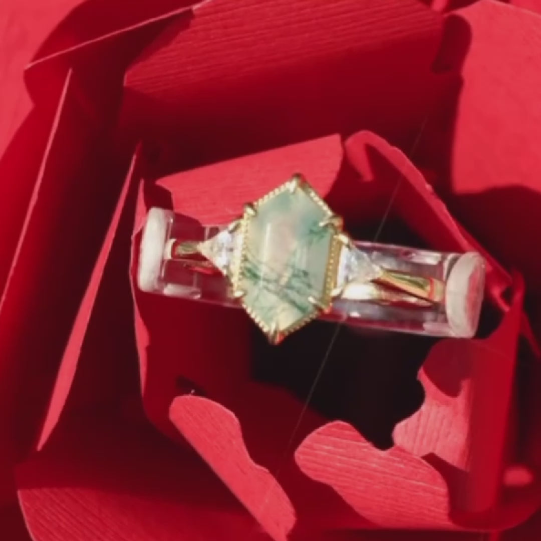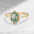 Vintage Long Hexagon Moss Agate Engagement Ring