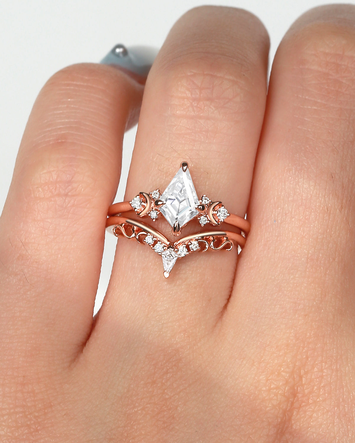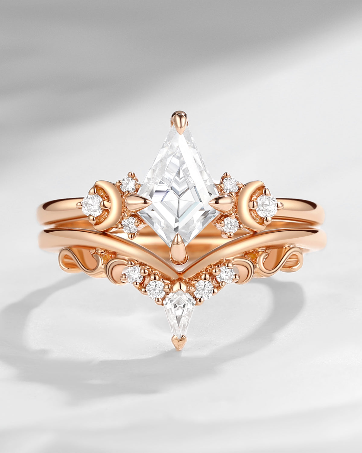 Crescent Moon | Kite Shaped Art Deco Moissanite Engagement Ring Set 2pcs