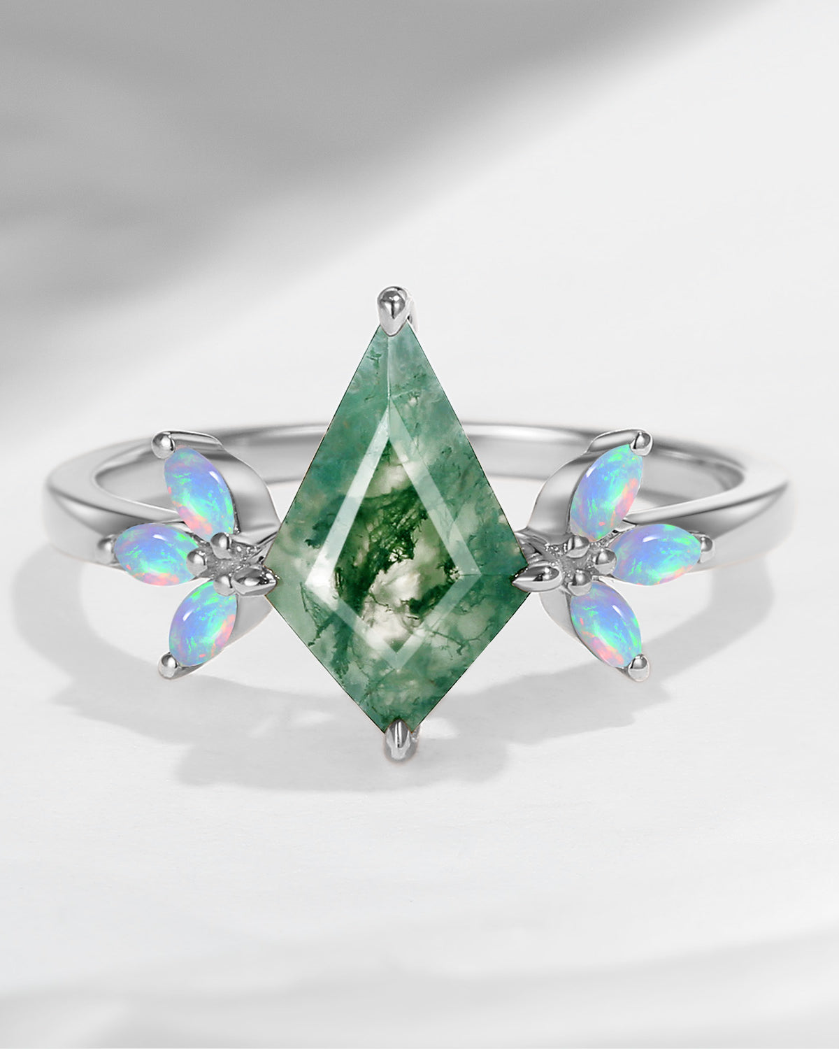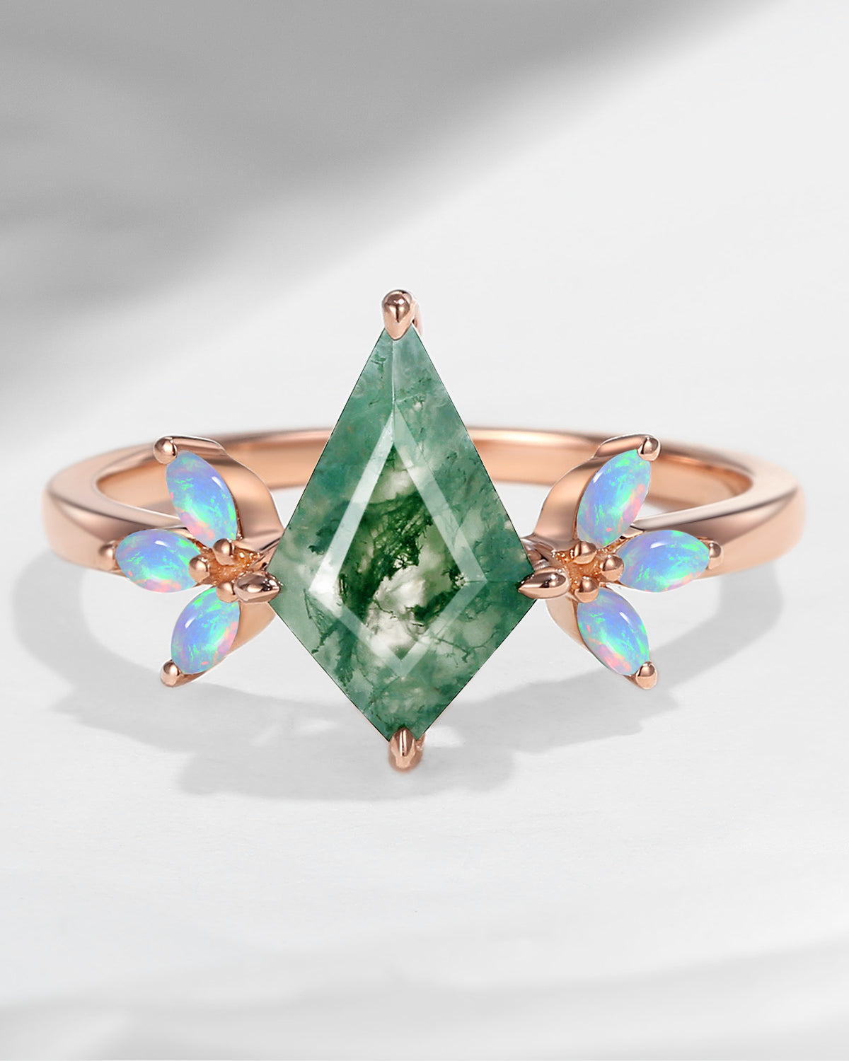 Kite Shaped Moss Agate & Natural Opal Butterfly Cluster Engagement Ring