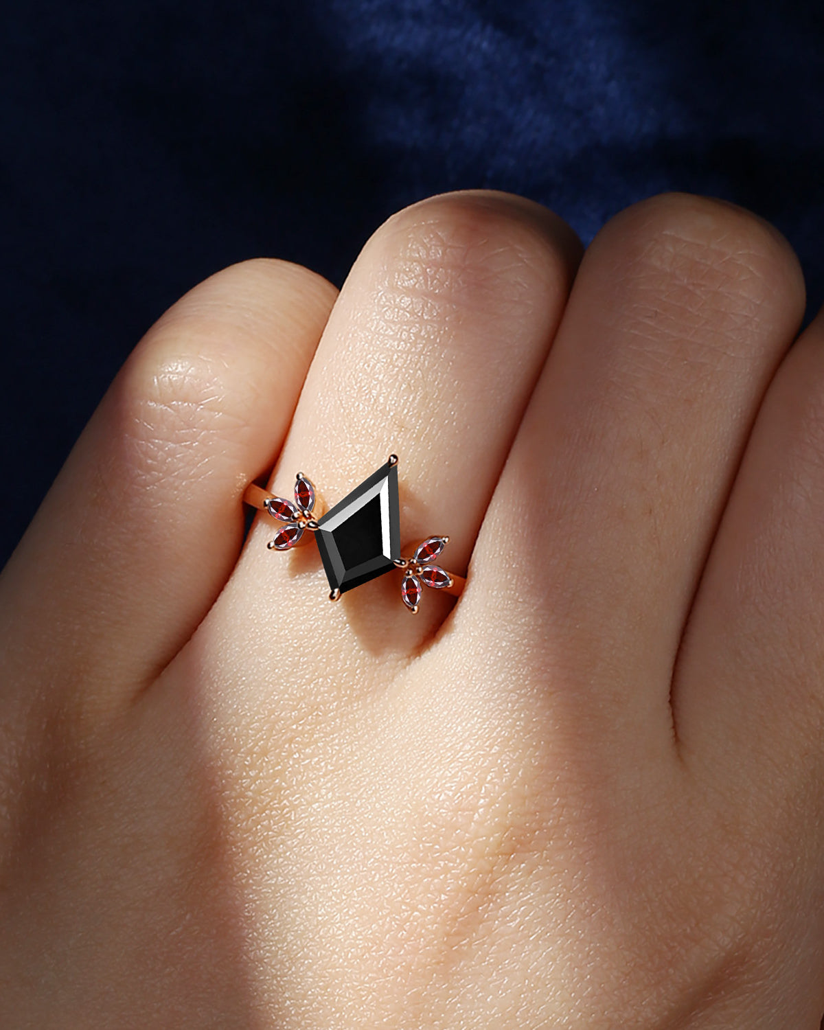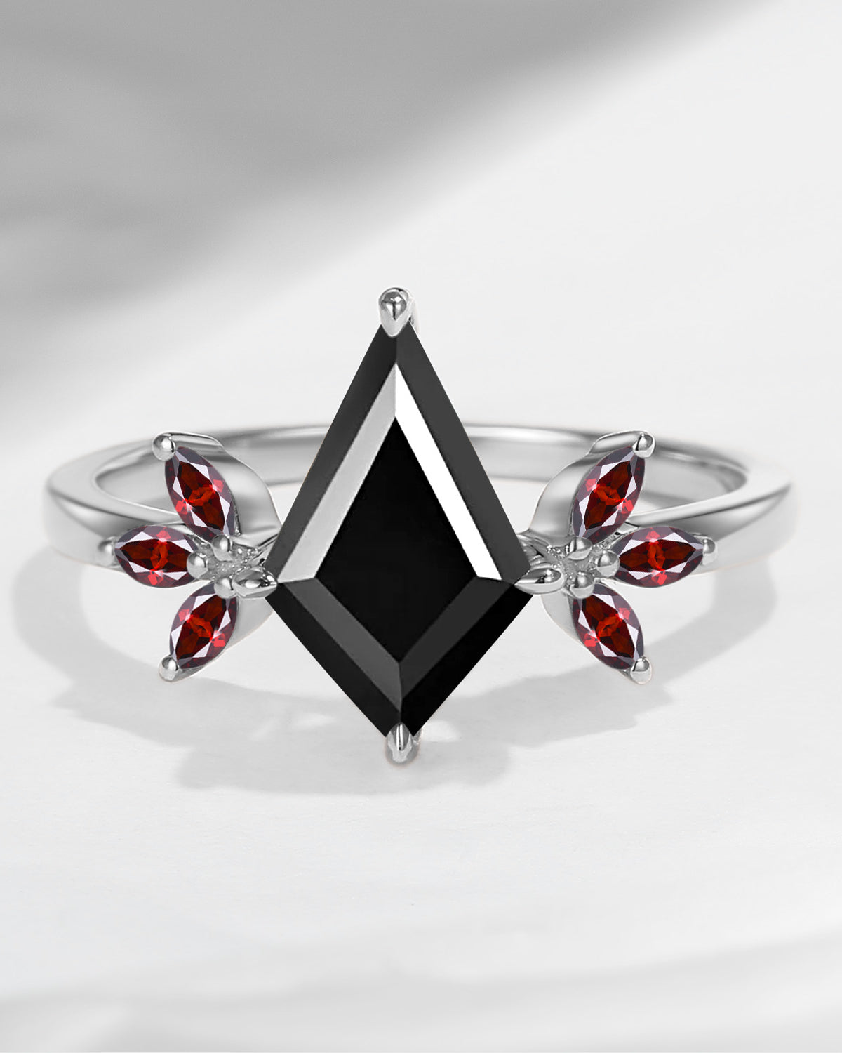 Kite Shaped Black Moissanite & Garnet Butterfly Cluster Engagement Ring