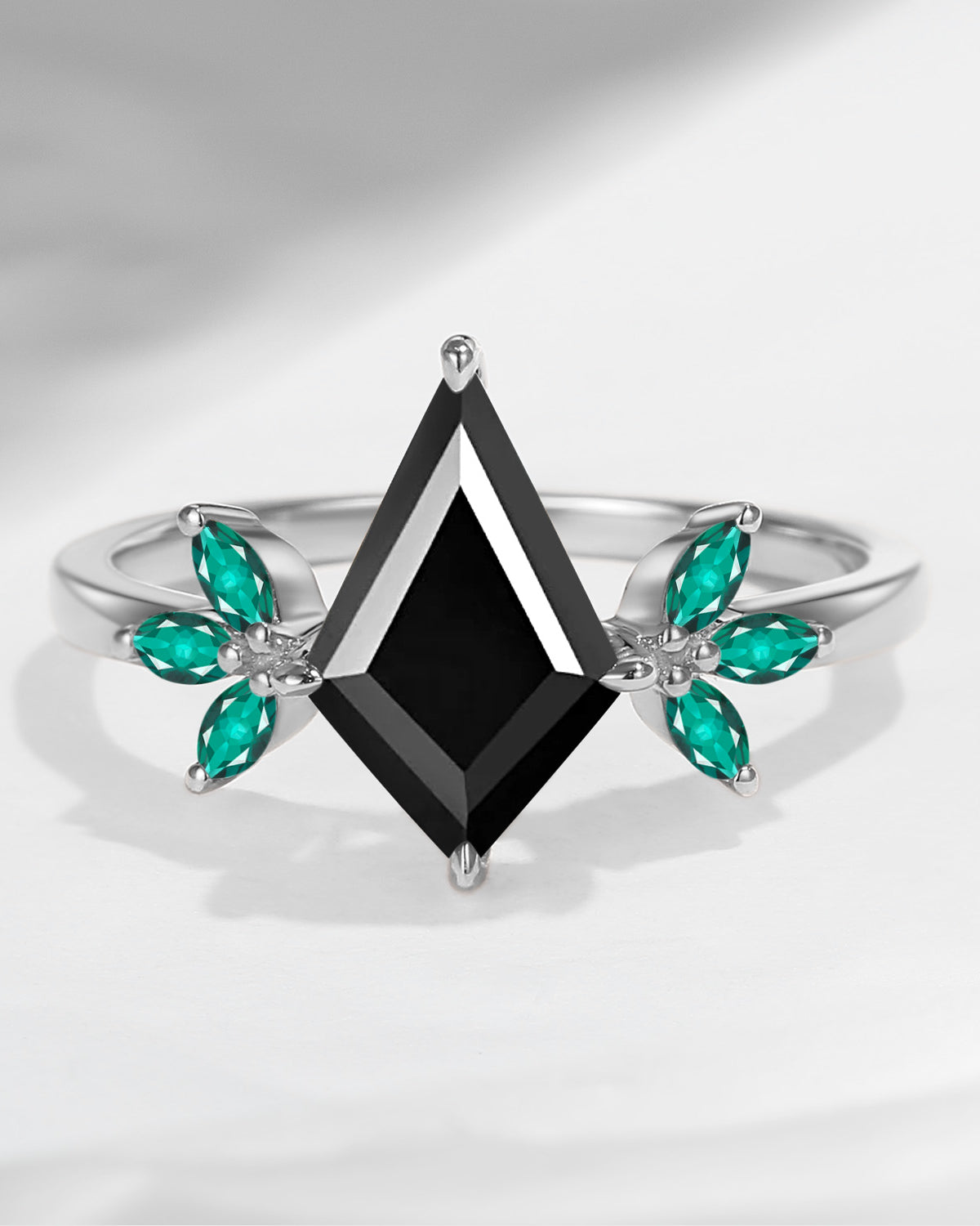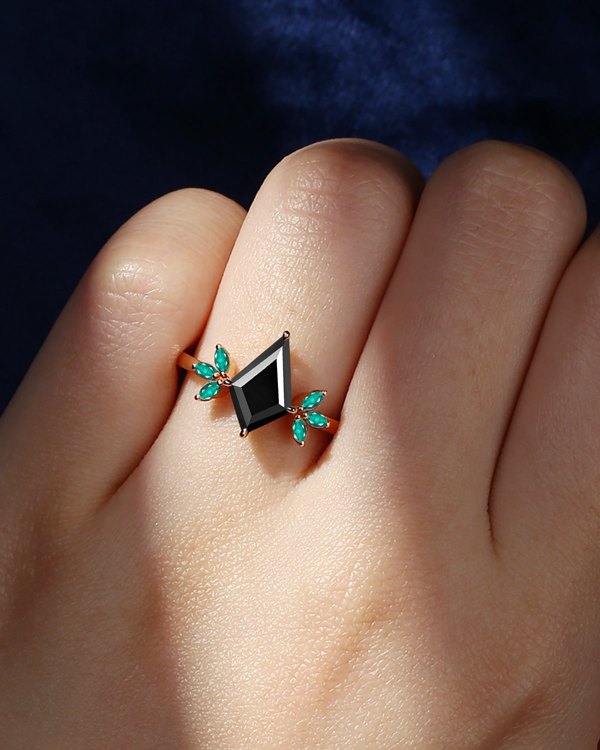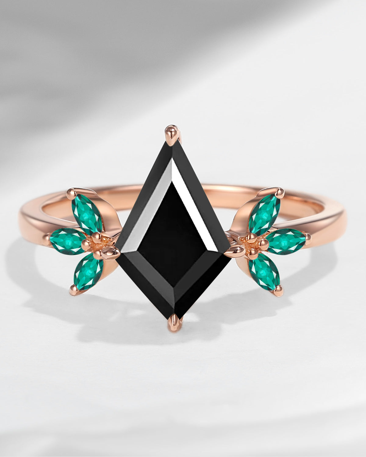 Kite Shaped Black Moissanite & Emerald Butterfly Cluster Engagement Ring