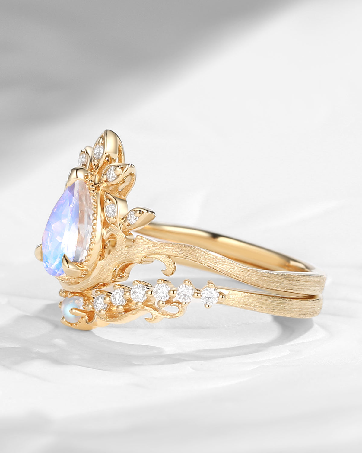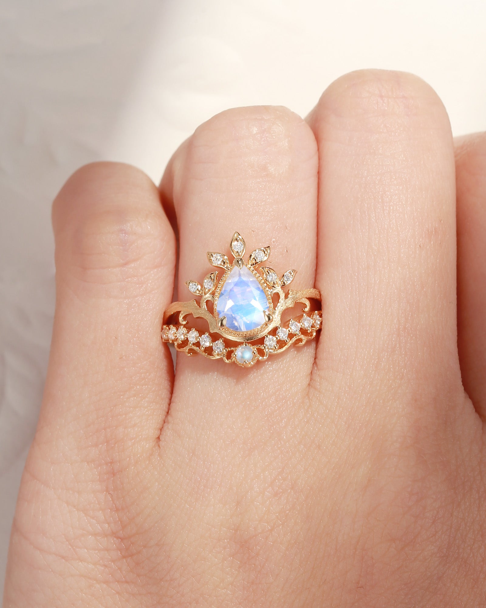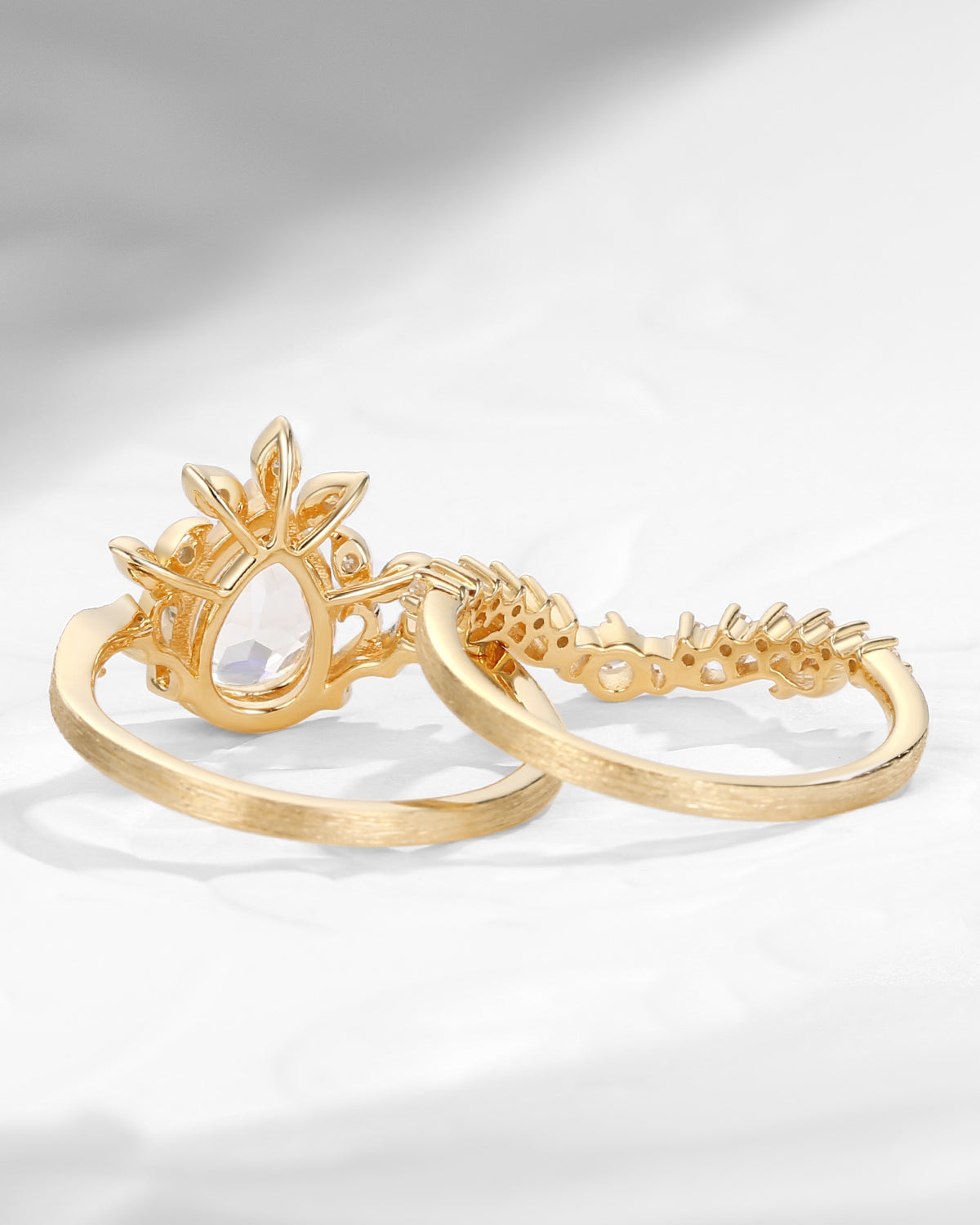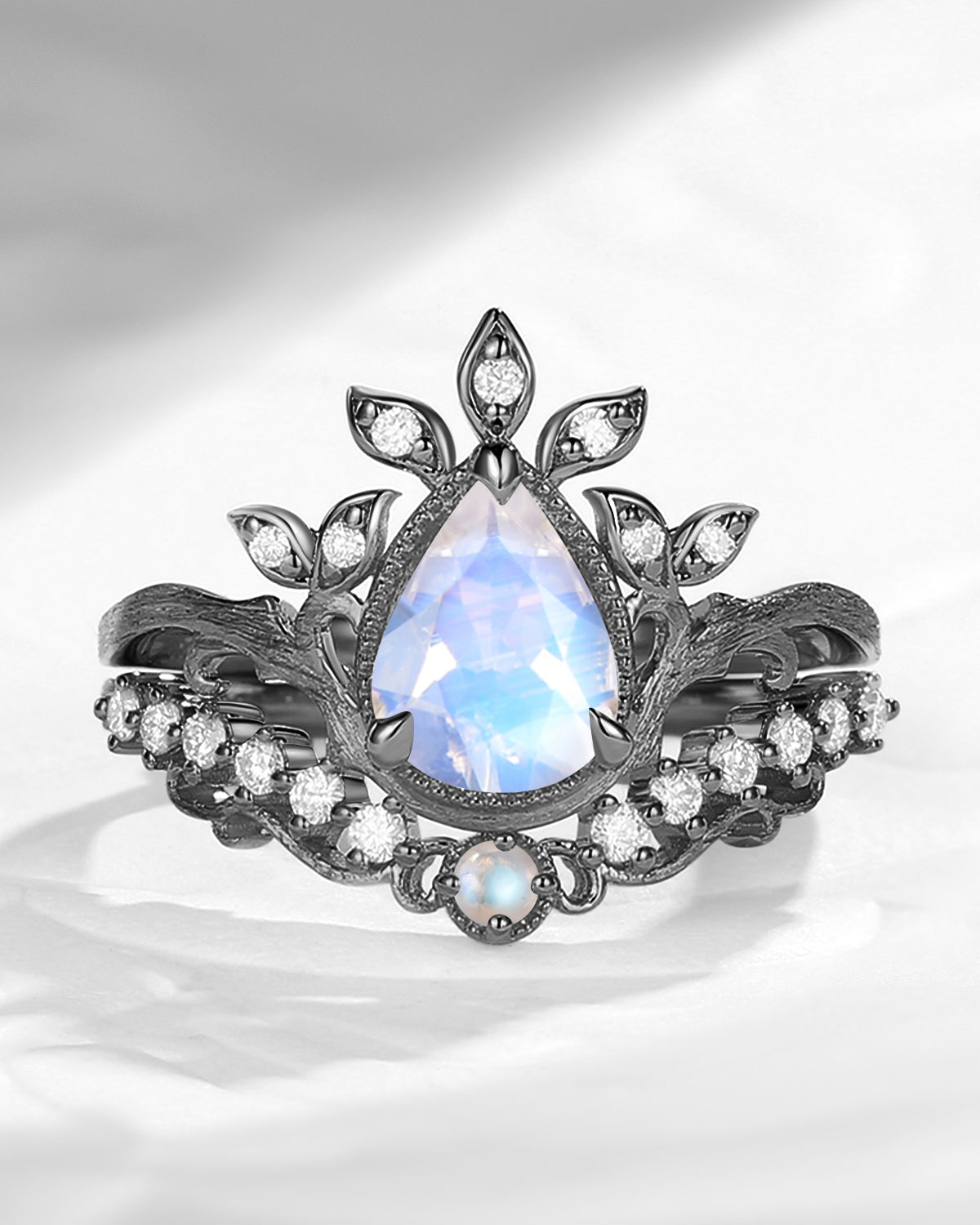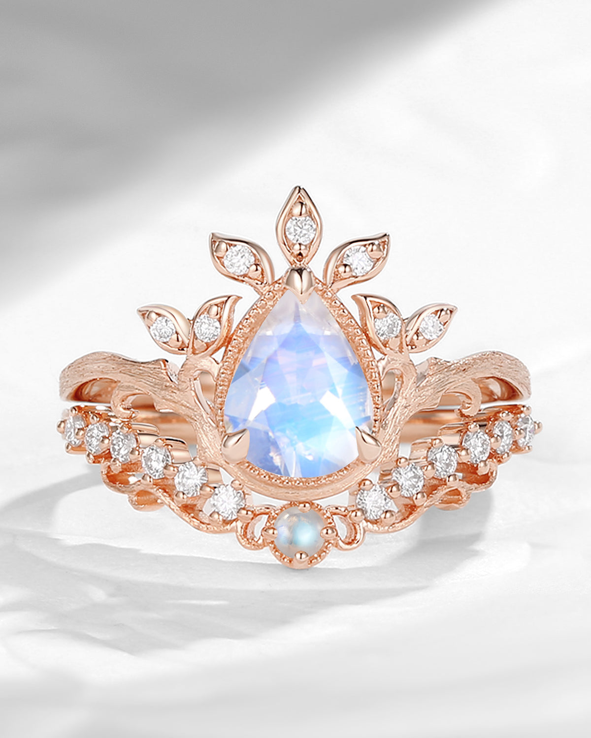 Nature Inspired Vintage Pear Shaped Moonstone Garden Ring Set 2pcs