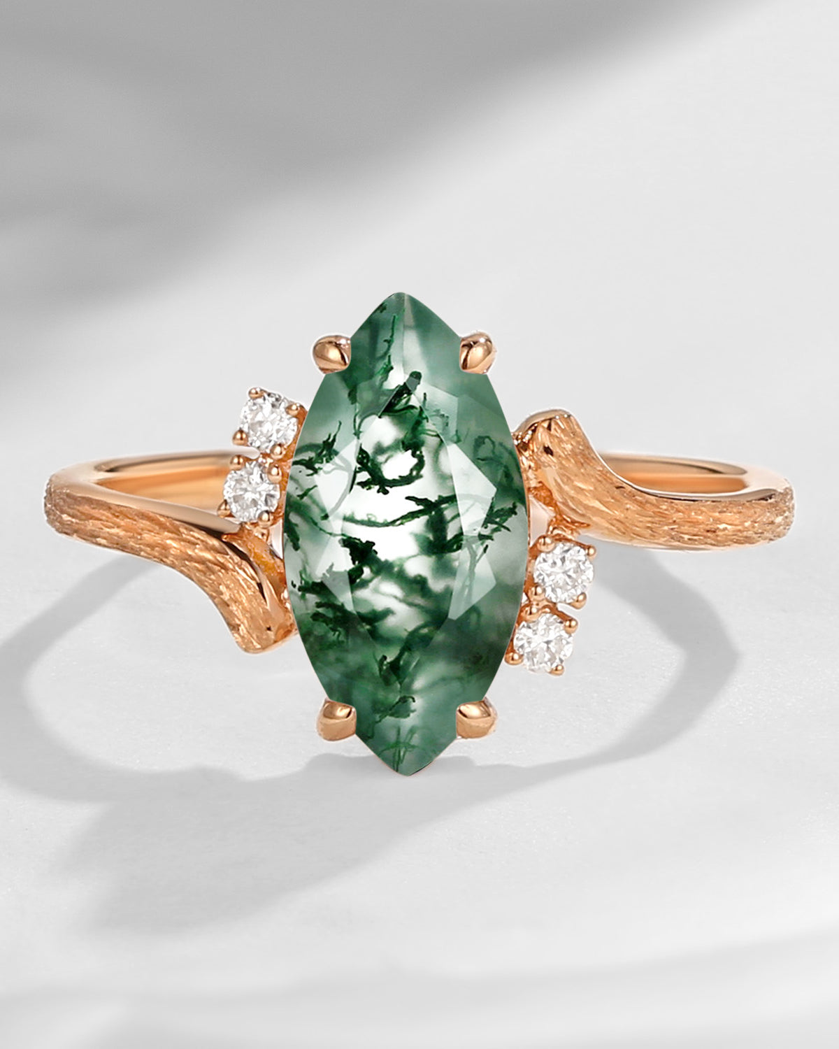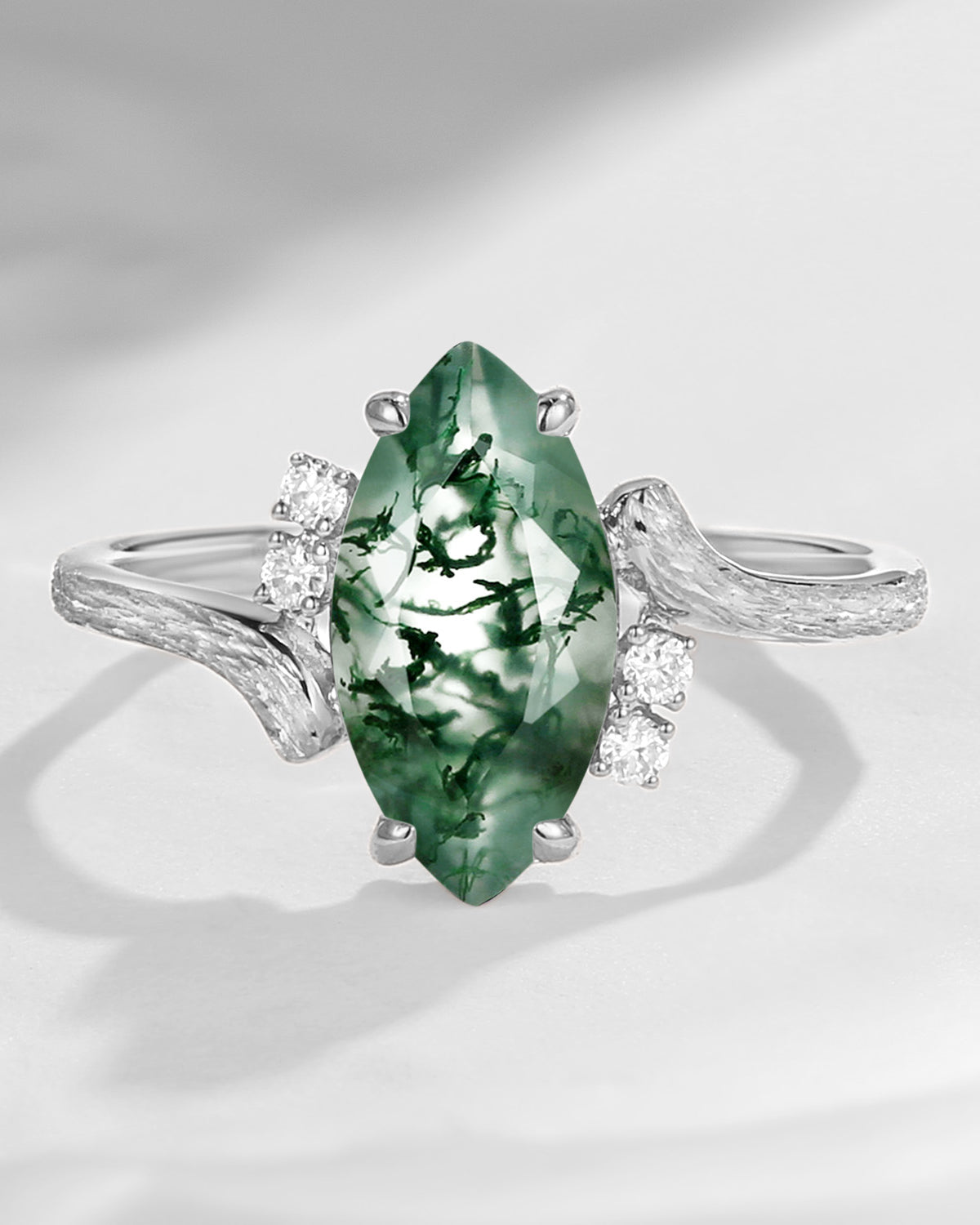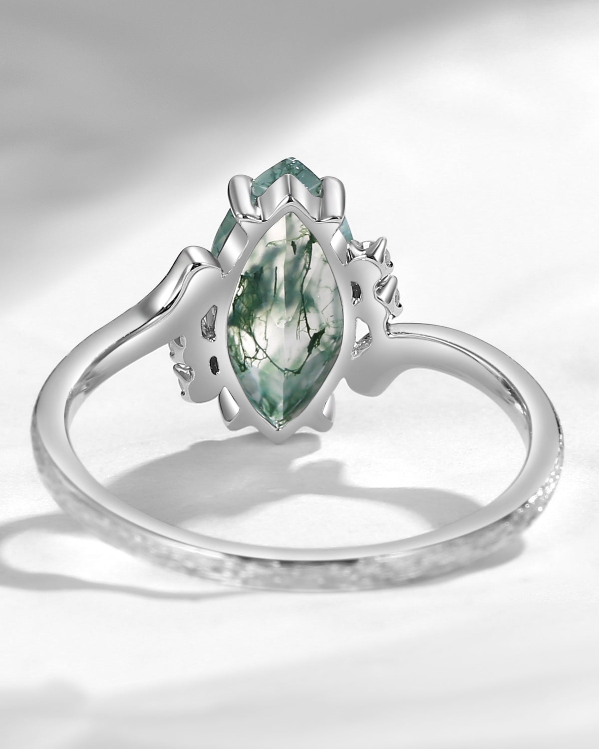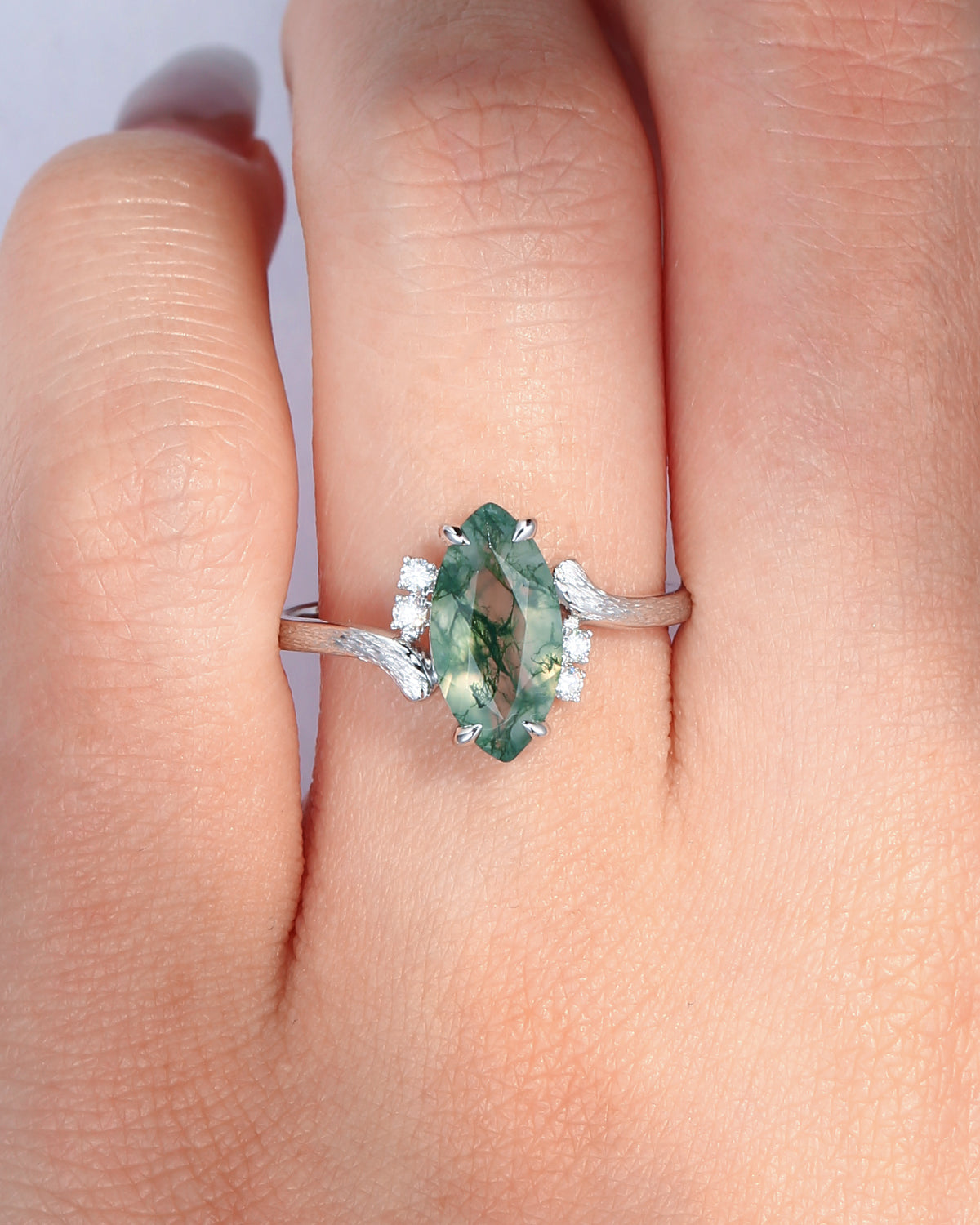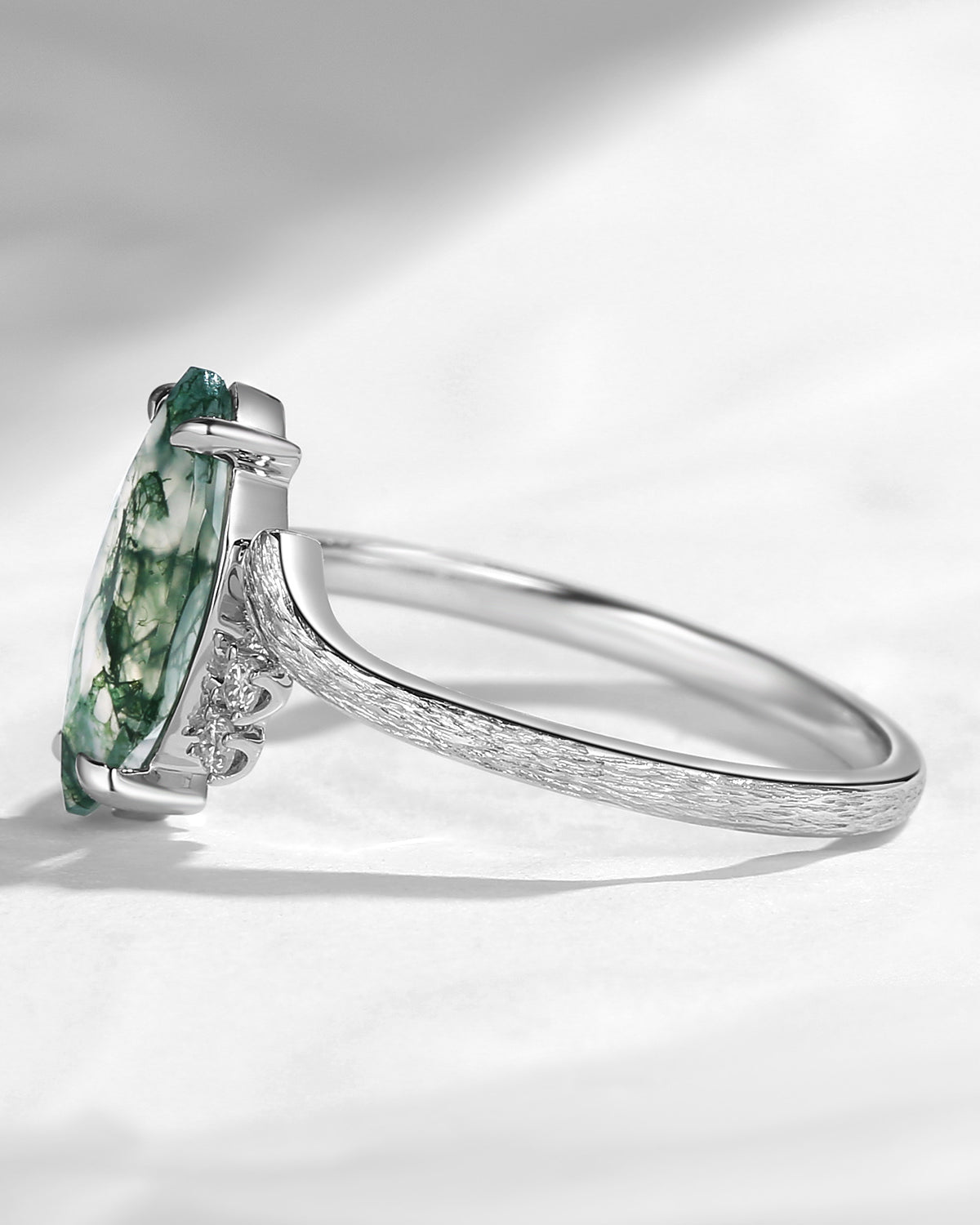 Crescent Moon | Unique Pear Shaped Moss Agate Engagement Ring