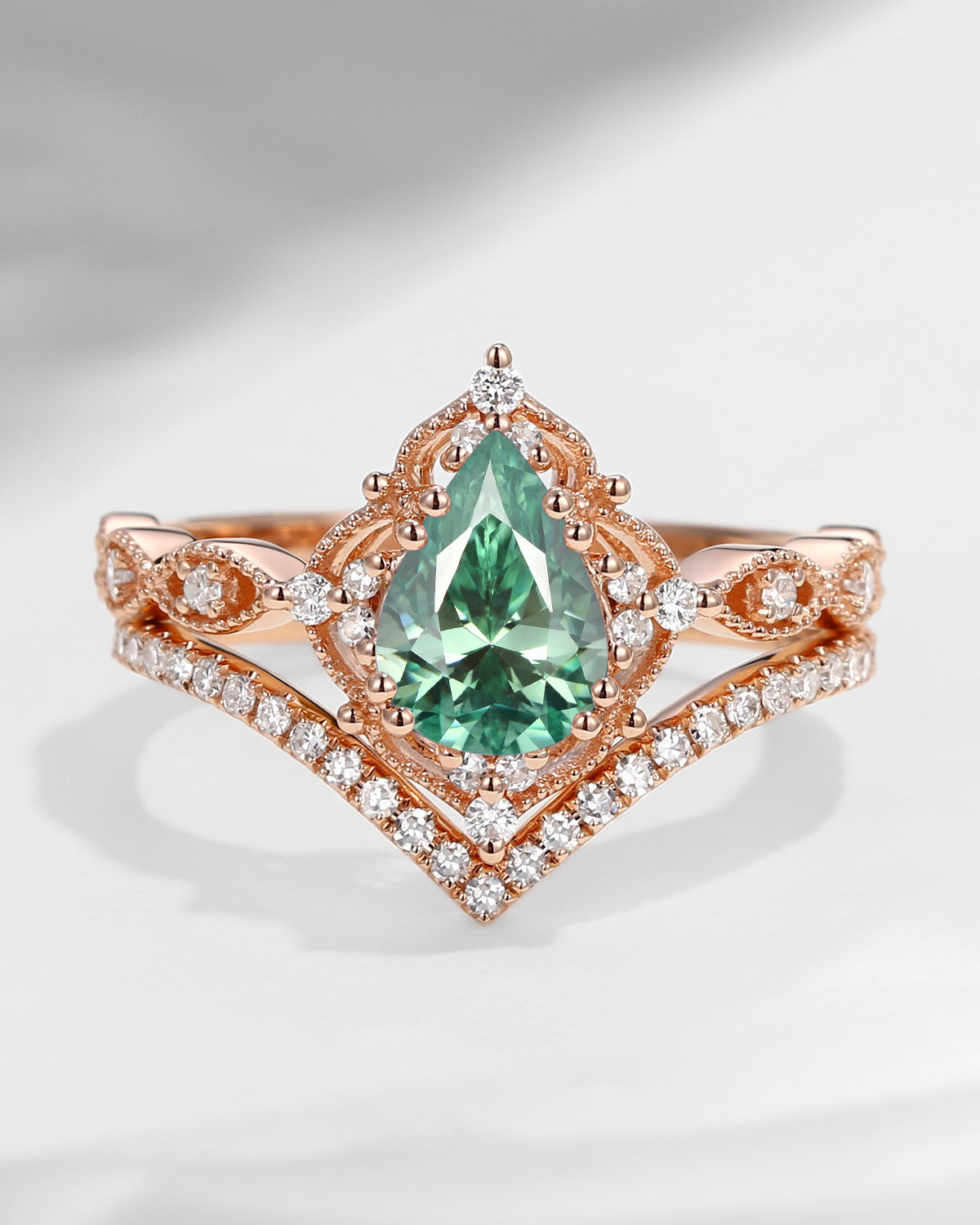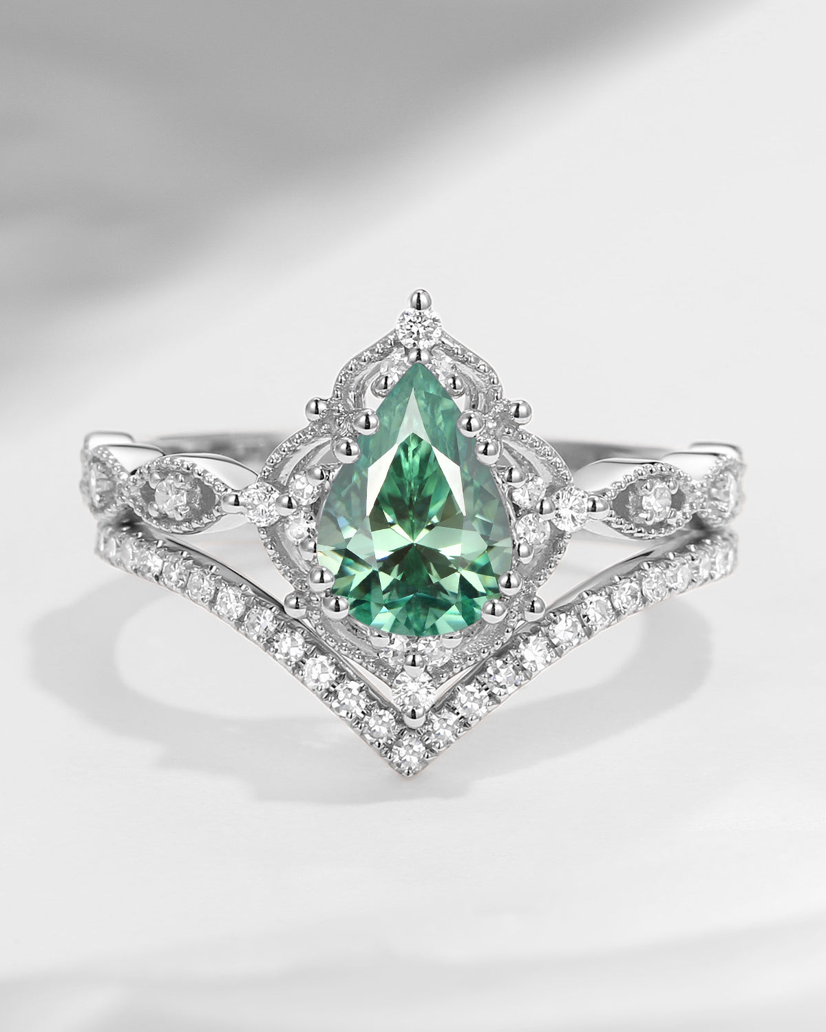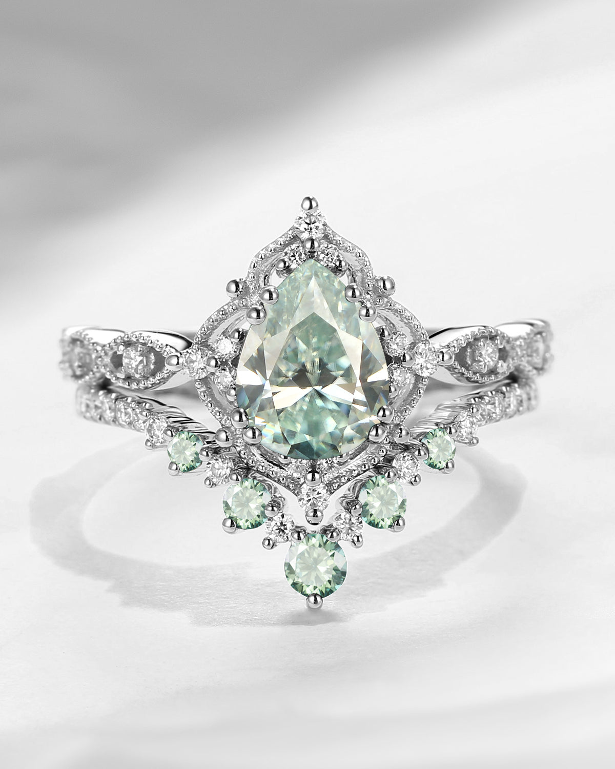 Antique Pear Cut Mint Moissanite Engagement Ring 2pcs