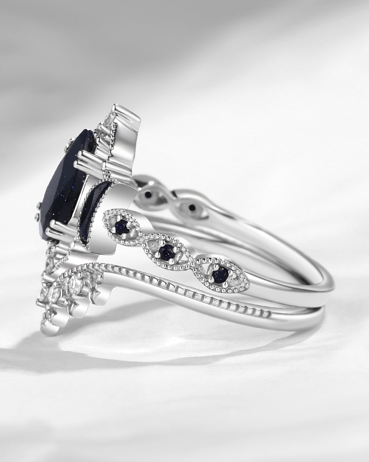 Heart Shaped Blue Sandstone Vintage Bridal Set 2pcs - Bat Ring