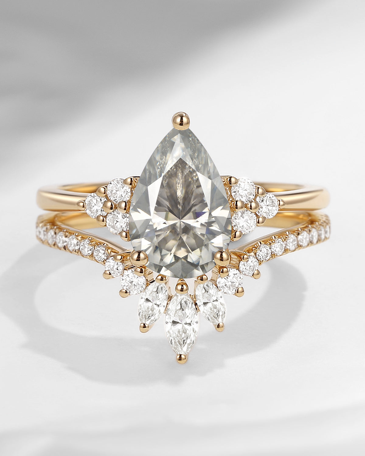Pear Cut Grey Moissanite Cluster Engagement Ring Set 2pcs - Vivian