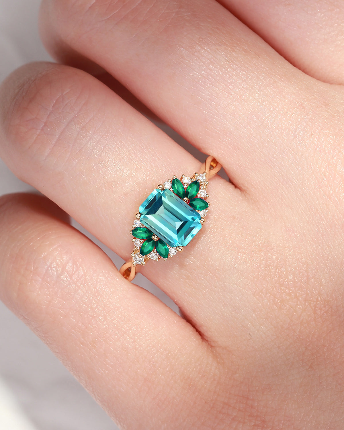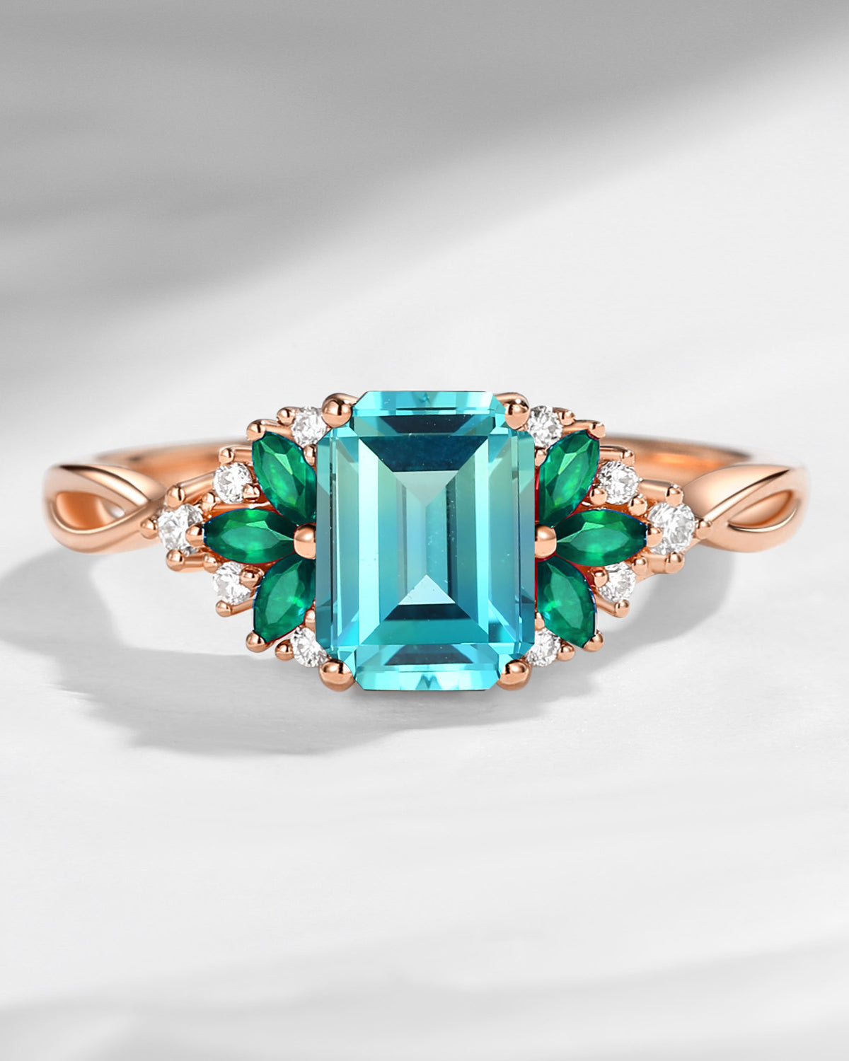 Cluster Emerald Cut Lab Paraiba & Emerald Twist Engagement Ring