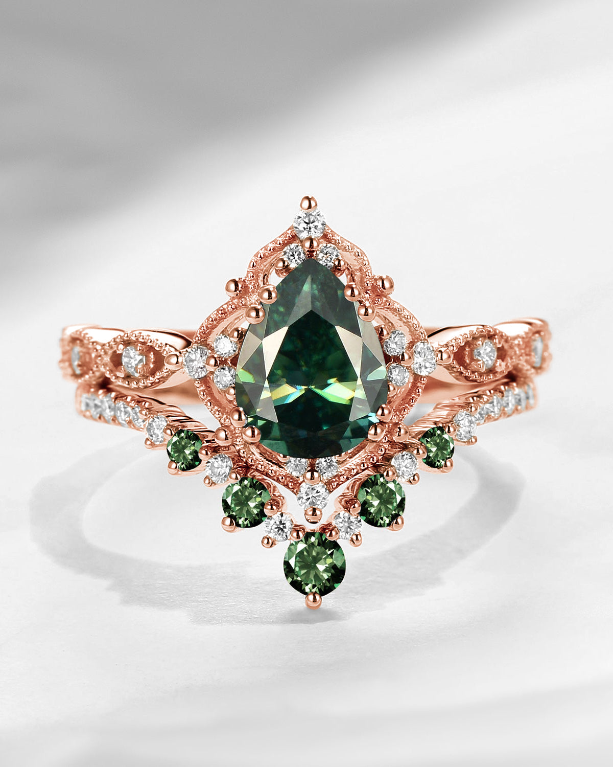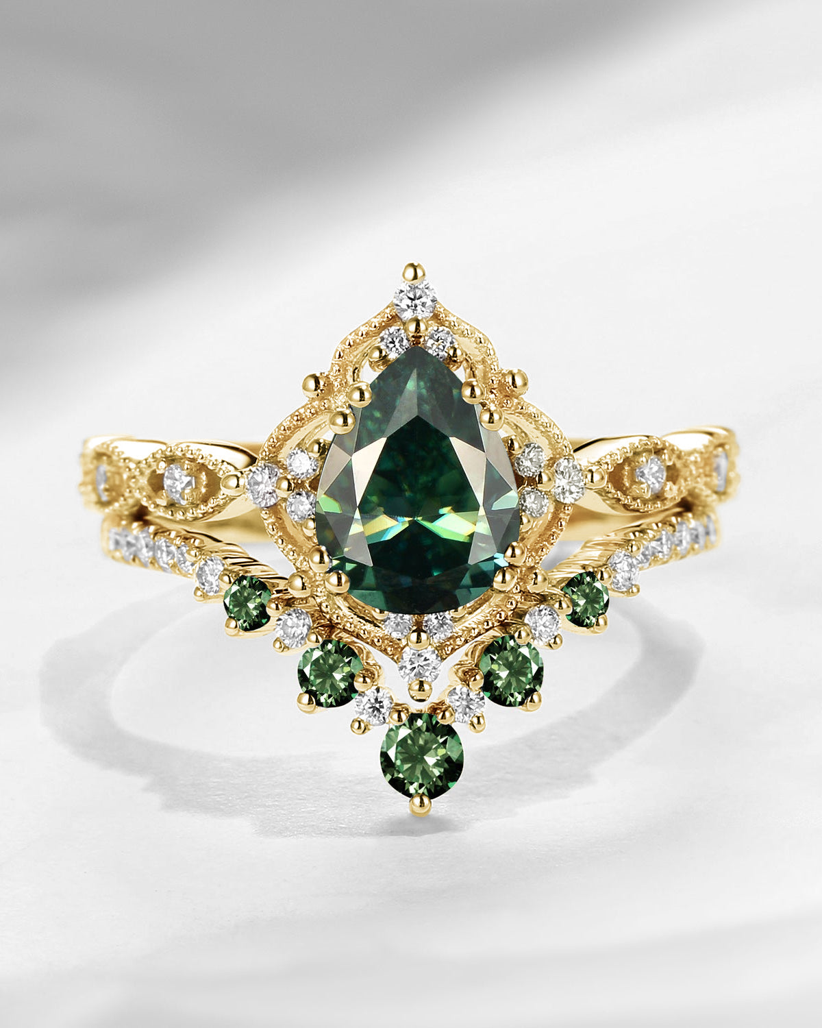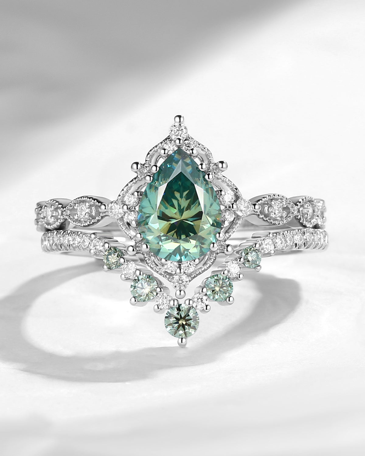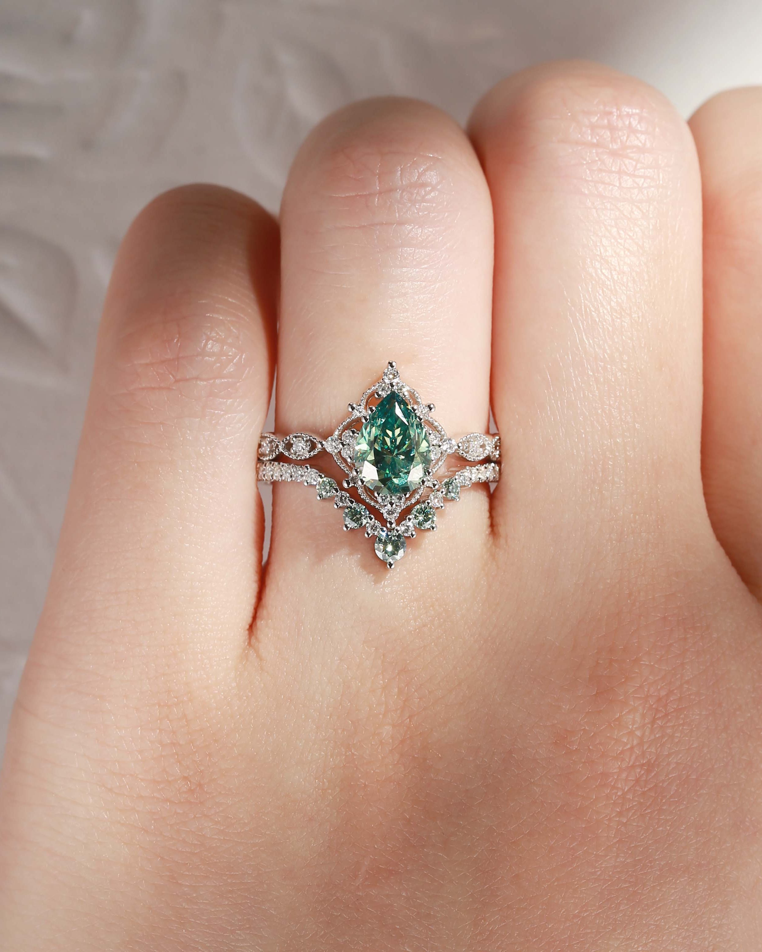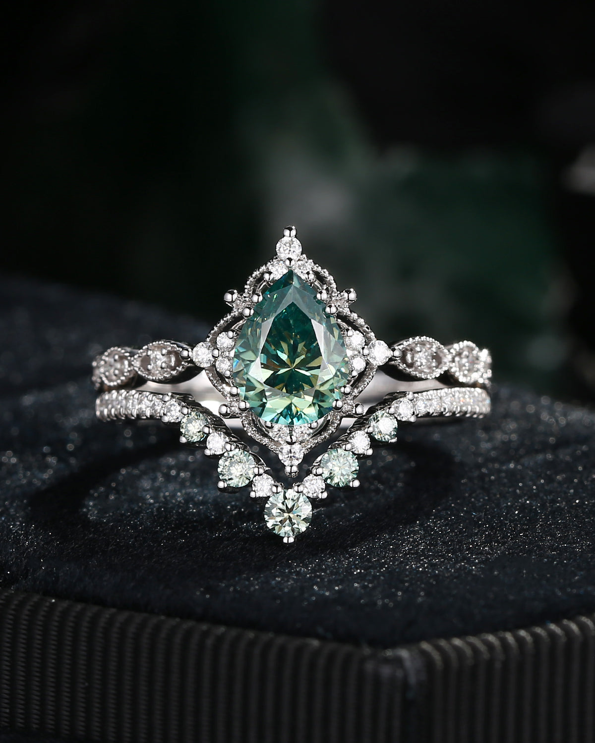 Antique Pear Cut Teal Moissanite Engagement Ring 2pcs