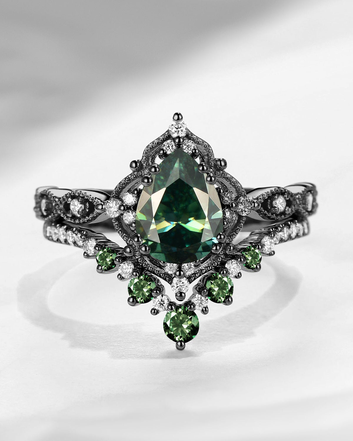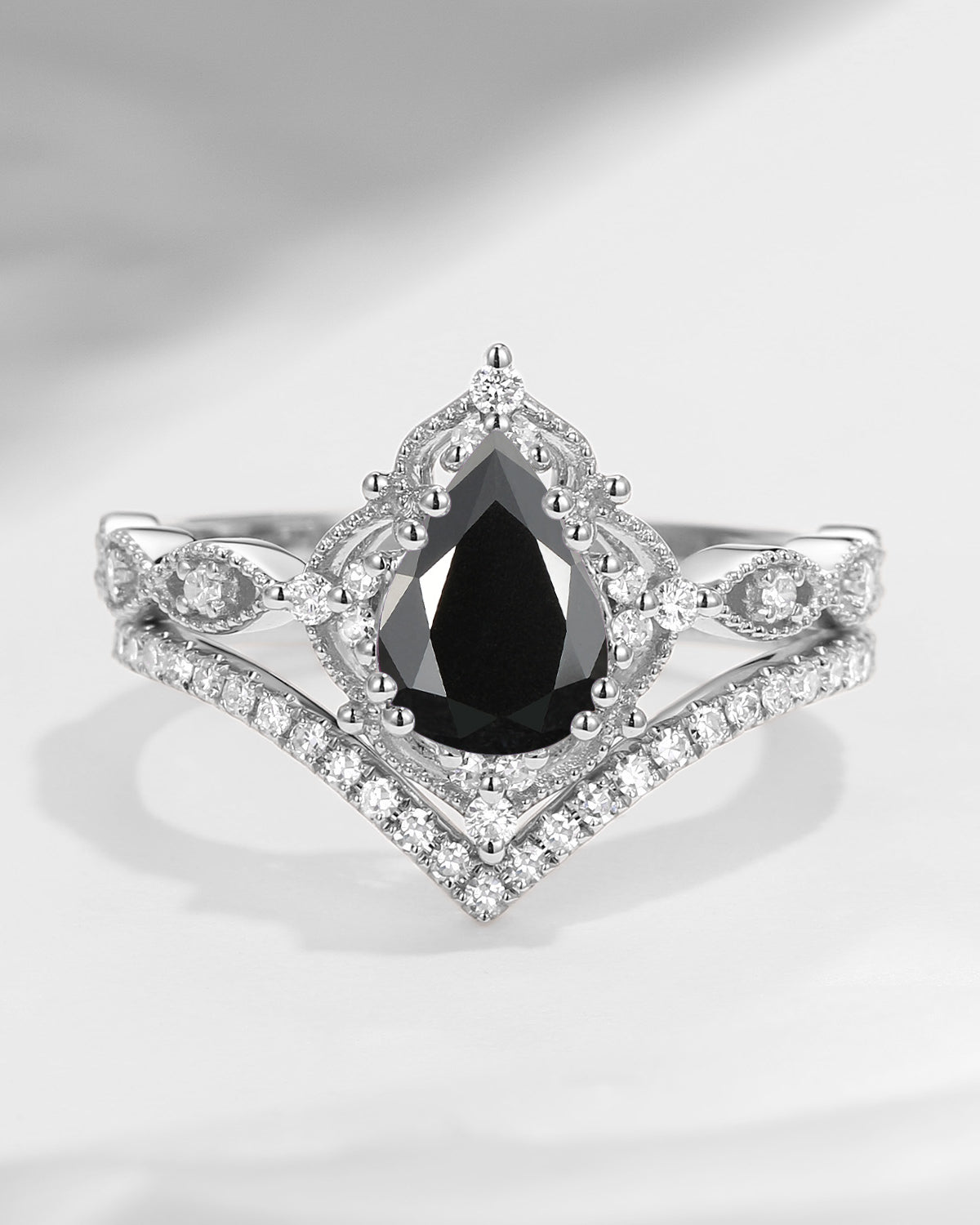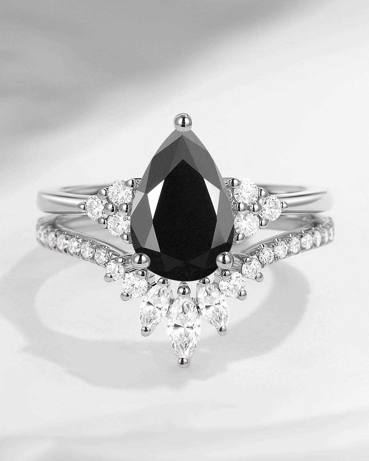 Pear Shaped Black Moissanite Engagement Ring Set 2pcs - Evelyn