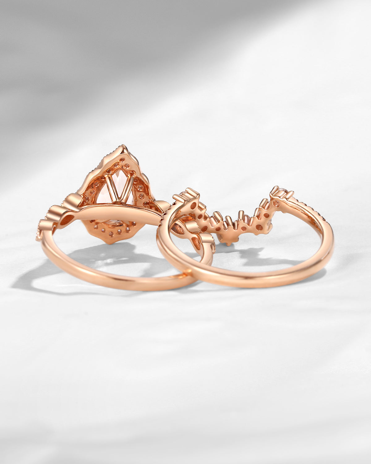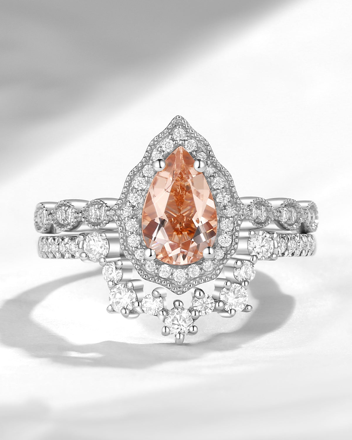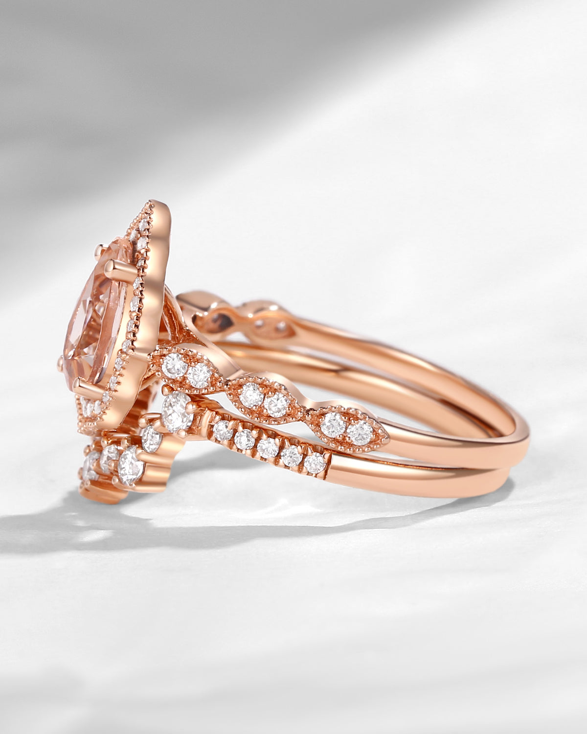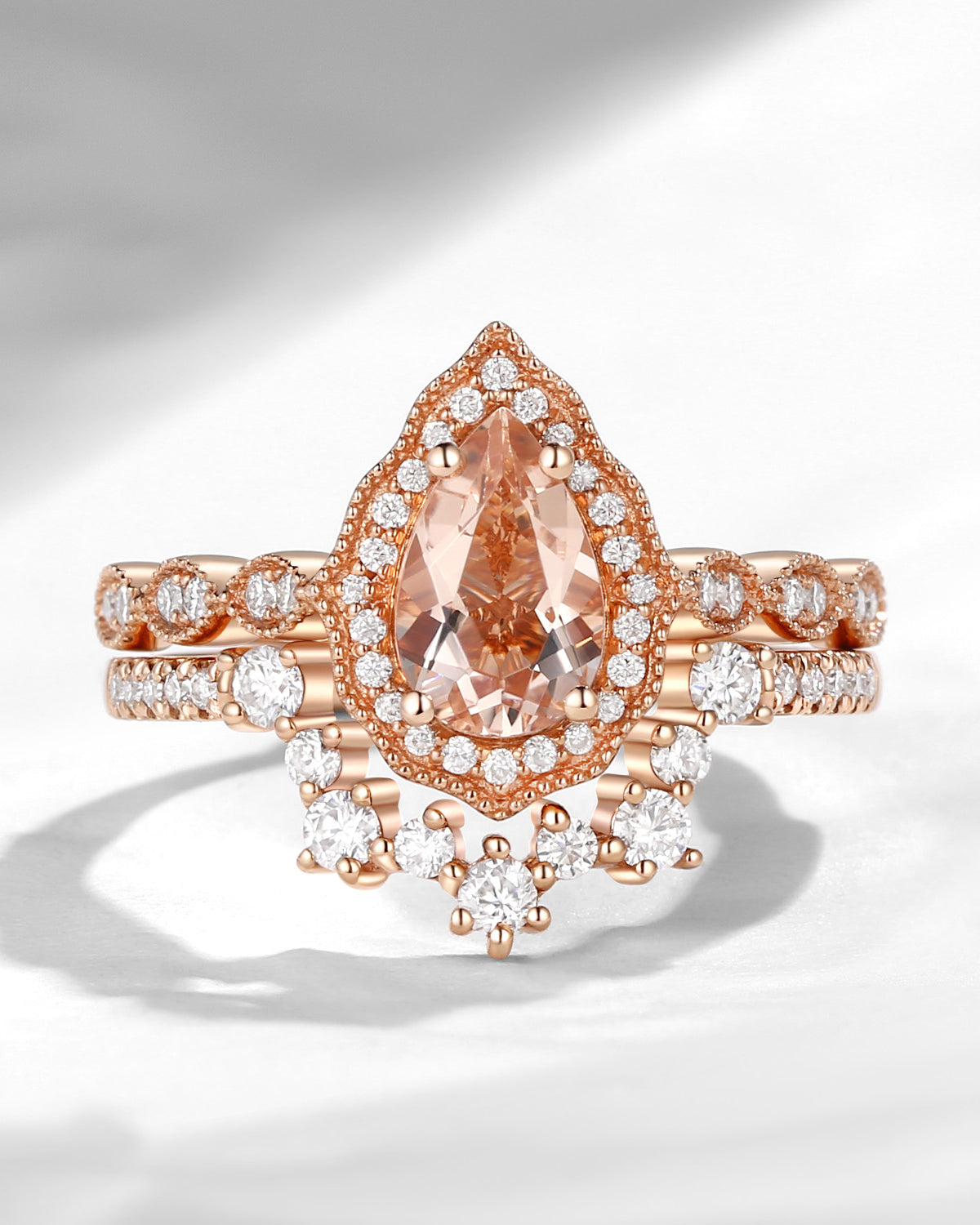 Vintage Inspired Pear Shaped Morganite Halo Engagement Ring Set 2pcs