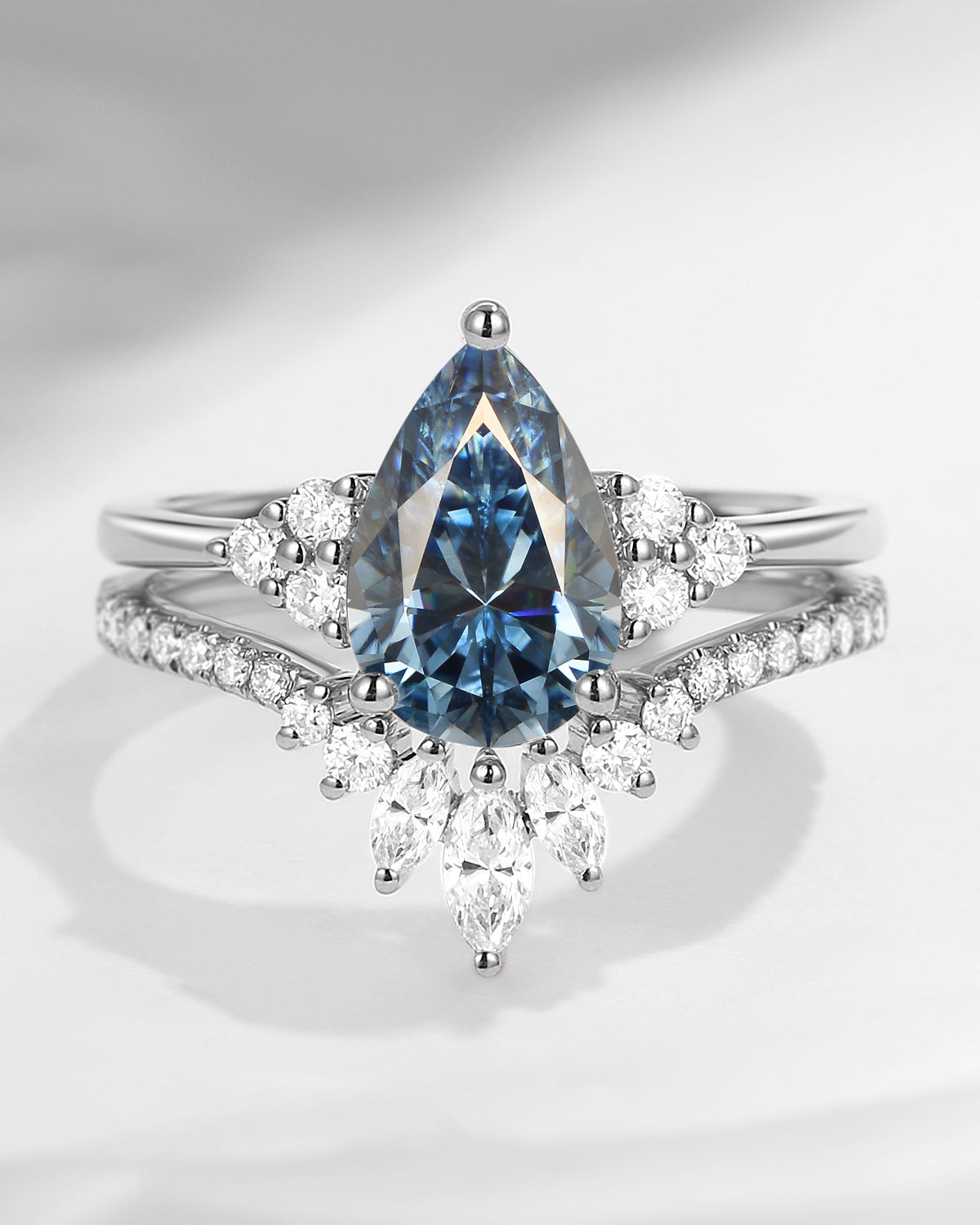 Pear Cut Blue Moissanite Cluster Engagement Ring Set 2pcs - Vivian