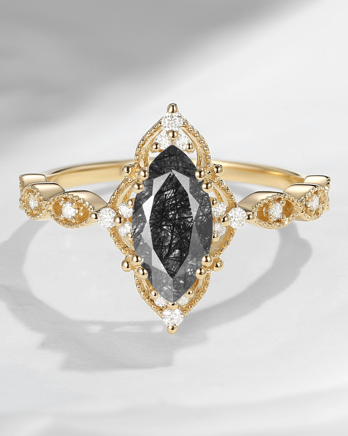18K Unique Marquise Black Rutilated Quartz Vintage Inspired Engagement Ring