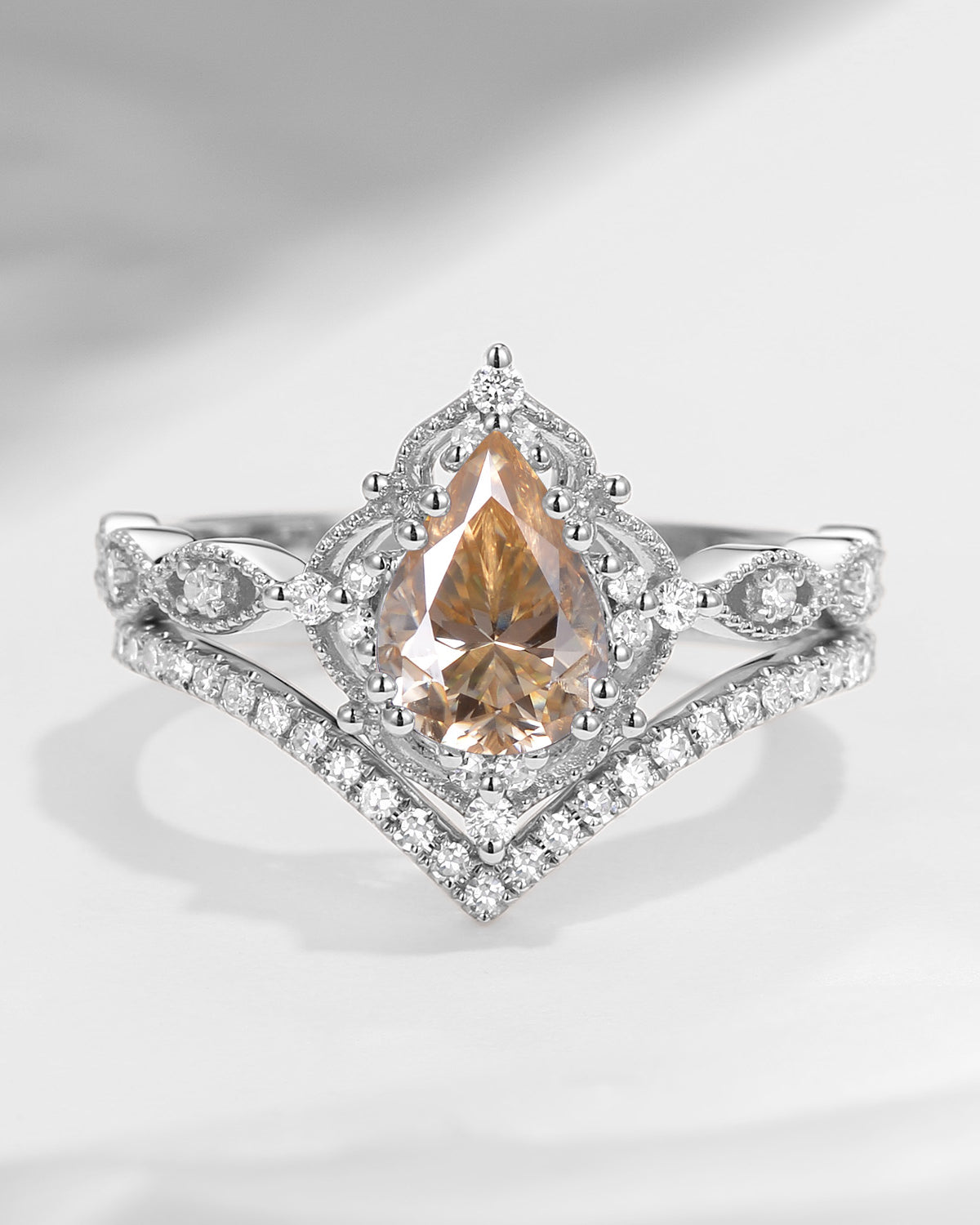 Pear Shaped Yellow Moissanite Engagement Ring Set 2pcs - Evelyn