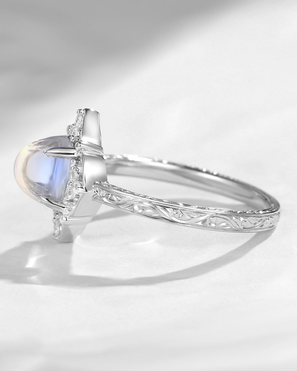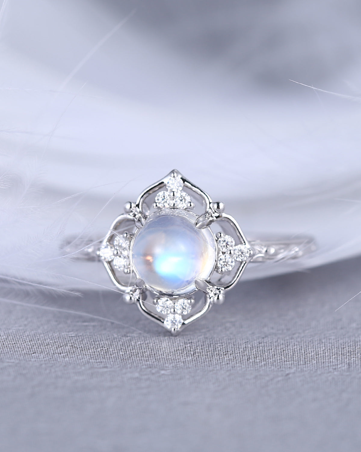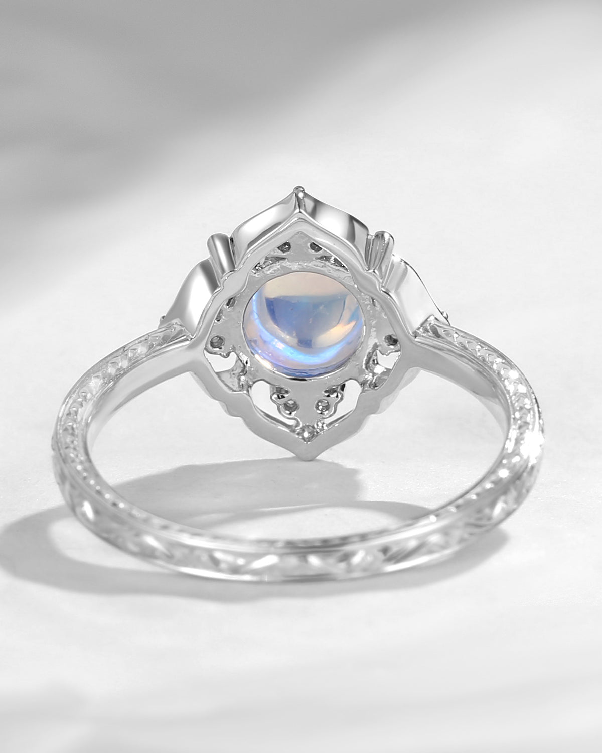 Filigree Cabochon Round Cut Moonstone Flower Engagement Ring