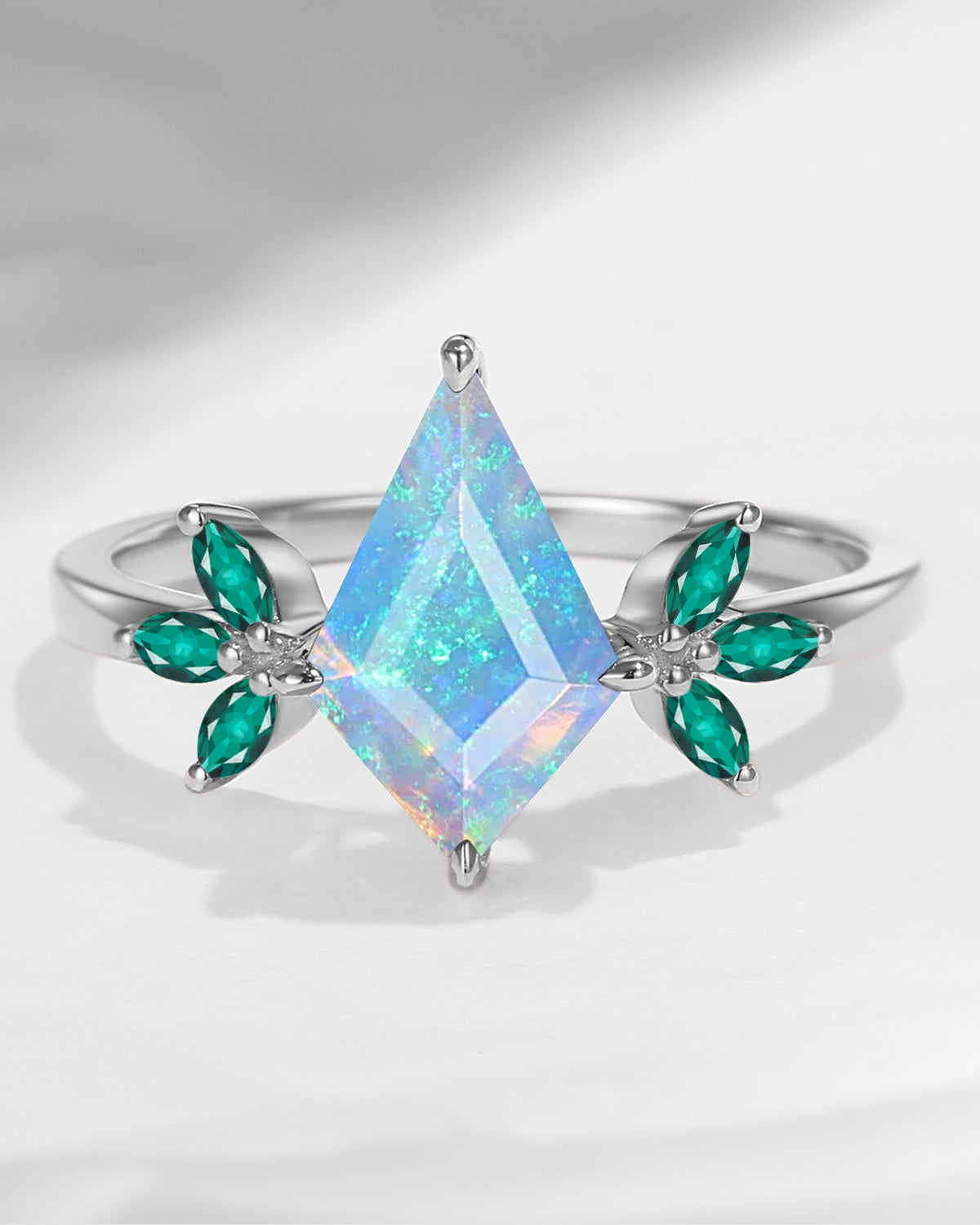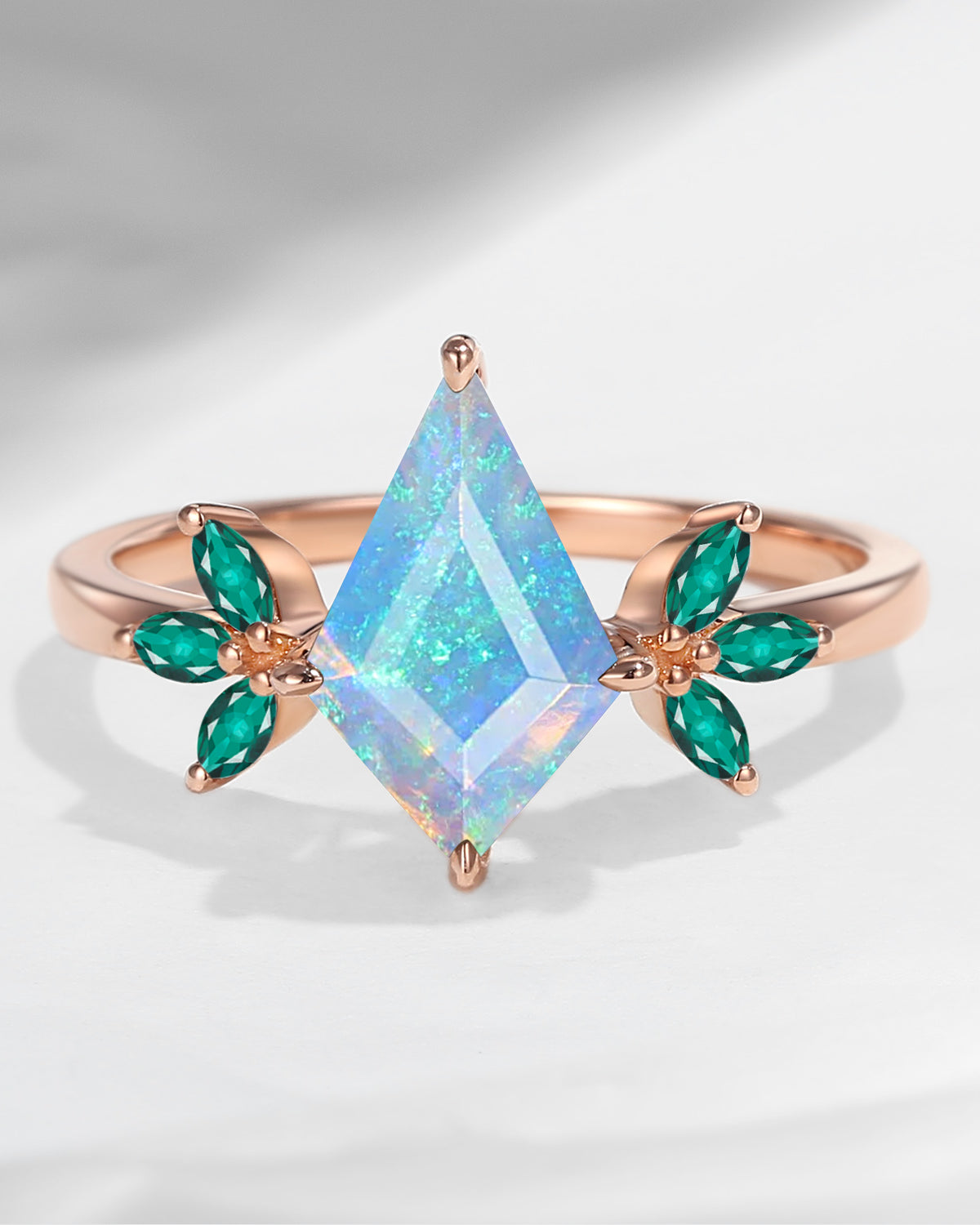 Unique Kite Shaped Natural Opal & Emerald Butterfly Engagement Ring