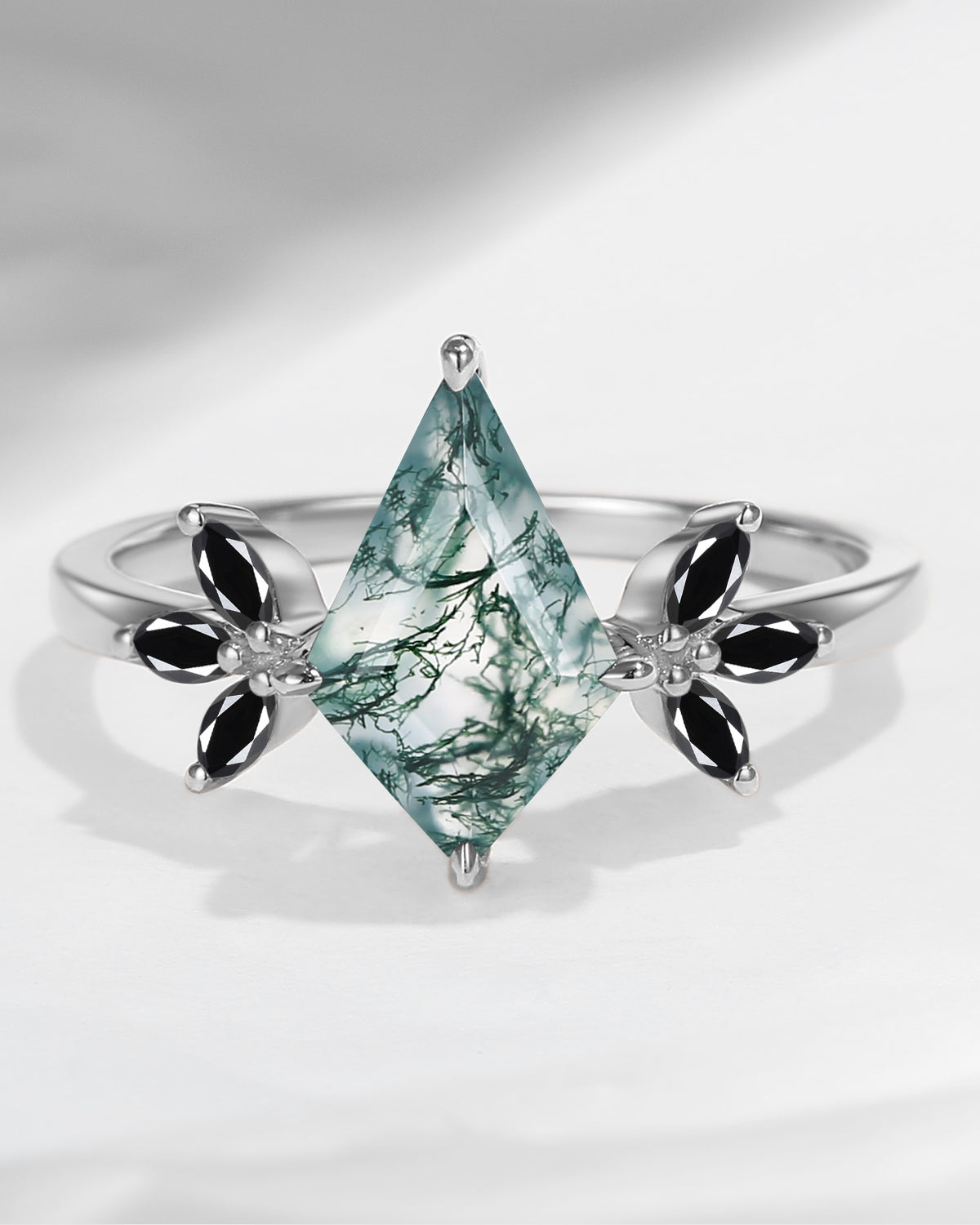 Unique Kite Shaped Moss Agate & Black Moissanite Butterfly Engagement Ring