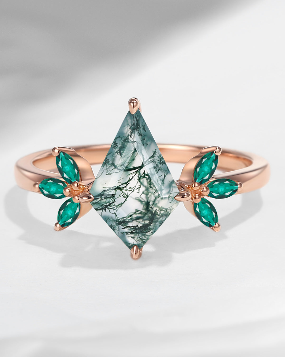 Unique Kite Shaped Moss Agate & Emerald Butterfly Engagement Ring