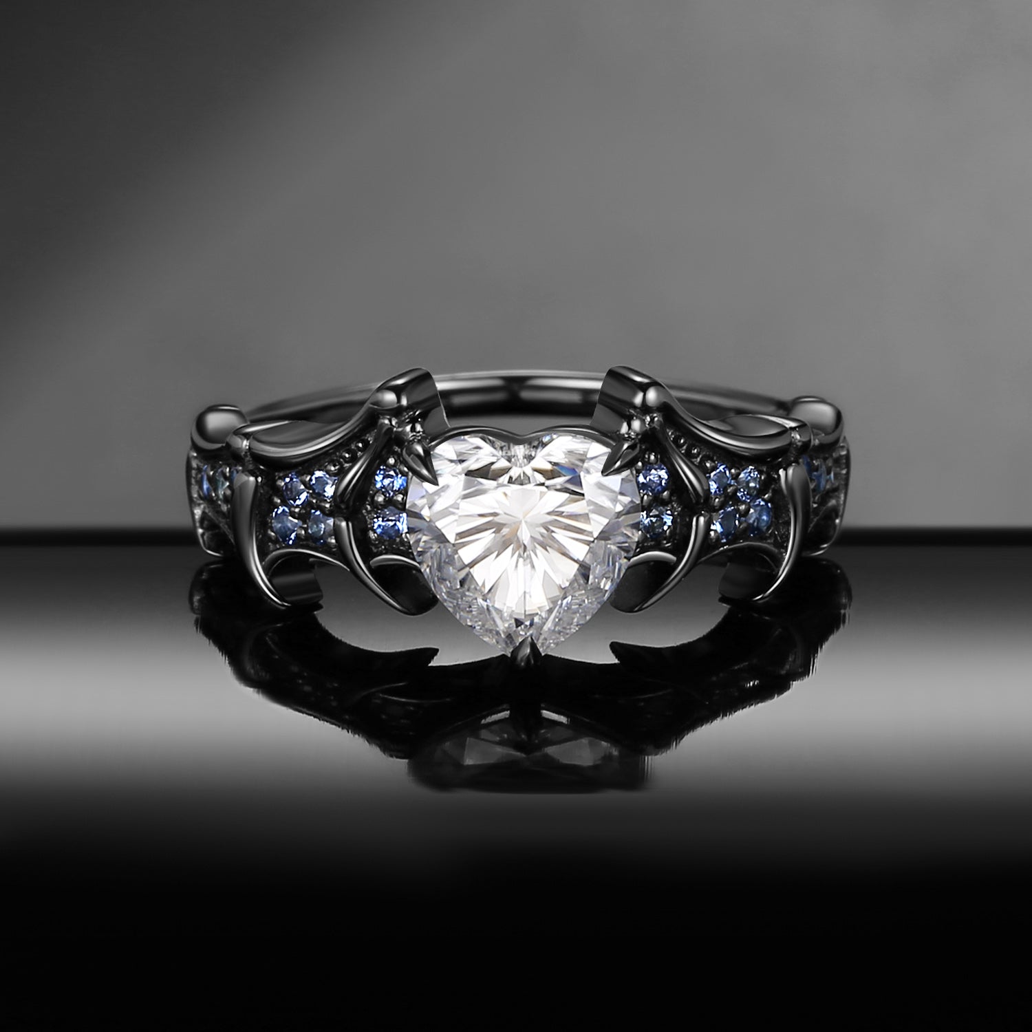Heart Shaped Moissanite Gothic Inspired Black Gold Engagement Ring - Bat Ring