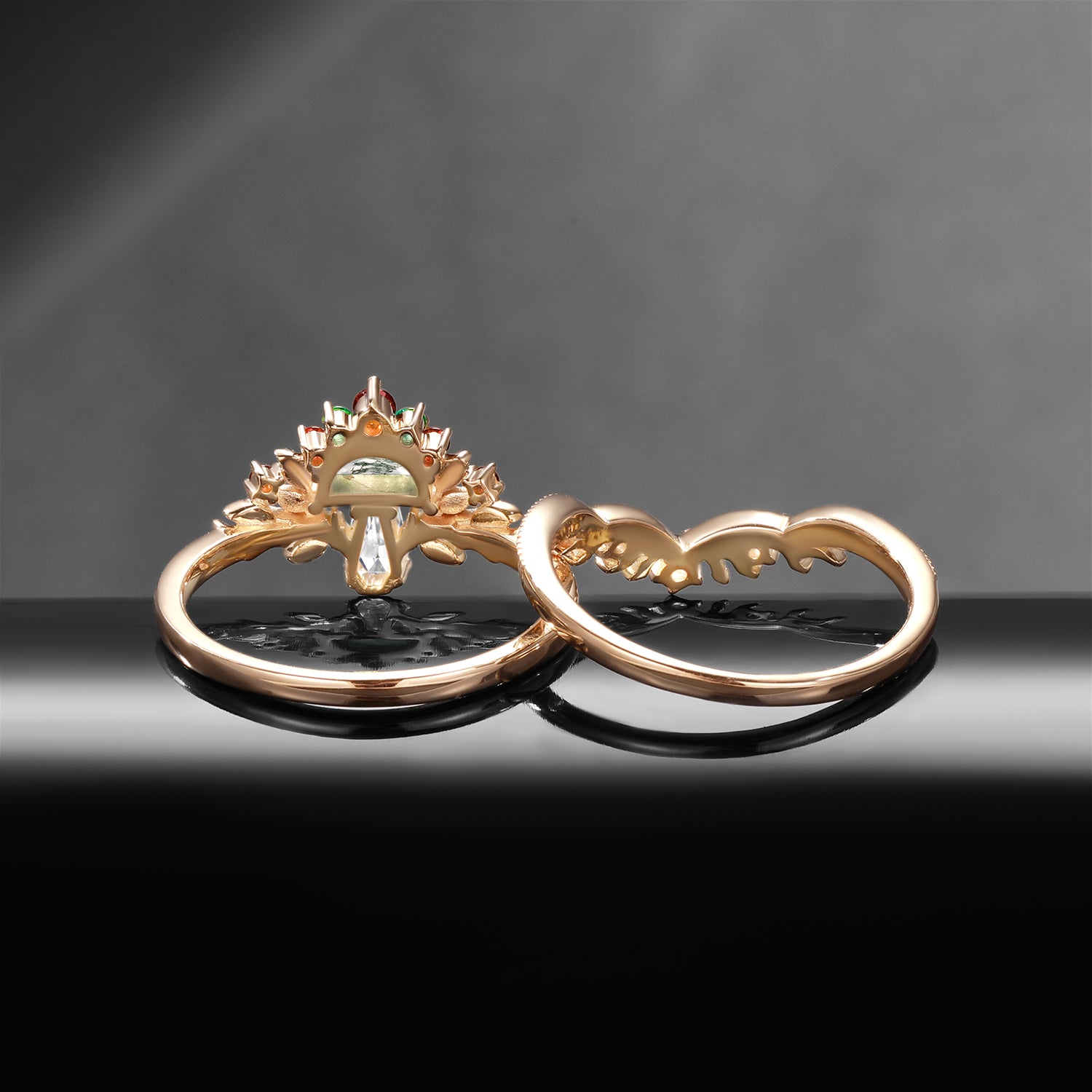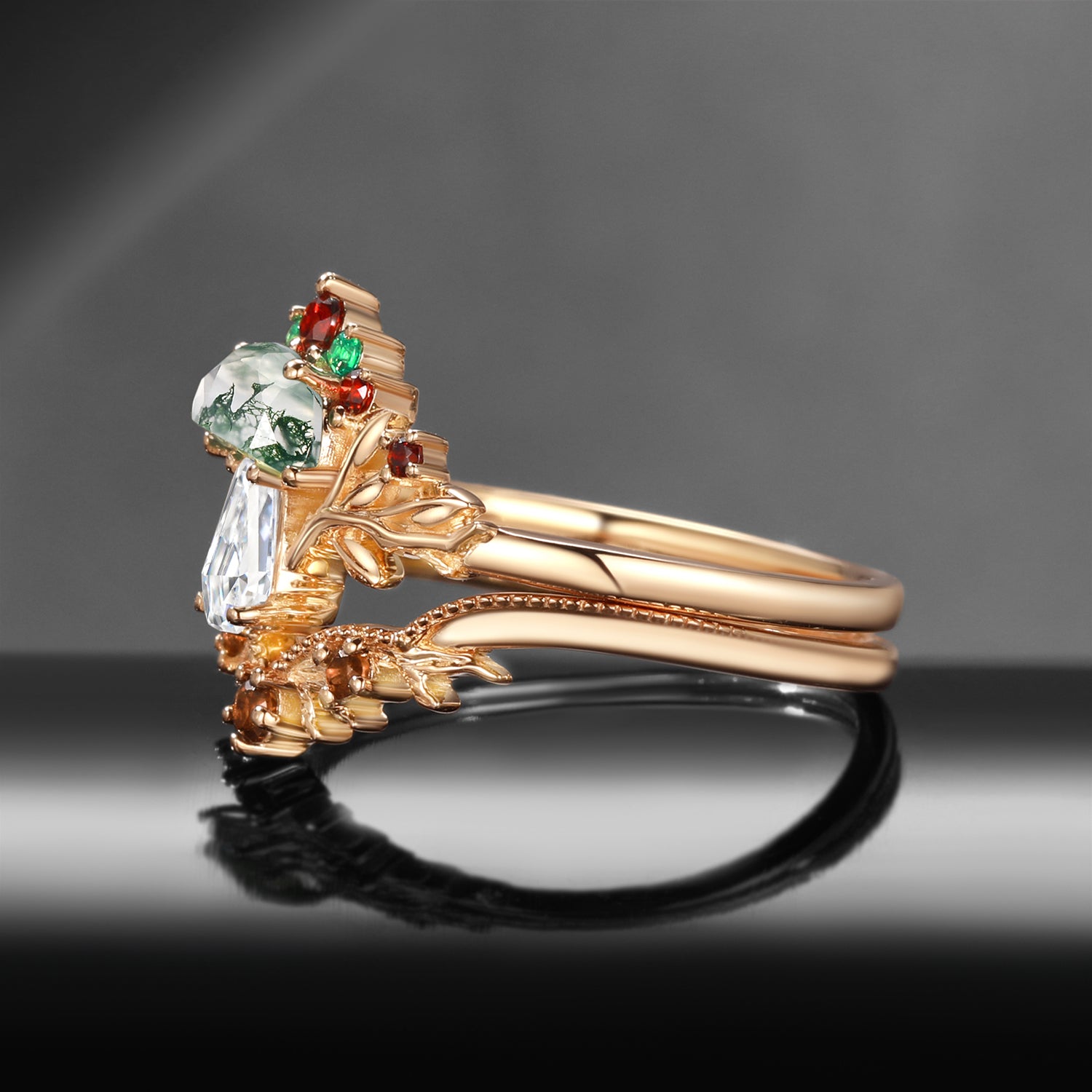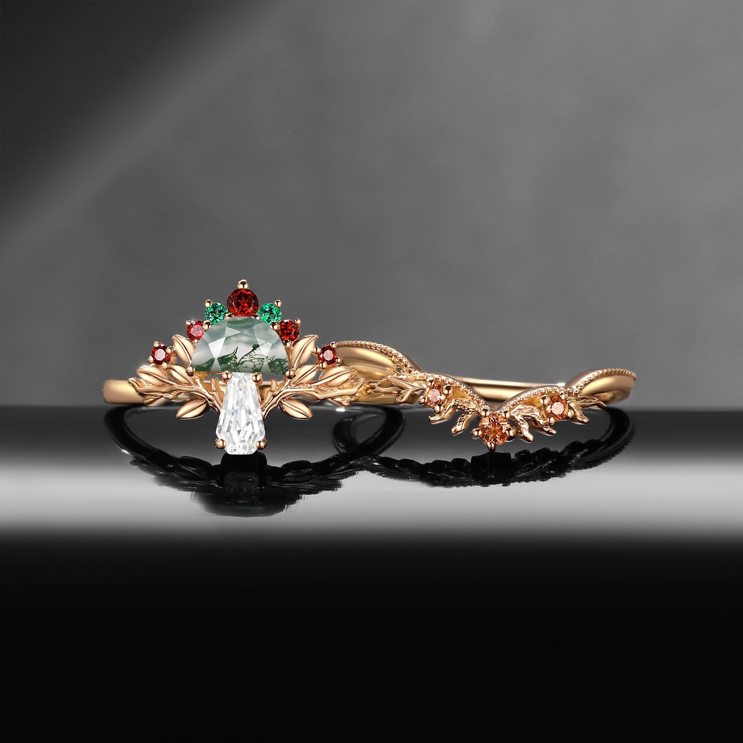Nature Inspired Gothic Tree Half Moon Moss Agate + Coffin Moissanite Mushroom Engagement Ring Set 2pcs - 'Tree of Life' Garden of Eden
